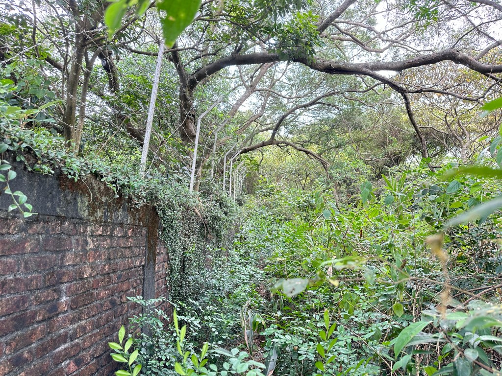 此時,由地圖上來看,離鳳岩山還約有200m到300m的距離,一開始由永安宮右側進入,進入到墓地且找不到路徑,接著改由永安宮左側進入,有路徑,但陡上到一半,路徑都超陡滑!每一步伐都難以穩定站好,好不容易陡上到稜線上,稜線上有一道紅磚的萬里長城圍牆。往右沿著圍牆陡上走約200m,看到了山頂上的廢棄碉堡,就表示鳳岩山,到了!
