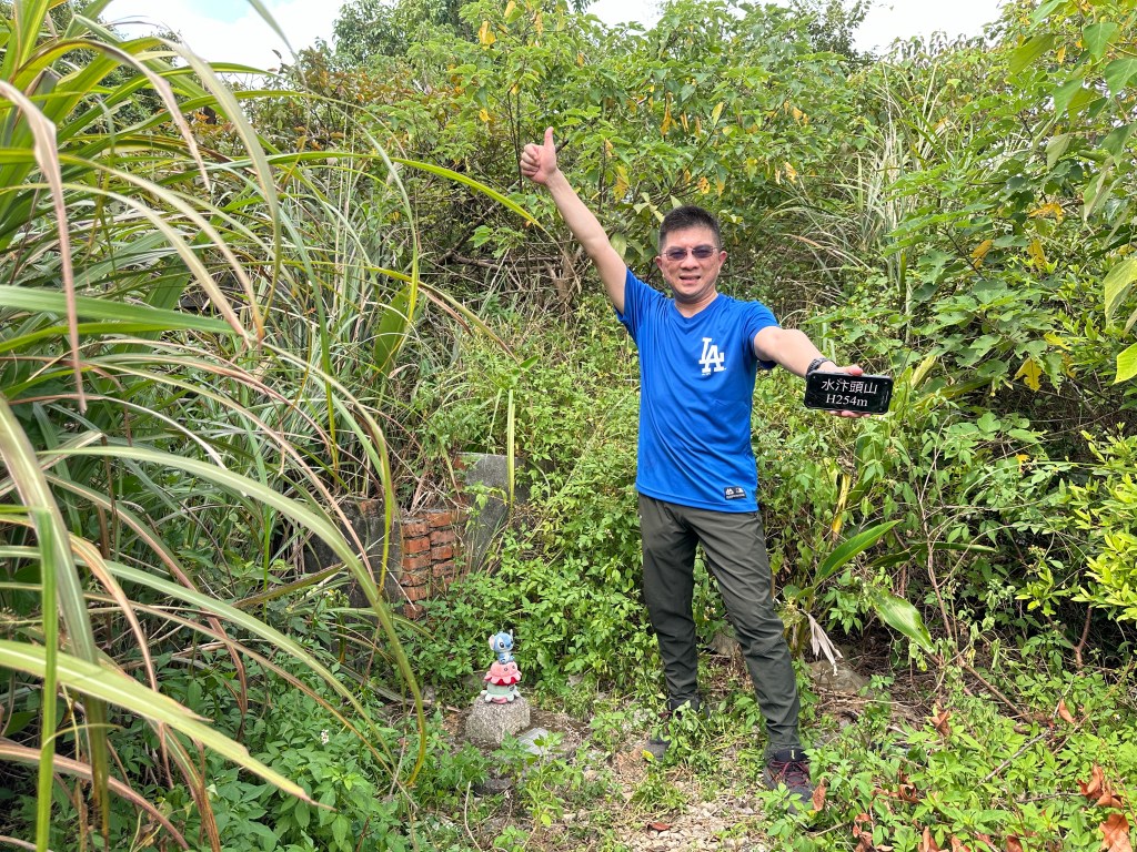 鳳岩山這裡,小黑蚊超多,Sonia拍完照,一刻不想留!跟著Tony、阿志沿著圍牆稜線路線很快走出,Smile與我拍完照後,繼續沿著圍牆走700m走出來到桃11線8.1K處,這裡是水汴頭山涼亭,而三角點就在旁邊。此時,我們正在拍照時,正有一對男女「騎」著摩托車過來,也正要來水汴頭山來拍三角點,並告訴我們,他們兩人今天已經「走」了14連峰!蝦毀?這樣也算得上14連峰?哈!不行,我忍不住一定要笑一下,哈哈!