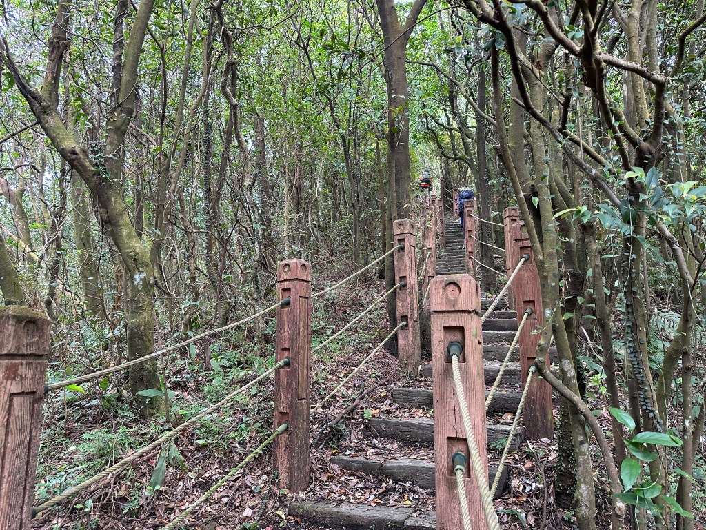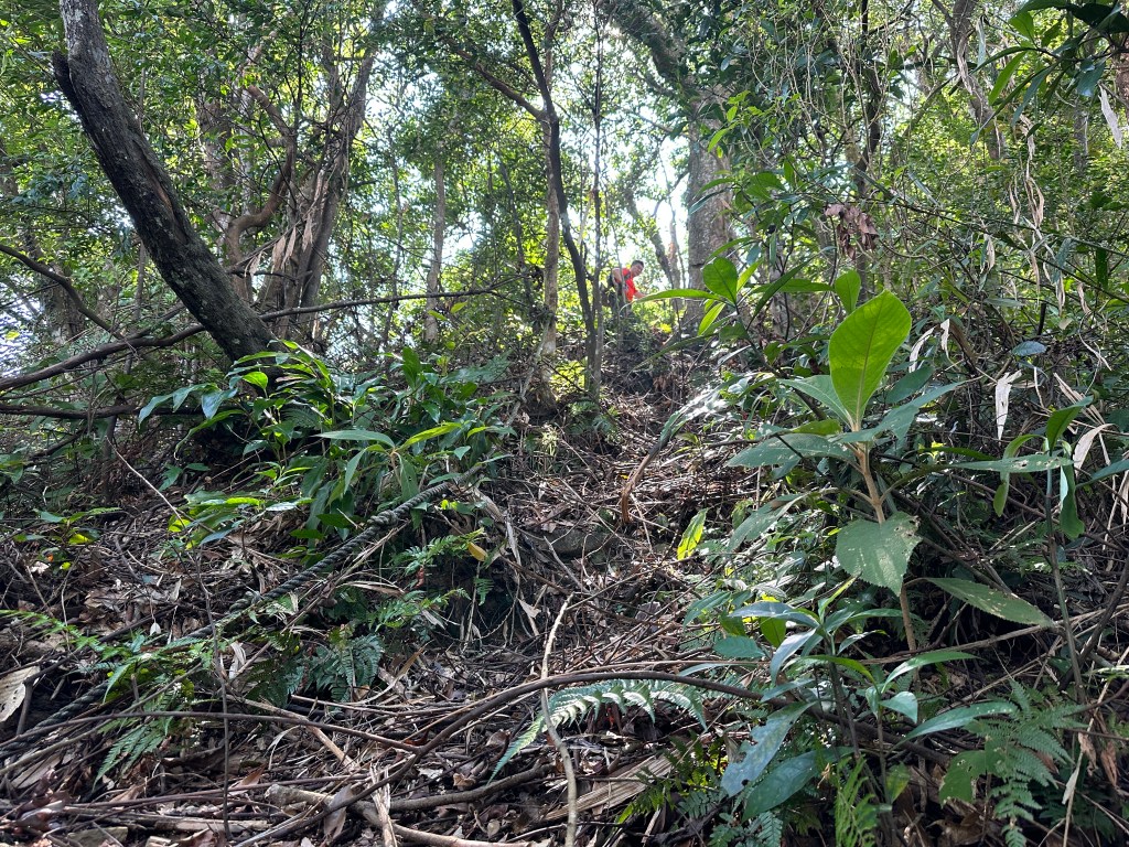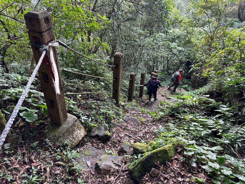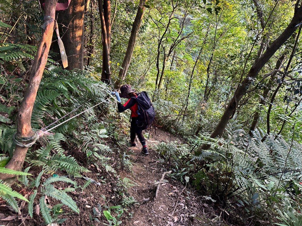 一起登的這200m的距離,就已經是小魔王的路徑,一直在貫穿蜿蜒的廢農路,但這貫穿的路徑總讓人覺得就是硬闖而上而開的路線,花了一些時間才走到H361m的林道盡頭!接下來,路徑不是很陡就是植披很厚,要登頂前200m開始,進入到70、80度的岩壁陡上區,要在不到100m的距離直接陡上有50m的高度,還好,一路有繩索還有護網維護,如果沒有這些護網,走起來會更驚險刺激且有危險!