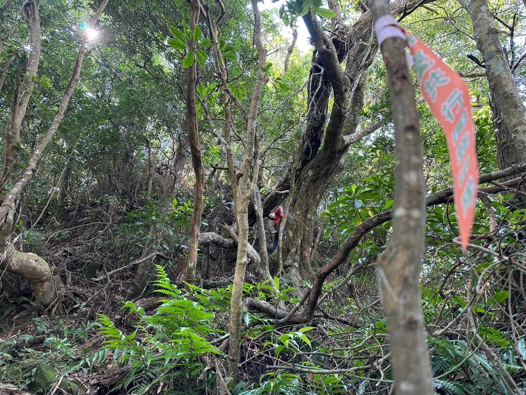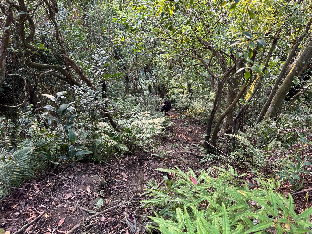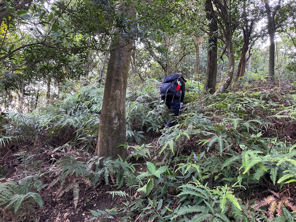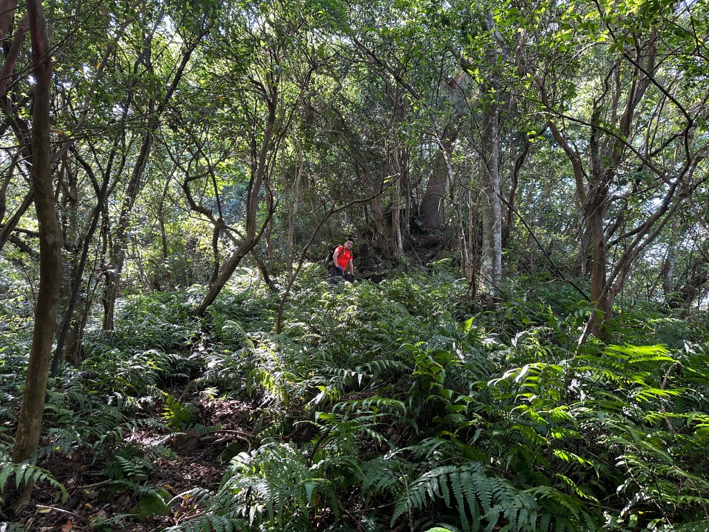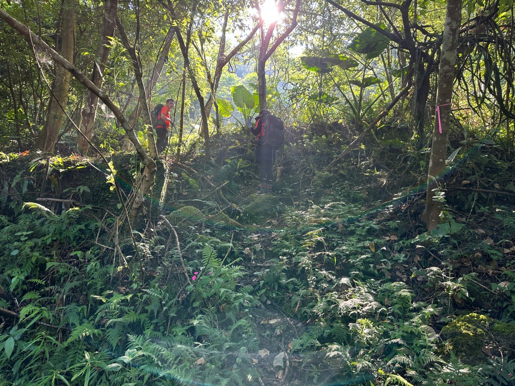 一起登的這200m的距離,就已經是小魔王的路徑,一直在貫穿蜿蜒的廢農路,但這貫穿的路徑總讓人覺得就是硬闖而上而開的路線,花了一些時間才走到H361m的林道盡頭!接下來,路徑不是很陡就是植披很厚,要登頂前200m開始,進入到70、80度的岩壁陡上區,要在不到100m的距離直接陡上有50m的高度,還好,一路有繩索還有護網維護,如果沒有這些護網,走起來會更驚險刺激且有危險!