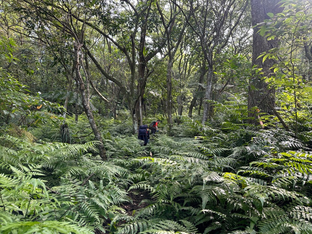 土地公一定有聽到我們的祈禱,沒有下雨,但一路悶熱,由大丘田山到十七寮山之間的距離有2.2K。先由大丘田山回走50m到岔路,開始右轉而下,一直在幻想,這一條路線應該是一堆難搞的拉繩吧?沒有想到,除了一開始陡下走在一小段的瘦稜外,接著通過三張石椅區後,一路的路徑都超優質且緩緩而下,緩到Sonia跟我都覺得可不可以陡下角度大一些?
