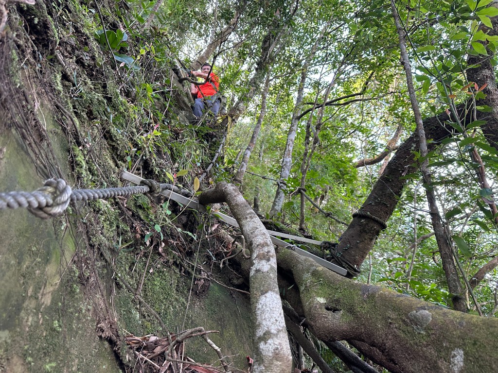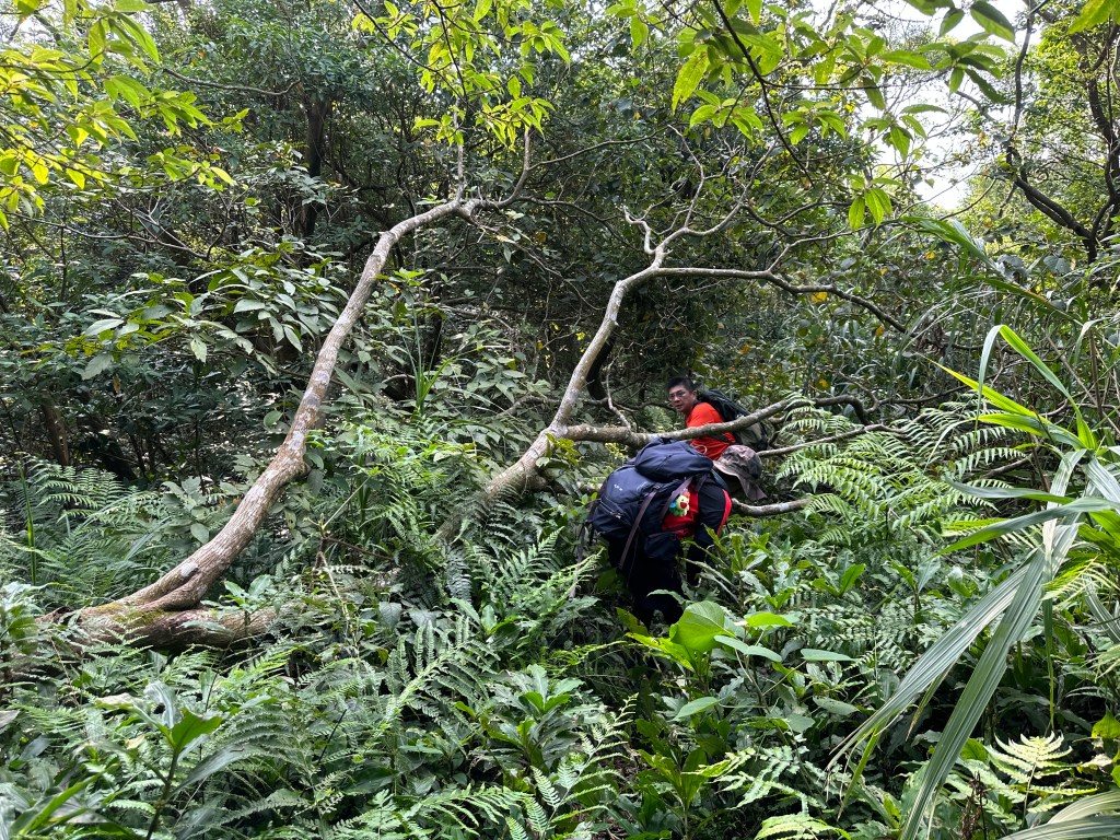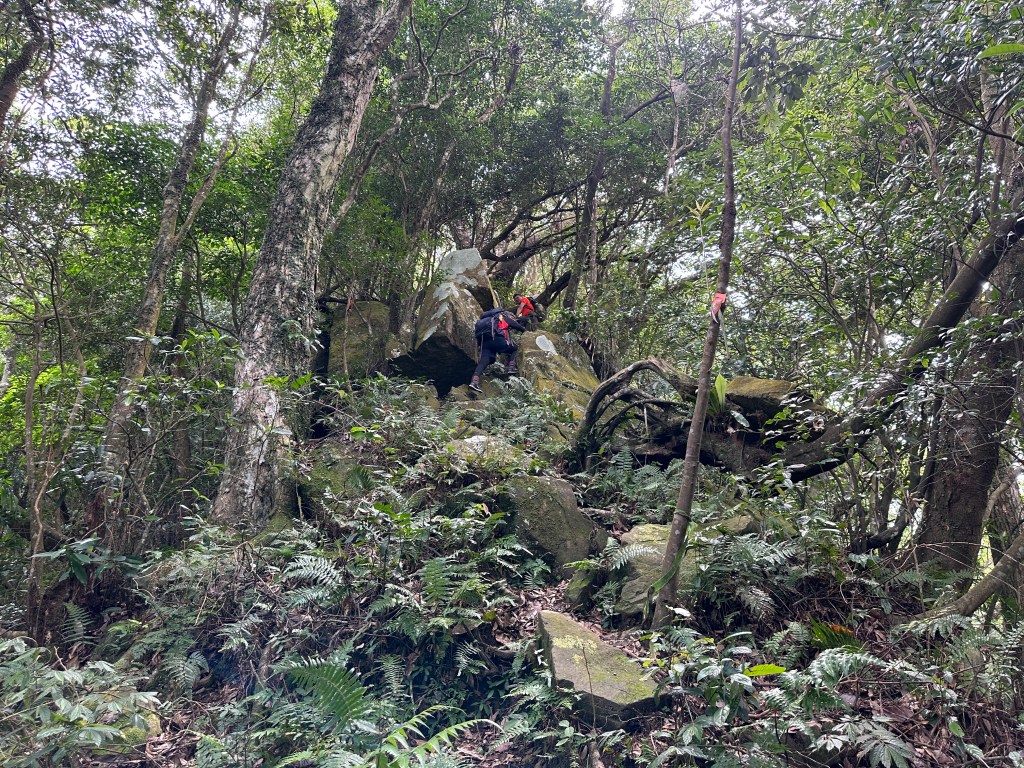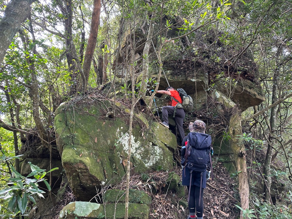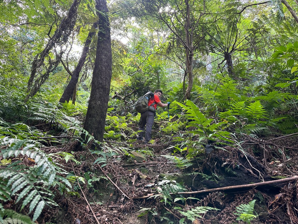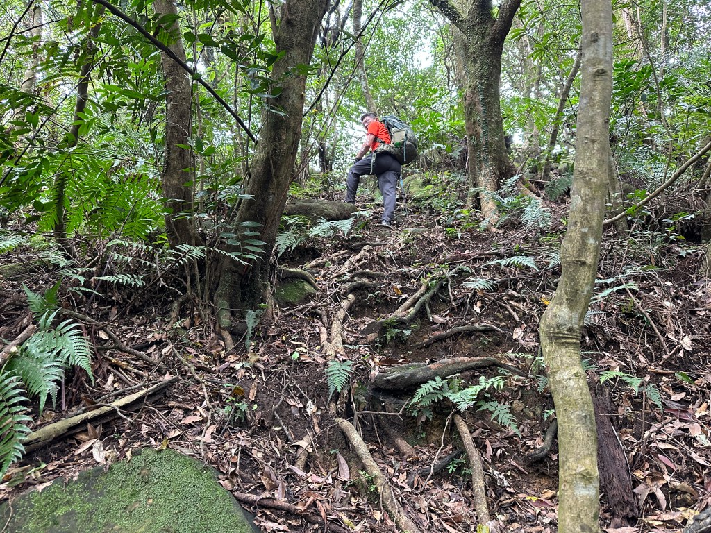 鮮少人走潮濕陡滑、登頂前垂直岩壁直接陡上50m