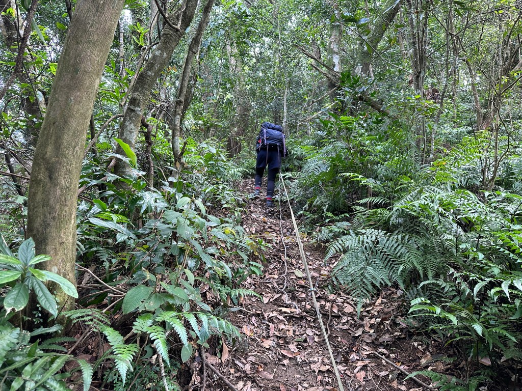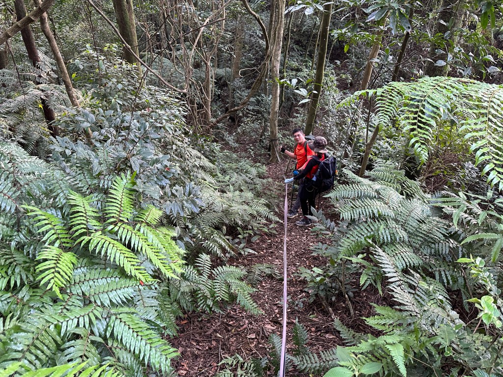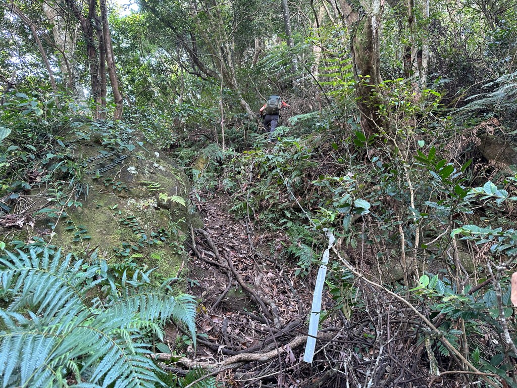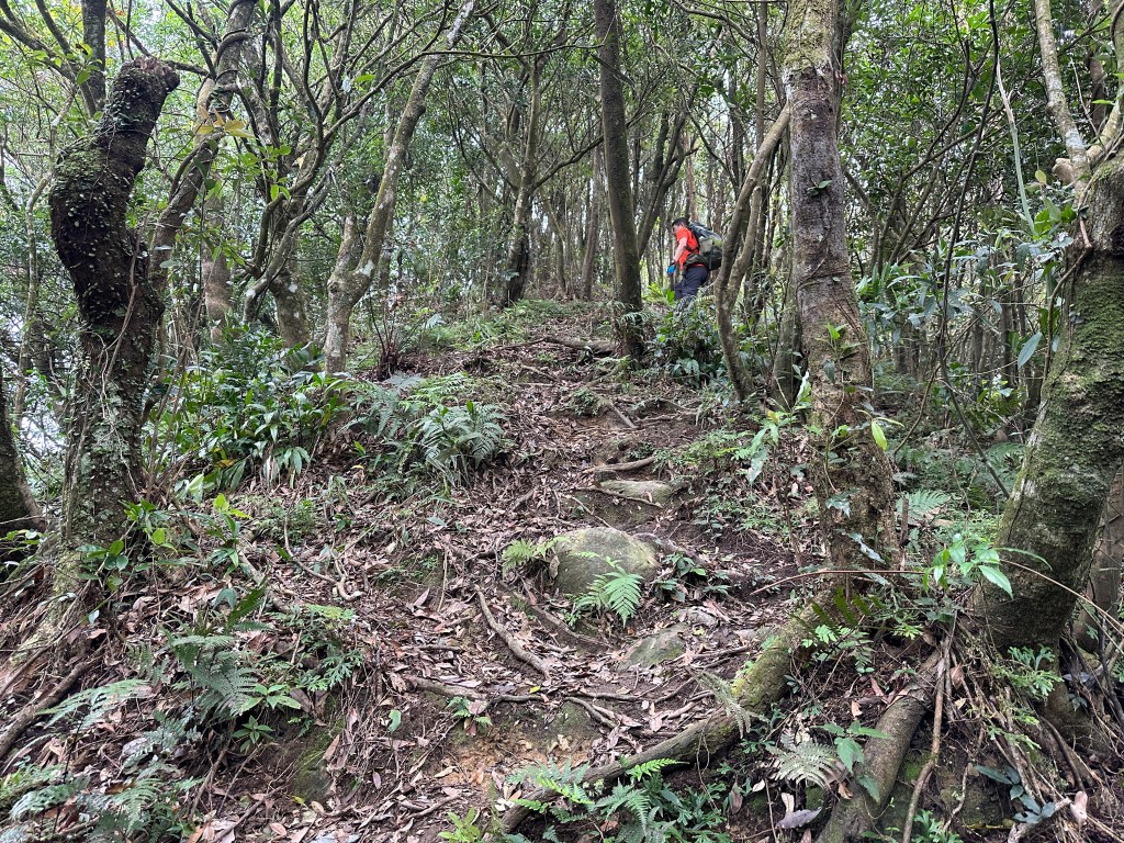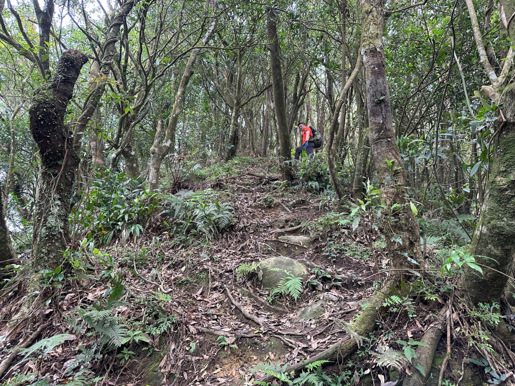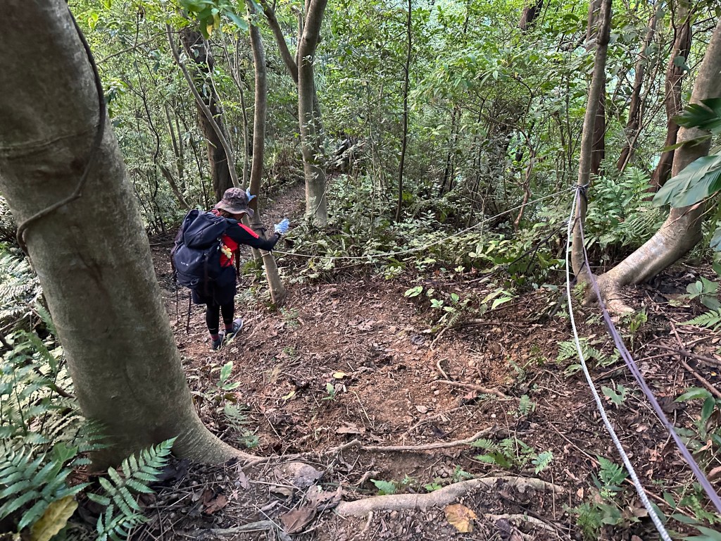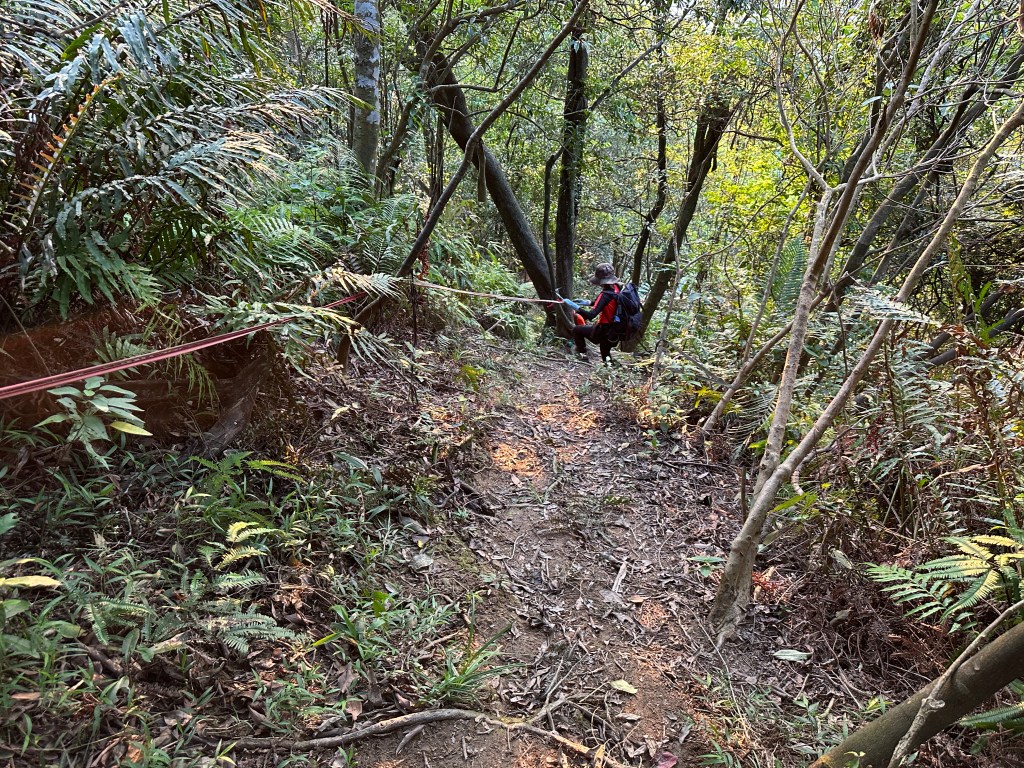 因為緩緩而下,不就表示要走很長才能抵達下一峰?走了1.8K後路徑中出現一個大倒木,跨越後往前的路徑仍然清晰明確,恰好,此時我的手機電力偏低,因此,就稍微疏忽沒有對一下GPX?直接跨過倒木,路徑看來寬大,再往前一小段,就是直接拉繩陡下,陡下後,我一直覺得不太對勁?因為接下來都沒有看到布條?GPX一對照!走錯了!走了有200m之遠!