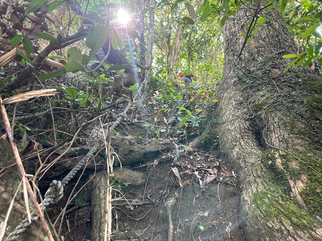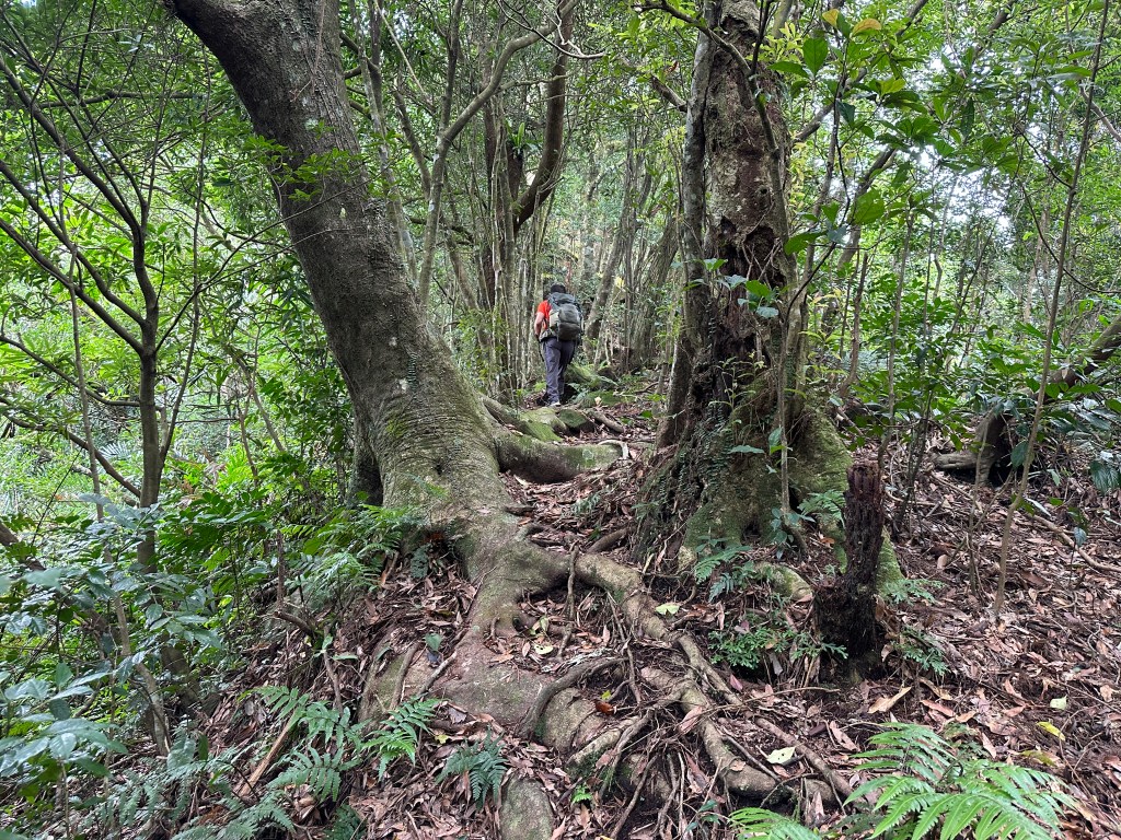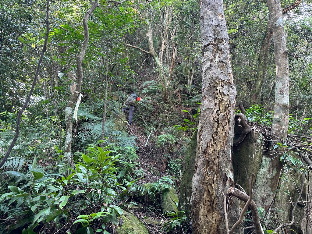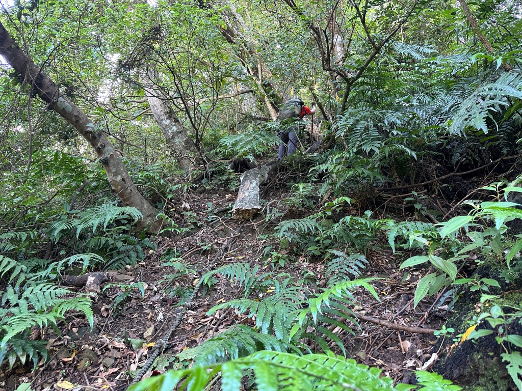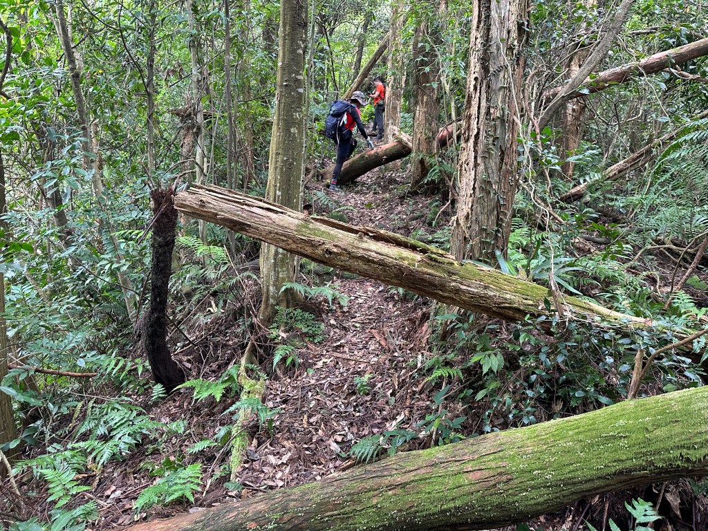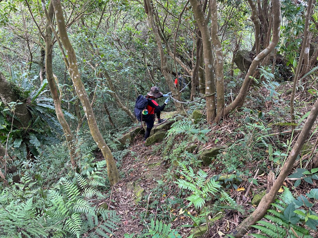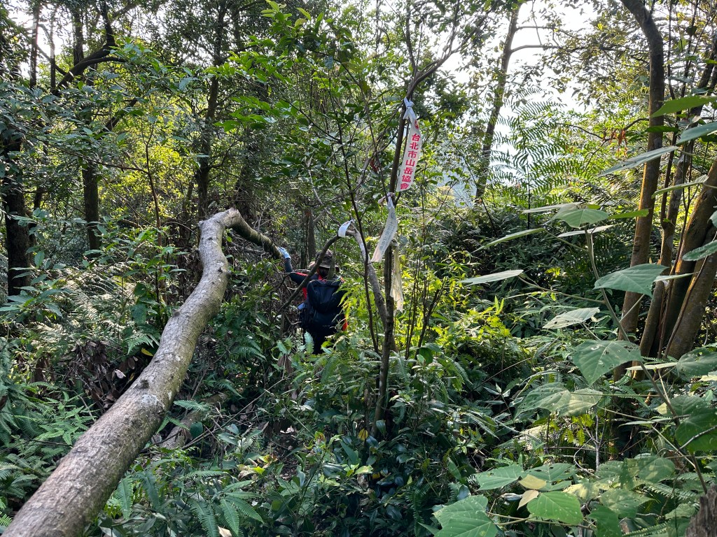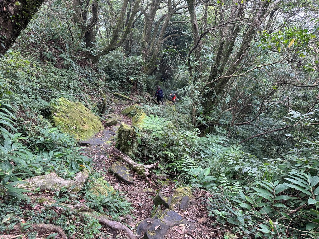 因為緩緩而下,不就表示要走很長才能抵達下一峰?走了1.8K後路徑中出現一個大倒木,跨越後往前的路徑仍然清晰明確,恰好,此時我的手機電力偏低,因此,就稍微疏忽沒有對一下GPX?直接跨過倒木,路徑看來寬大,再往前一小段,就是直接拉繩陡下,陡下後,我一直覺得不太對勁?因為接下來都沒有看到布條?GPX一對照!走錯了!走了有200m之遠!