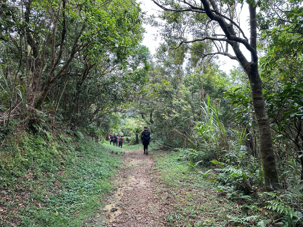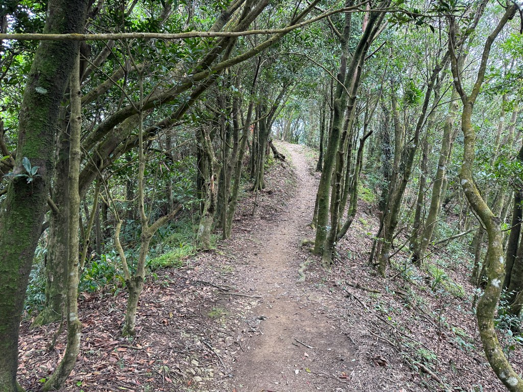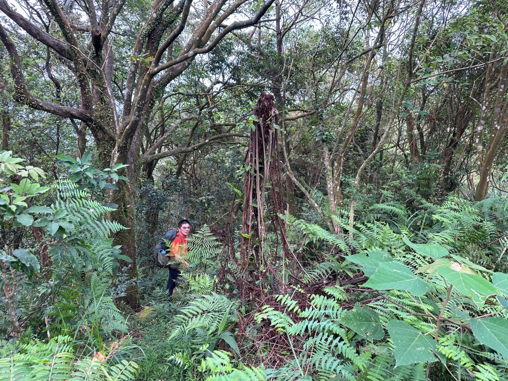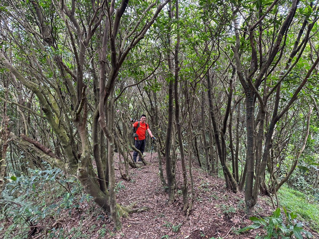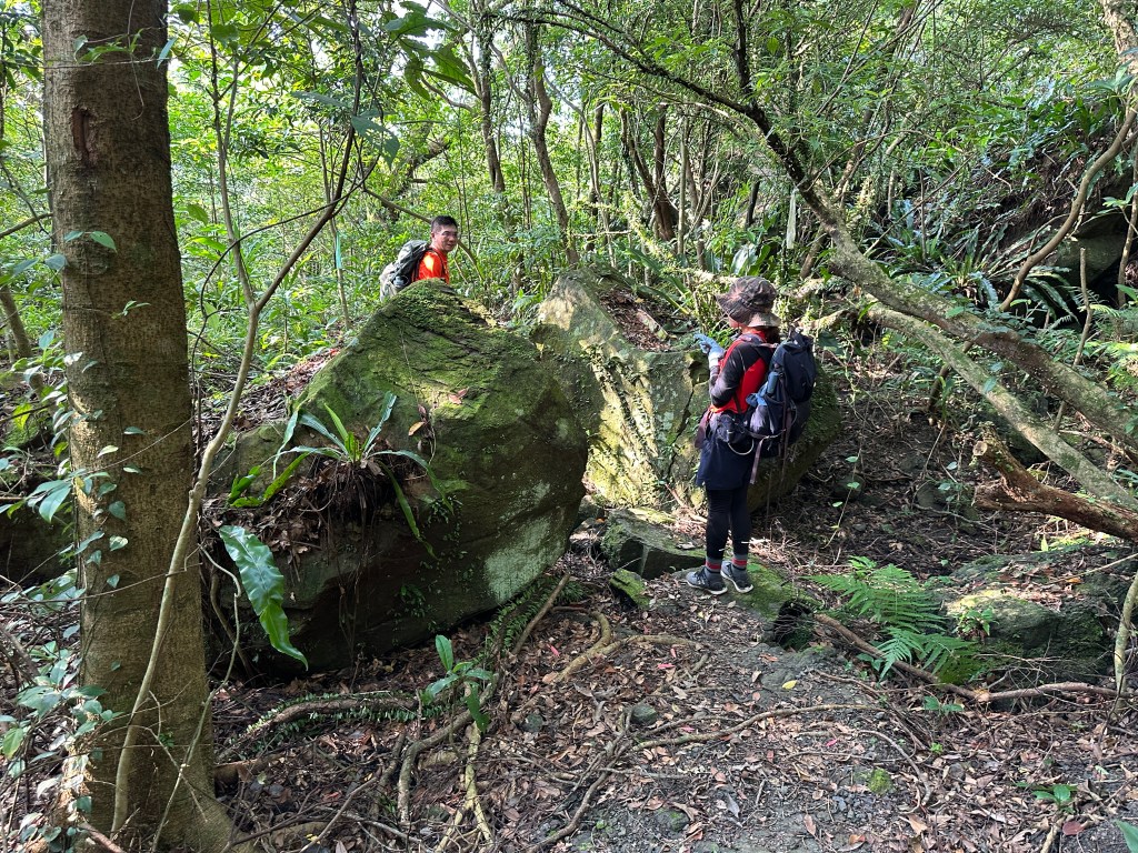 這一段的距離有1.9K。先走0.8K經過大土匪洞,出獅尾登山口,即刻往左前方再次進入山徑裡,此時已經是下午2點!看著天空上滿佈的黑雲,總感覺,隨時會來一場雷雨交加的淋浴?
