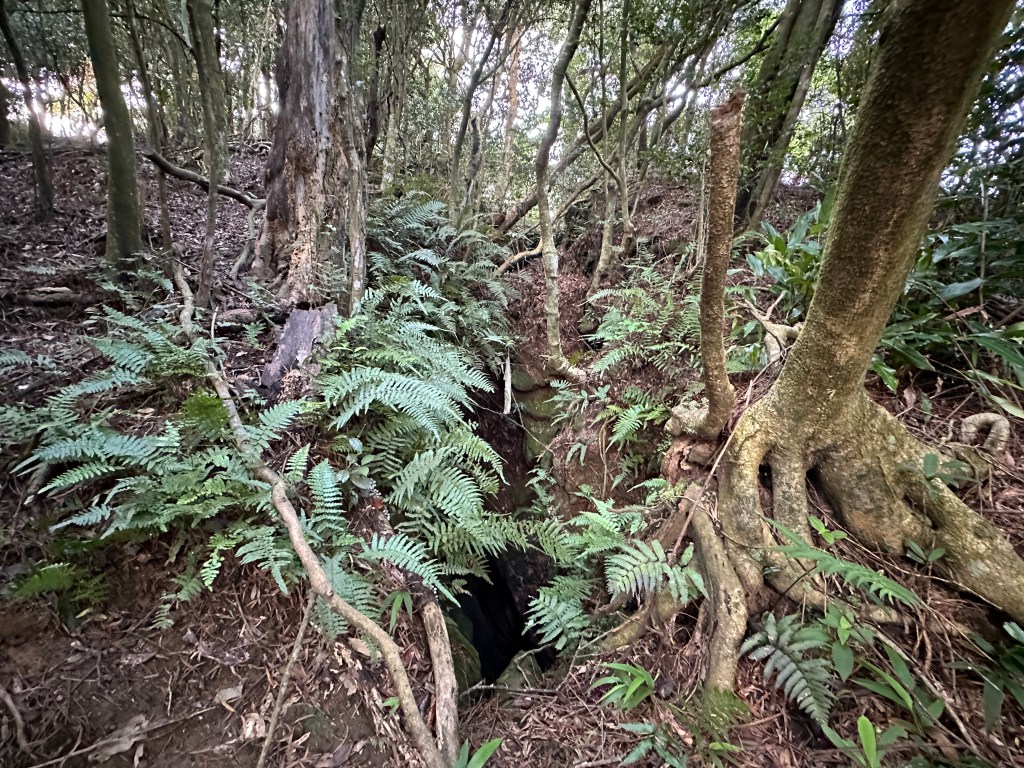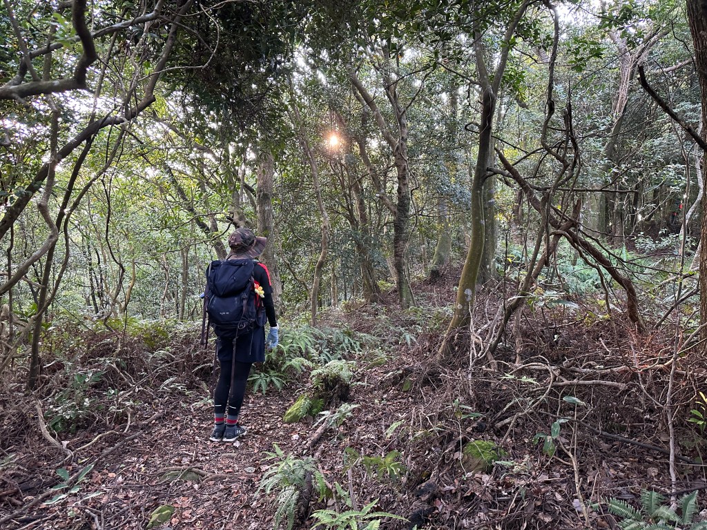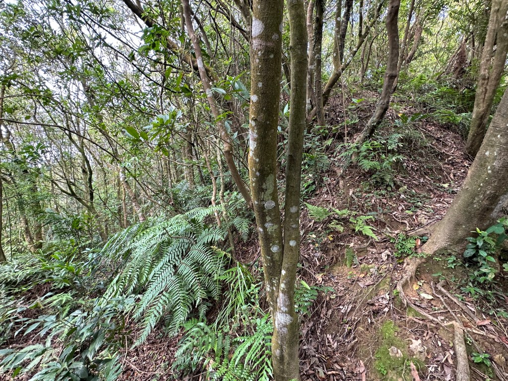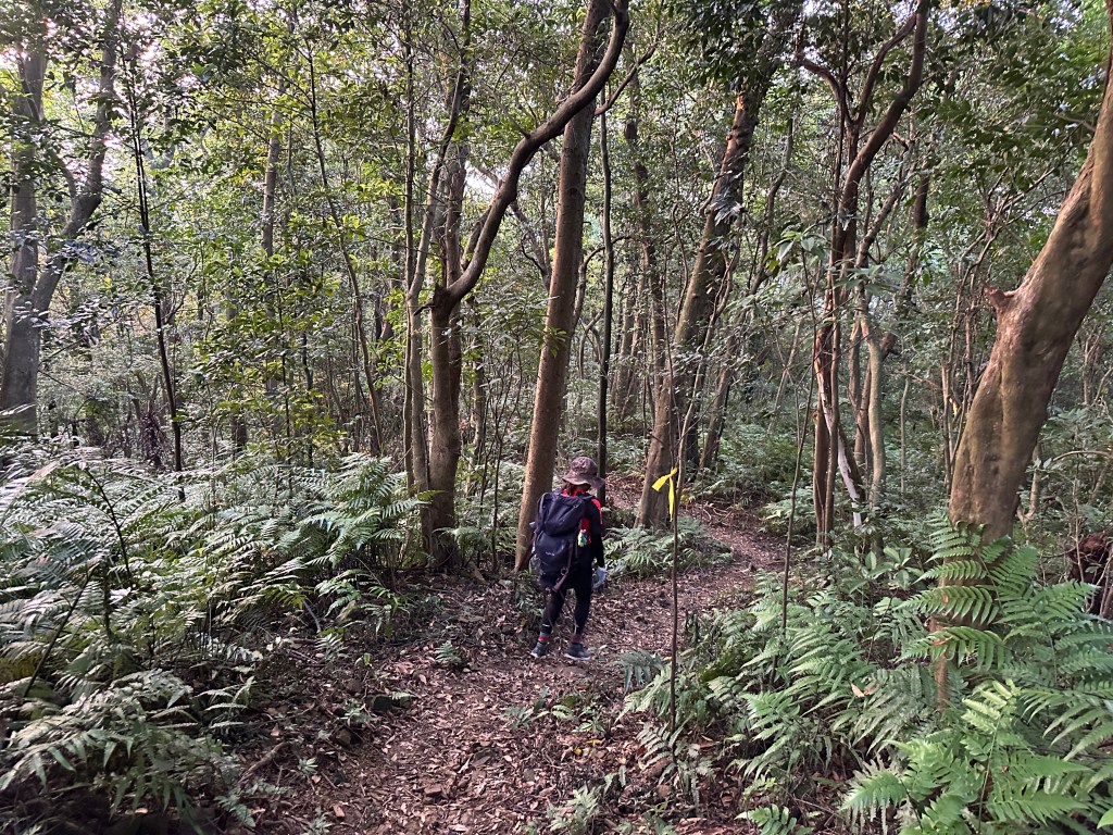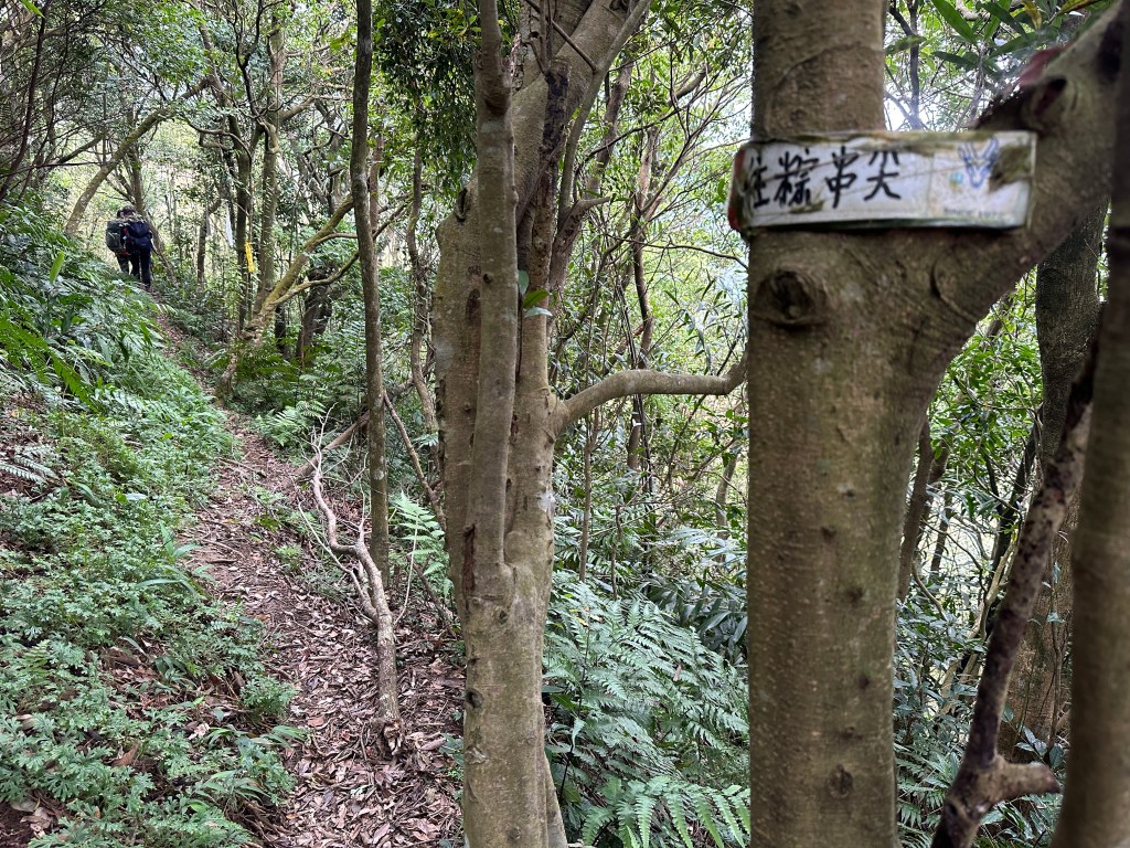 這一段的距離有1.9K。先走0.8K經過大土匪洞,出獅尾登山口,即刻往左前方再次進入山徑裡,此時已經是下午2點!看著天空上滿佈的黑雲,總感覺,隨時會來一場雷雨交加的淋浴?