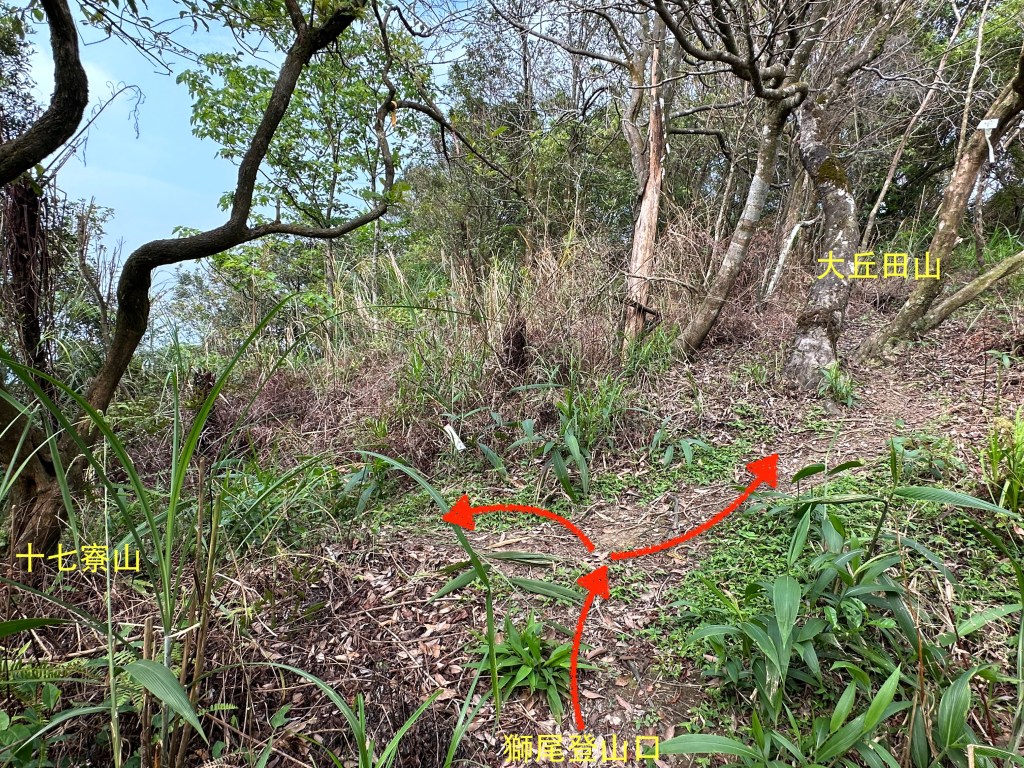就直接往上拉繩而上,有四段坡度只有第一段有繩索,越往上的角度就越小,越往上的路徑也越好,一直到大丘田山,抵達三角點前約50m左側有岔路,這就是等會要往十七寮山走的路線,站在大丘田山三角點,可回看到後方高聳蠻遠的獅仔頭山!