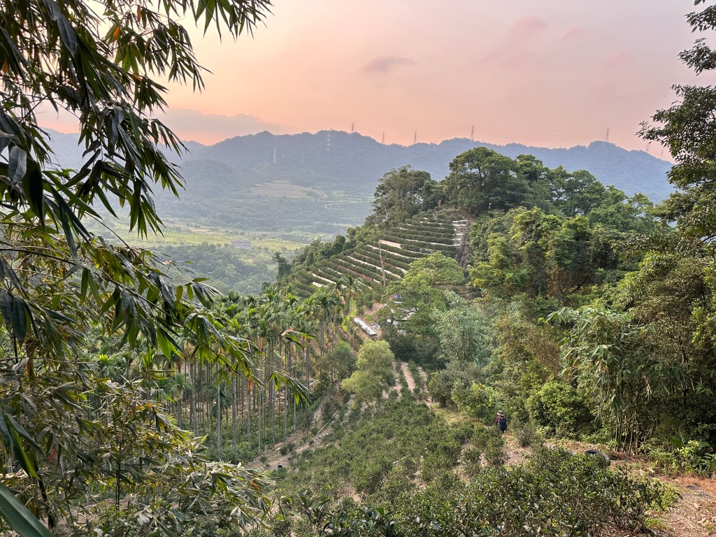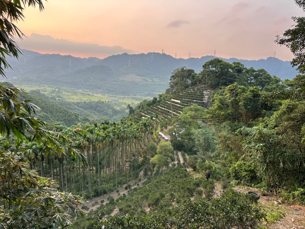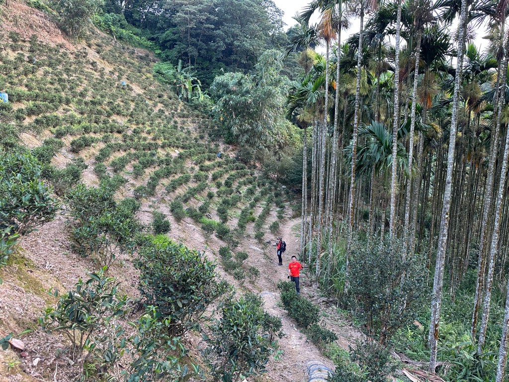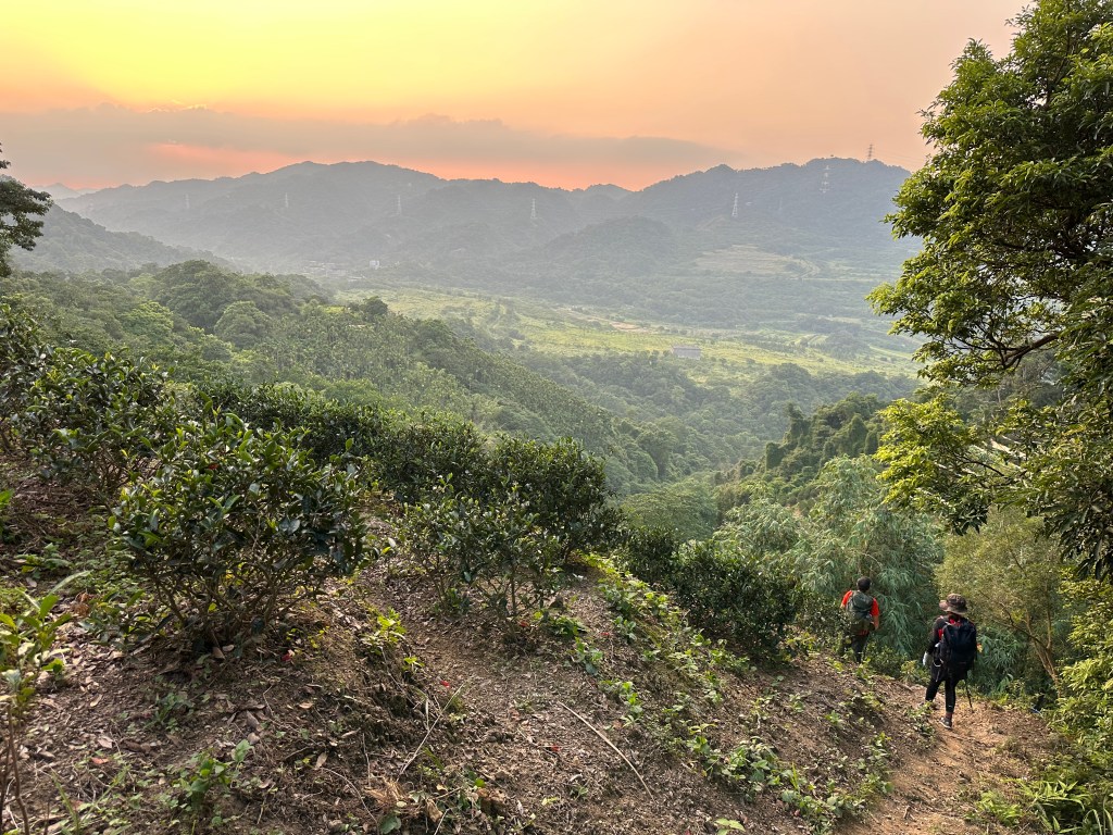 由十七寮山到土地公登山口的距離有1.2K,而由土地公登山口回到圓化寺的距離有2.8K的馬路要踢。離開十七寮山後的路徑也是屬於優質路徑,只是相對陡下角度比較大了一些,離土地公登山口還有600m時,一眼就看到環繞的優美茶園!以及遠方中和到土城的天上山稜線!