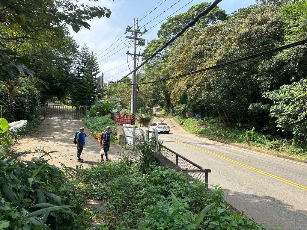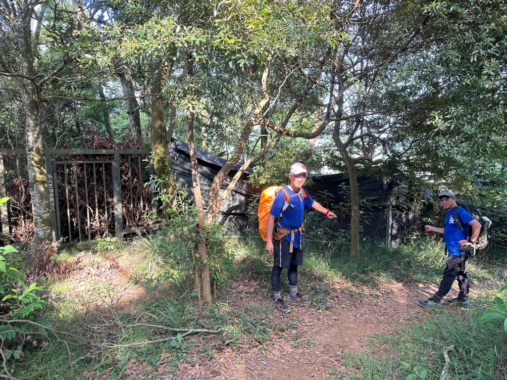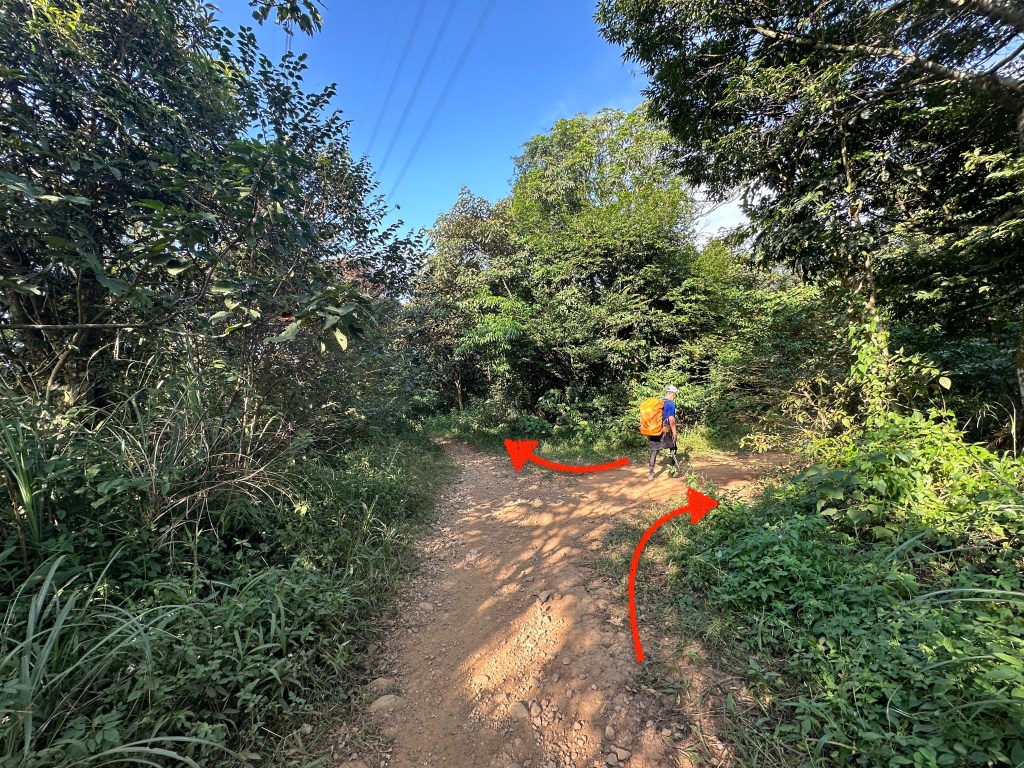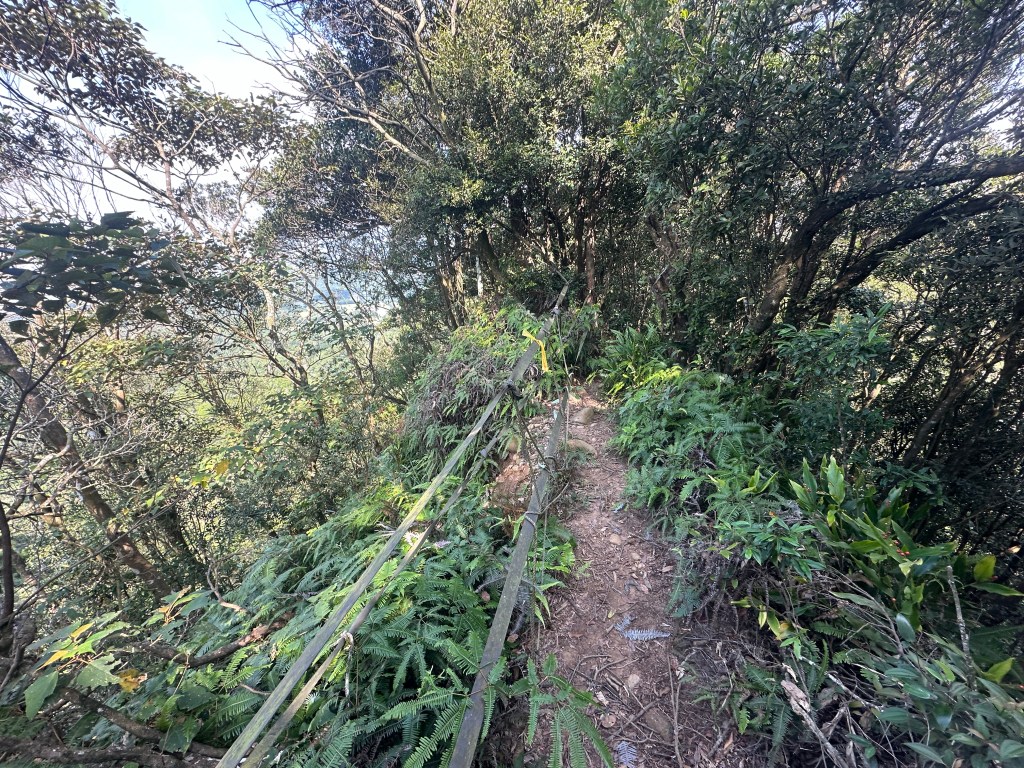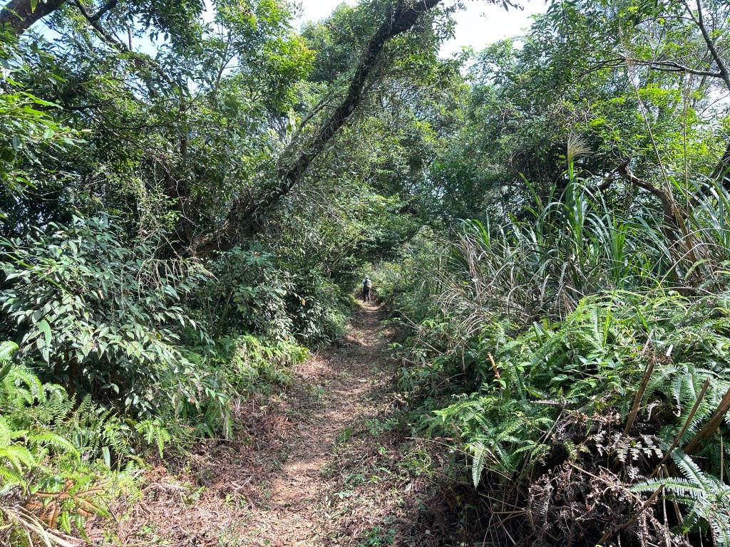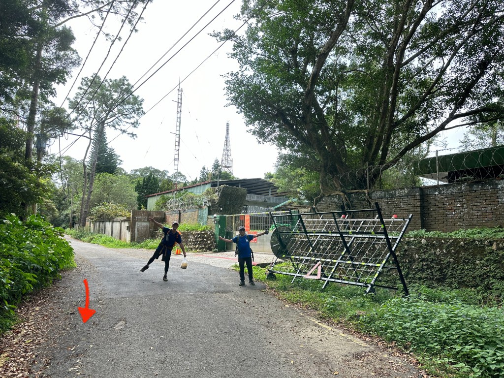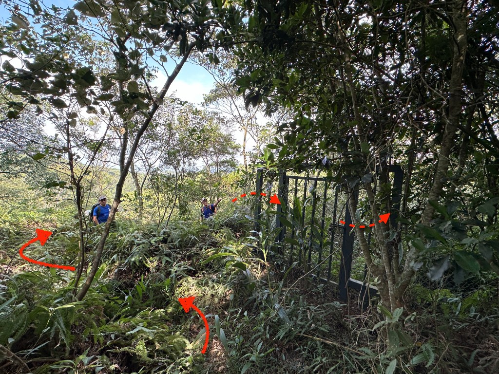 這一次來三通嶺,發現路徑上的雜草比起之前我們來時長了不少!三人在這裡的山友亭休息了一會,先回走200m,回到十字路口,開始左轉沿著新開發的社區車道走約900m到底,看到一排的聖誕樹!由聖誕數之間穿過就會看到聖誕樹後方有一條略微寬大的路徑,由此路徑向右陡下會看到一道鐵門,再往前走有路徑可以繞過鐵門,超過鐵門走100m的雜草叢生路徑,接上四岔路口,向左有兩條路線都可以走。