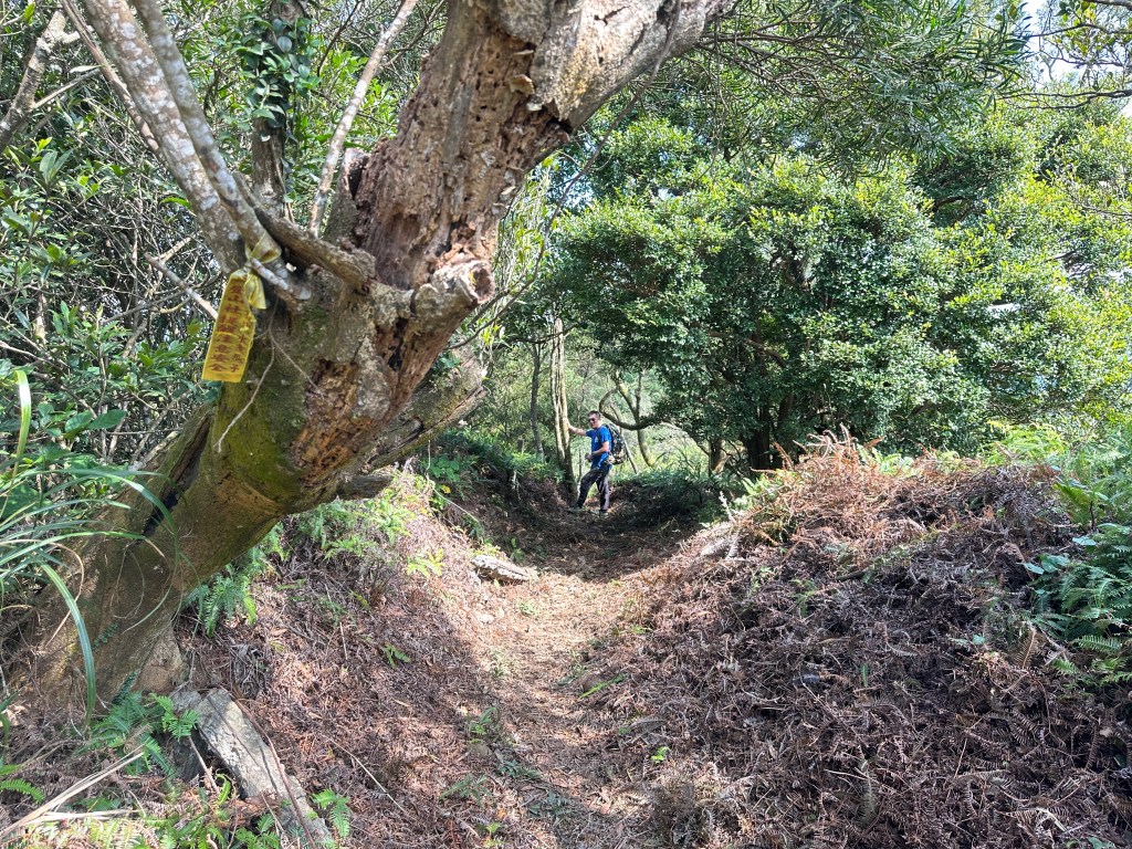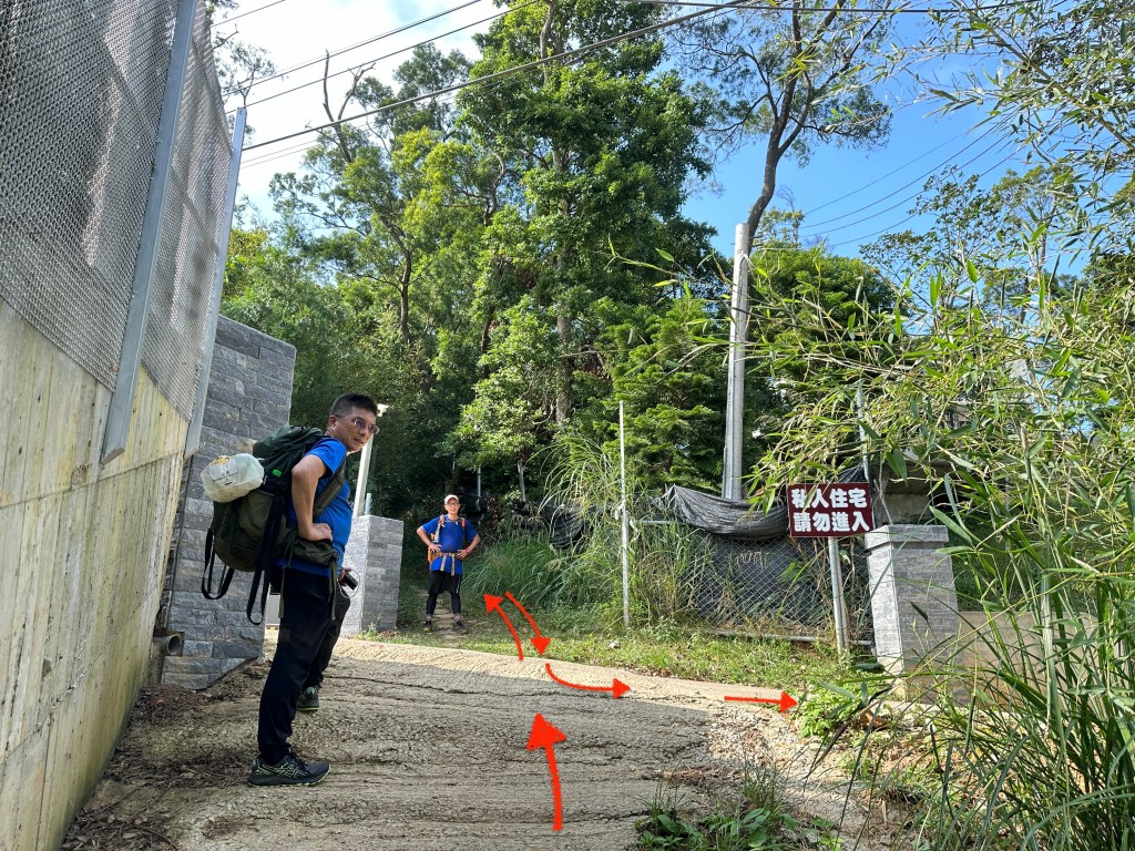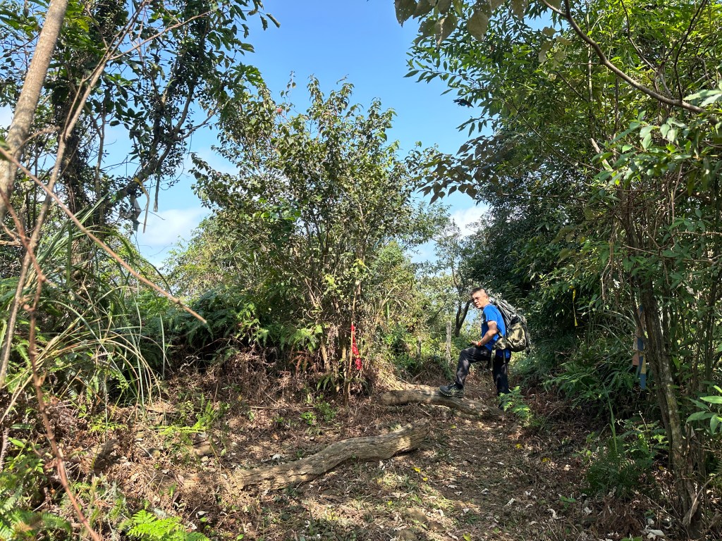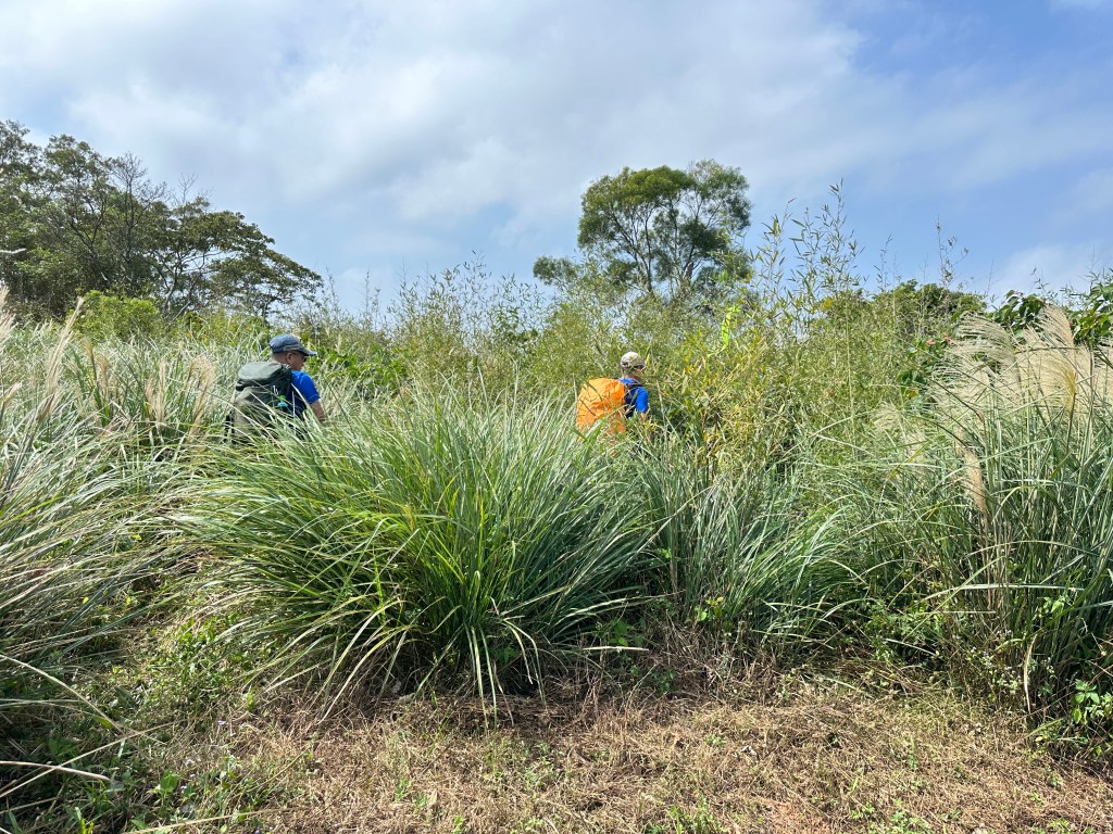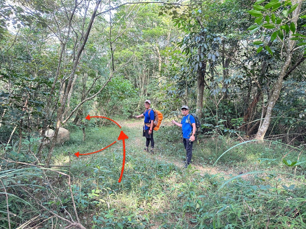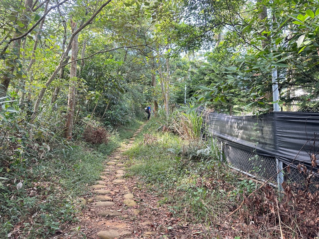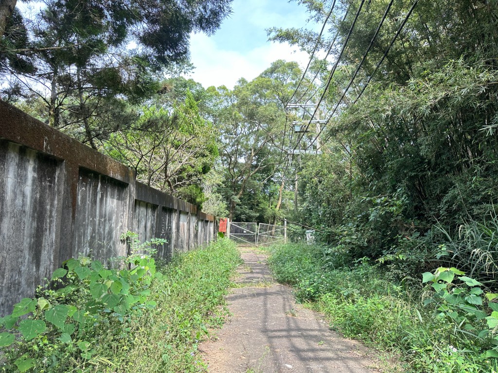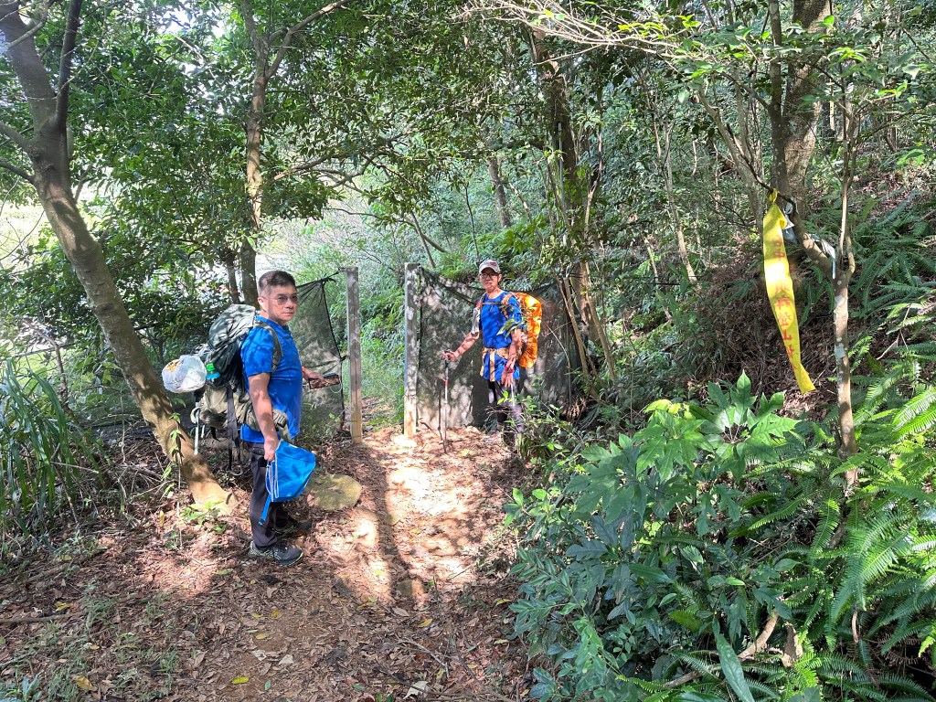 這一次來三通嶺,發現路徑上的雜草比起之前我們來時長了不少!三人在這裡的山友亭休息了一會,先回走200m,回到十字路口,開始左轉沿著新開發的社區車道走約900m到底,看到一排的聖誕樹!由聖誕數之間穿過就會看到聖誕樹後方有一條略微寬大的路徑,由此路徑向右陡下會看到一道鐵門,再往前走有路徑可以繞過鐵門,超過鐵門走100m的雜草叢生路徑,接上四岔路口,向左有兩條路線都可以走。
