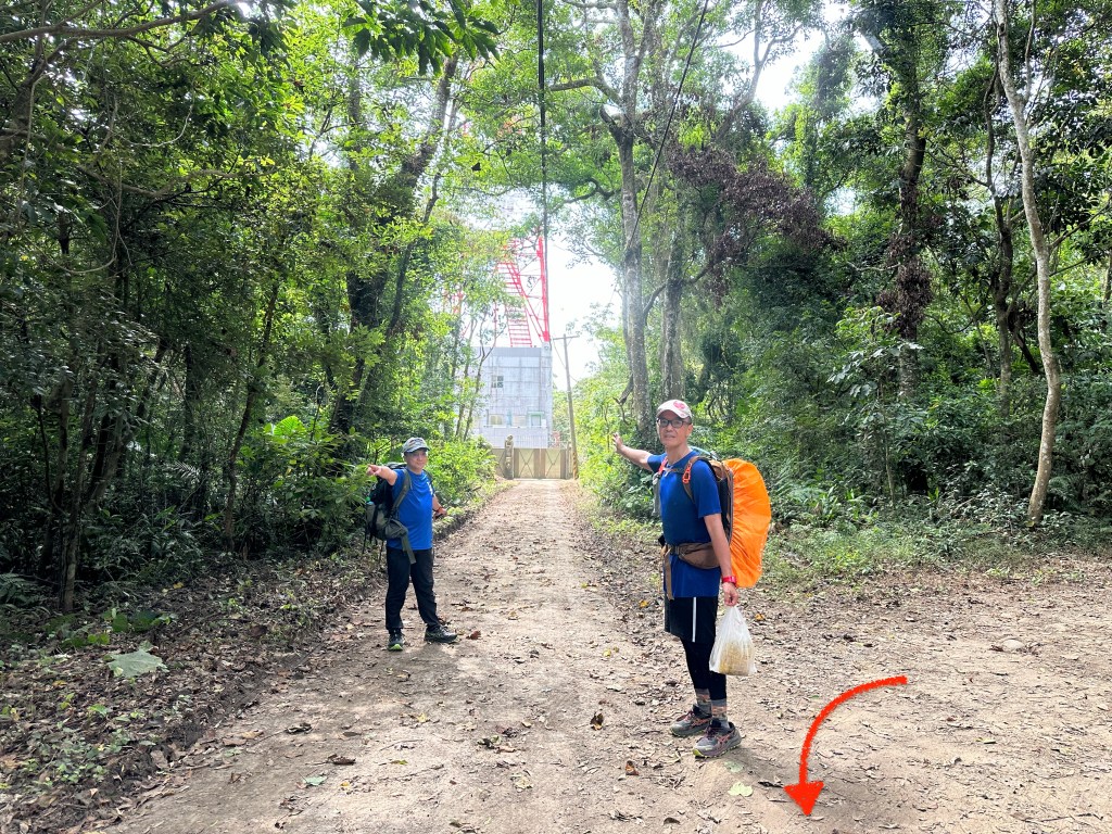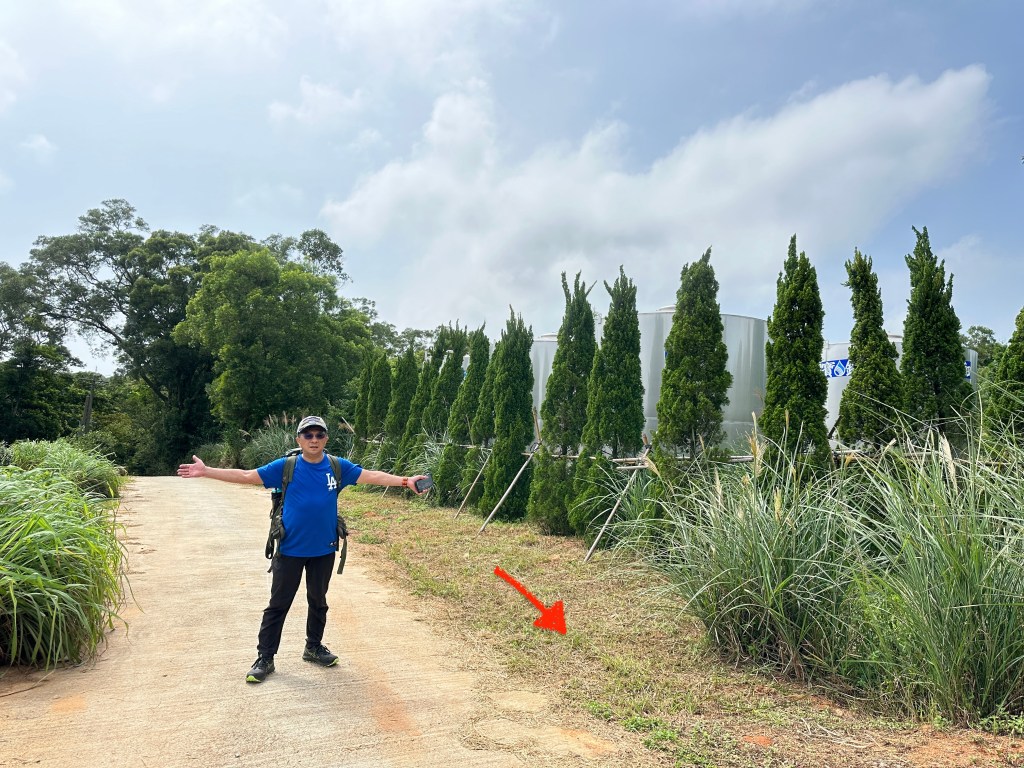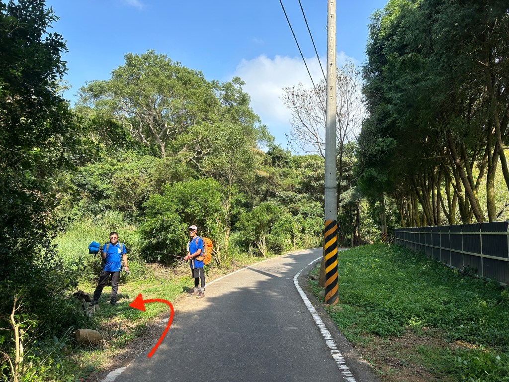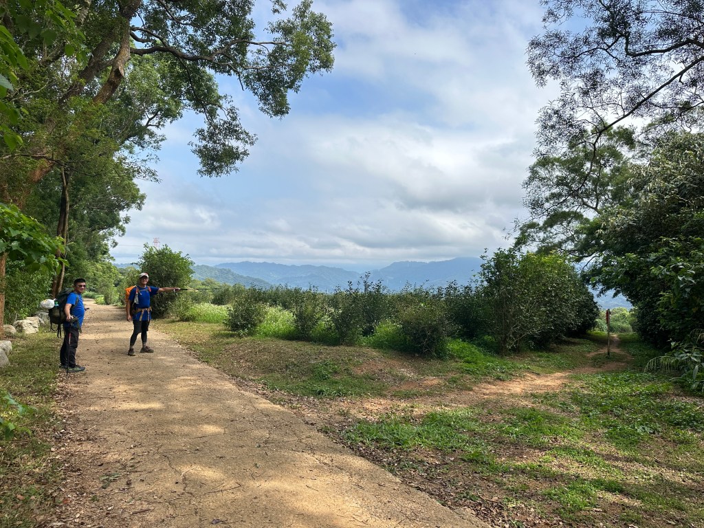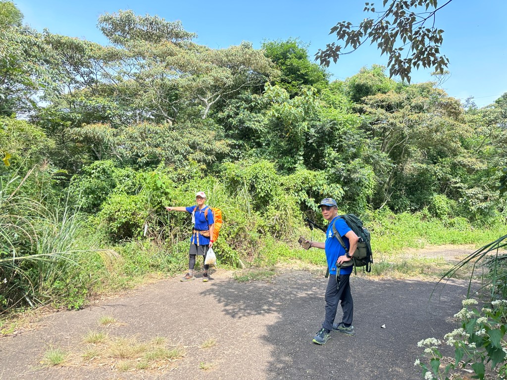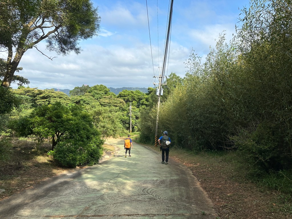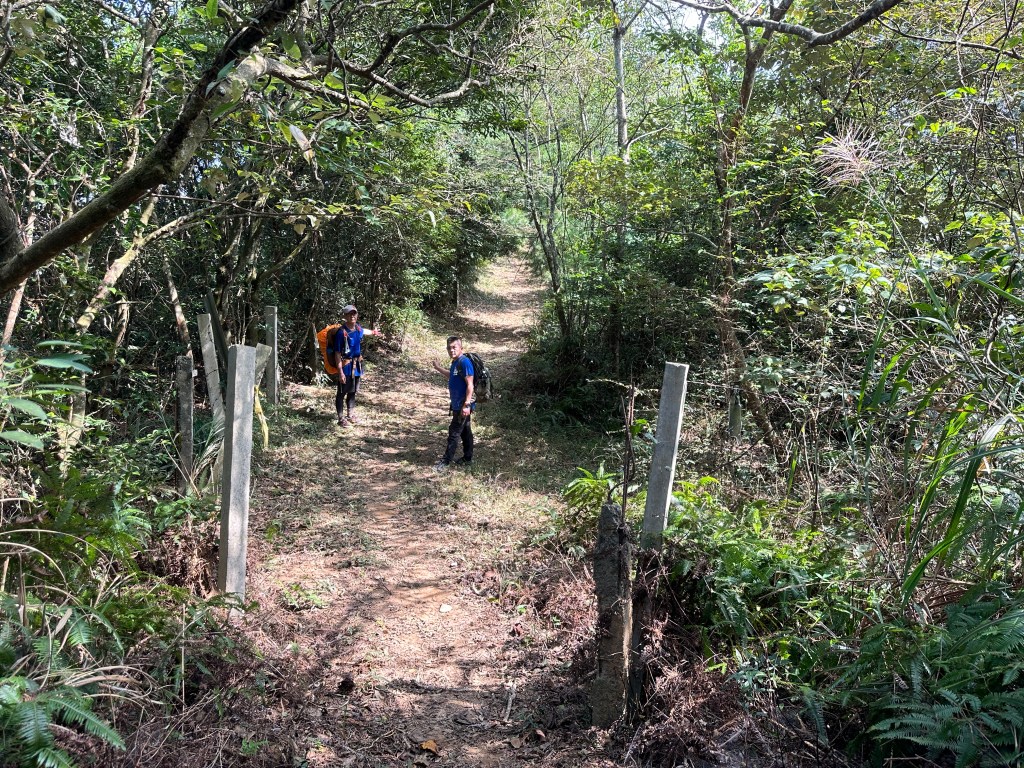 這一次來三通嶺,發現路徑上的雜草比起之前我們來時長了不少!三人在這裡的山友亭休息了一會,先回走200m,回到十字路口,開始左轉沿著新開發的社區車道走約900m到底,看到一排的聖誕樹!由聖誕數之間穿過就會看到聖誕樹後方有一條略微寬大的路徑,由此路徑向右陡下會看到一道鐵門,再往前走有路徑可以繞過鐵門,超過鐵門走100m的雜草叢生路徑,接上四岔路口,向左有兩條路線都可以走。