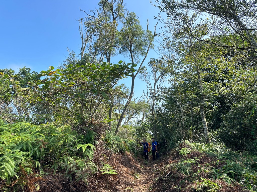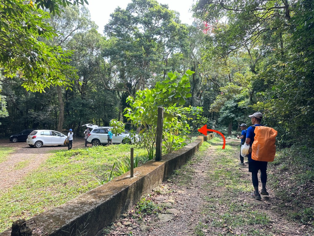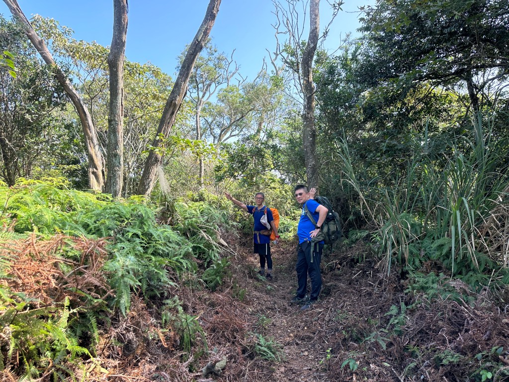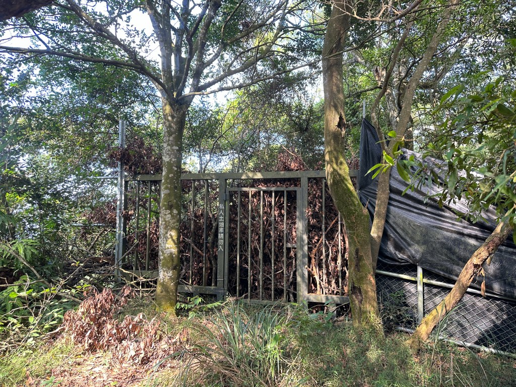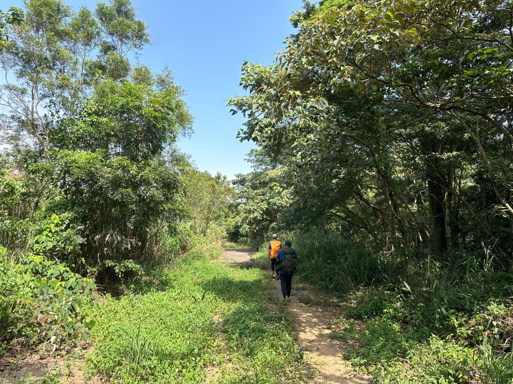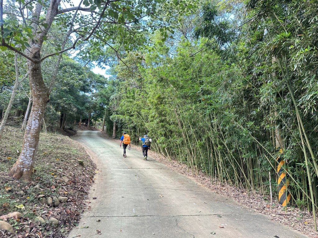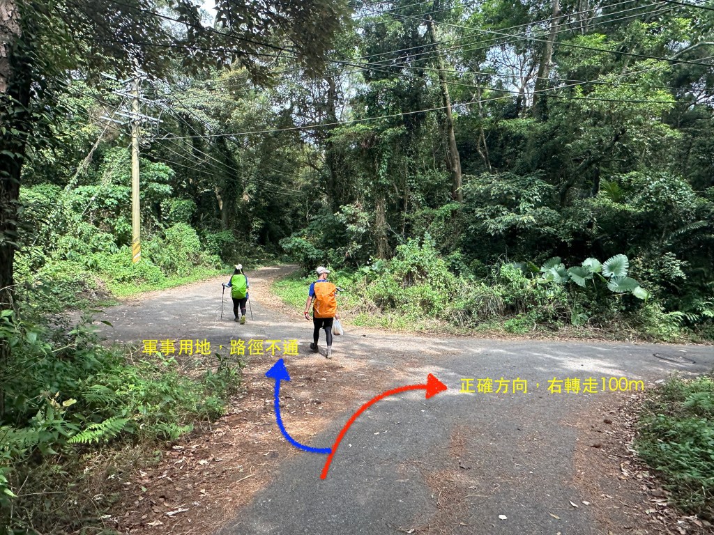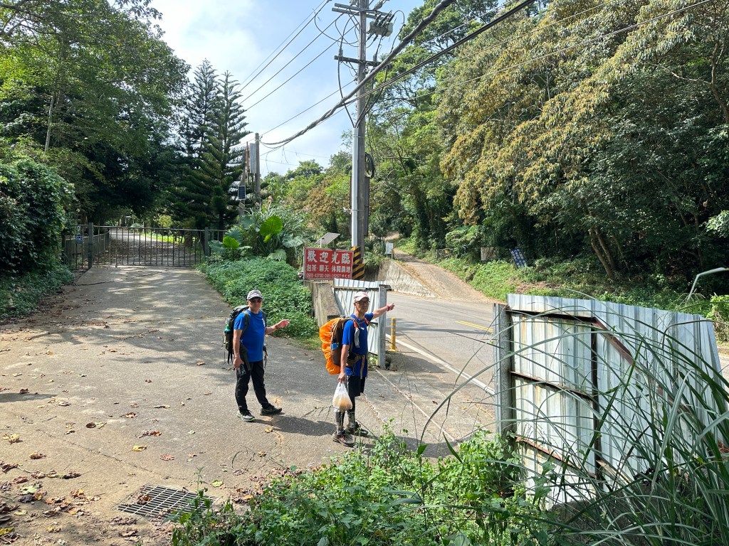 這一次來三通嶺,發現路徑上的雜草比起之前我們來時長了不少!三人在這裡的山友亭休息了一會,先回走200m,回到十字路口,開始左轉沿著新開發的社區車道走約900m到底,看到一排的聖誕樹!由聖誕數之間穿過就會看到聖誕樹後方有一條略微寬大的路徑,由此路徑向右陡下會看到一道鐵門,再往前走有路徑可以繞過鐵門,超過鐵門走100m的雜草叢生路徑,接上四岔路口,向左有兩條路線都可以走。