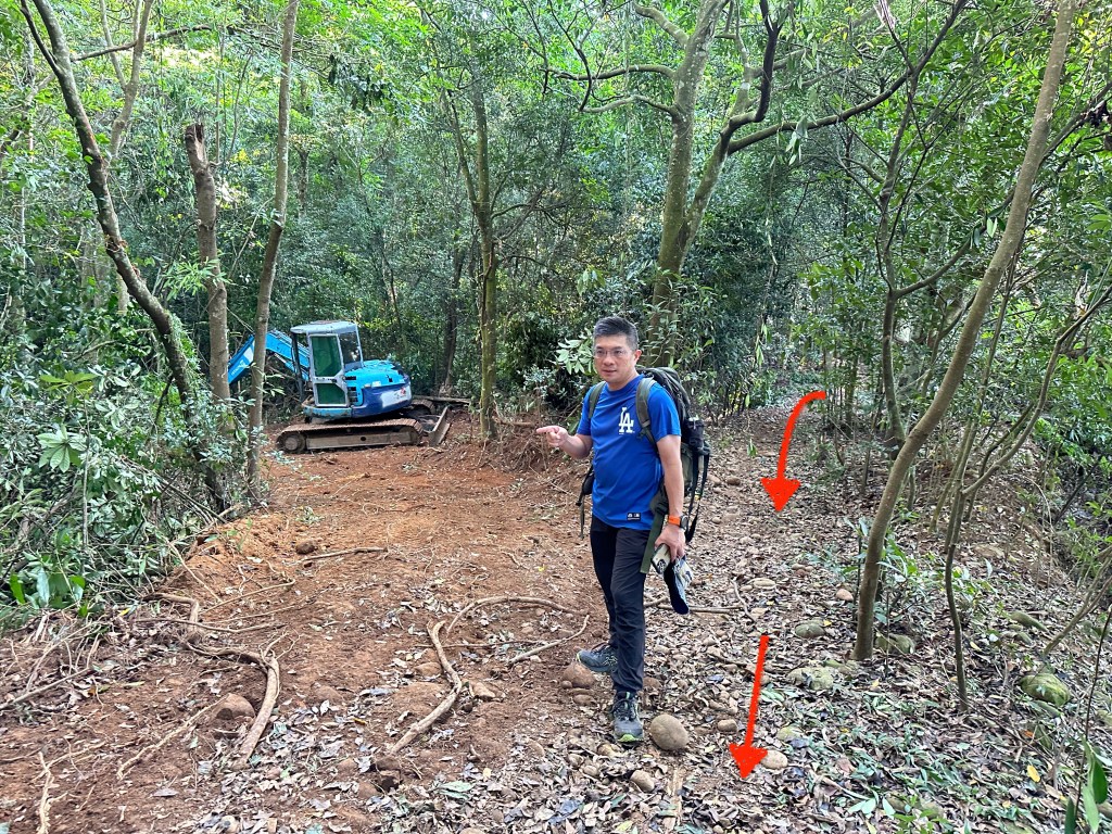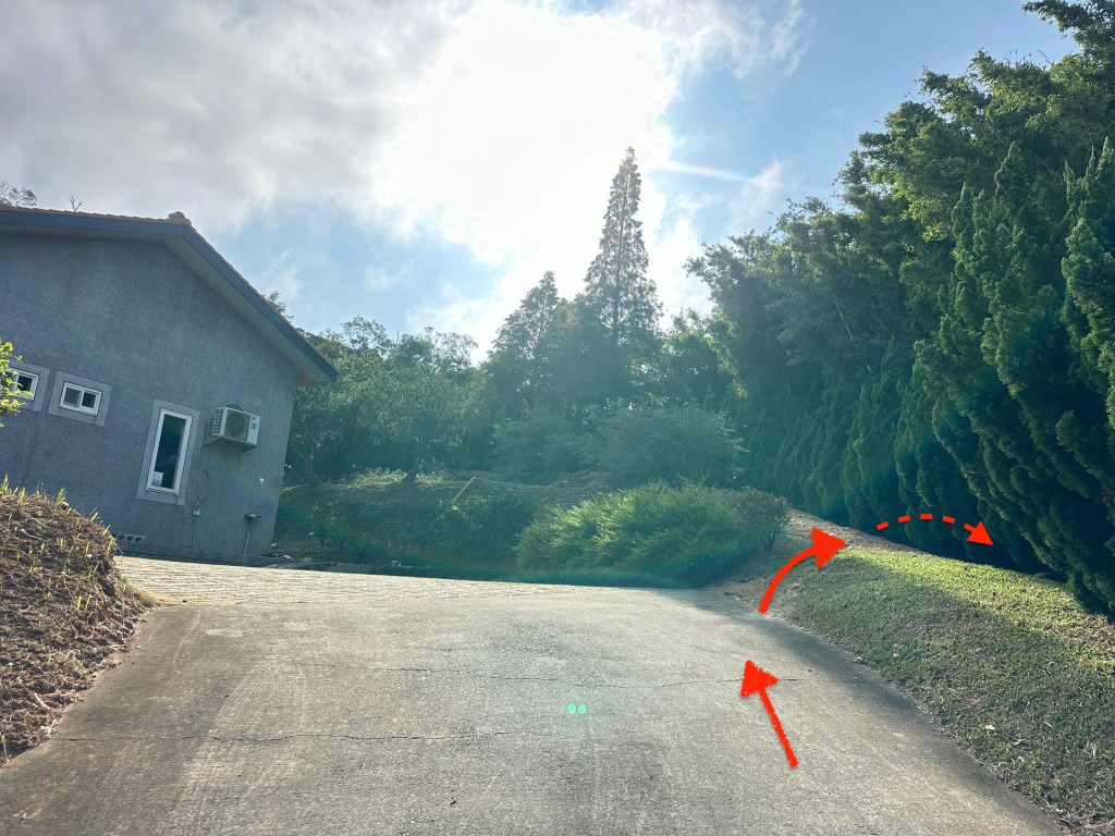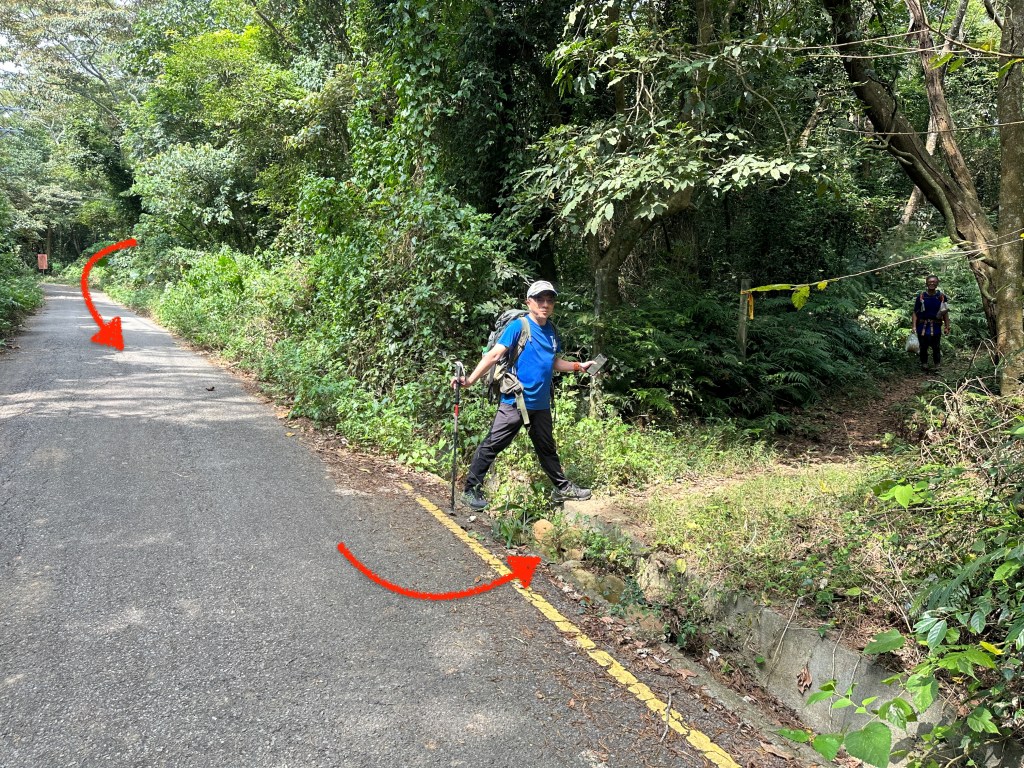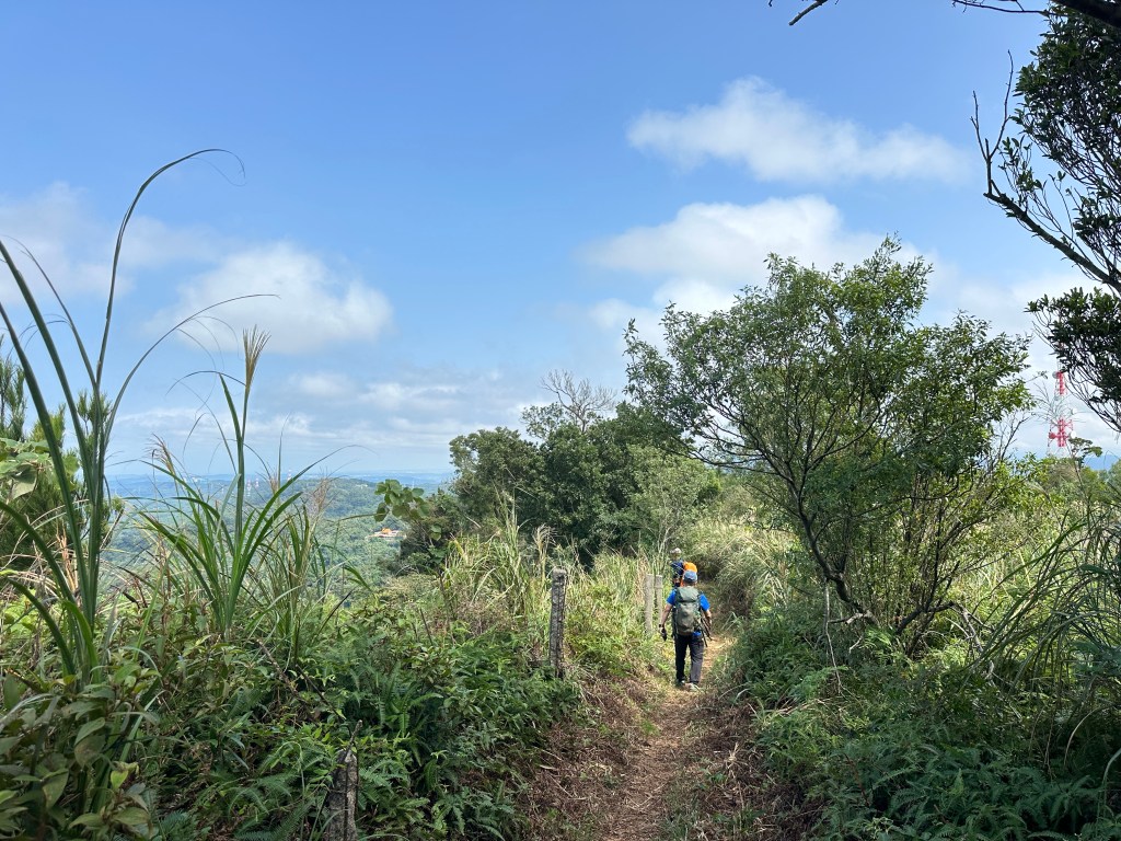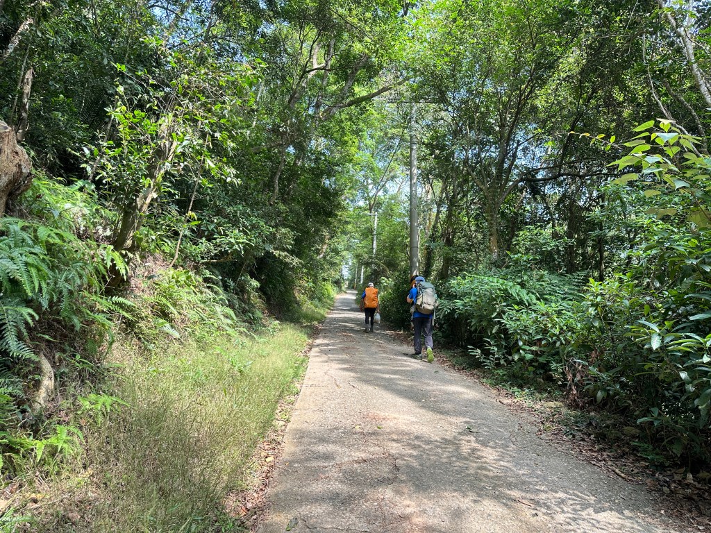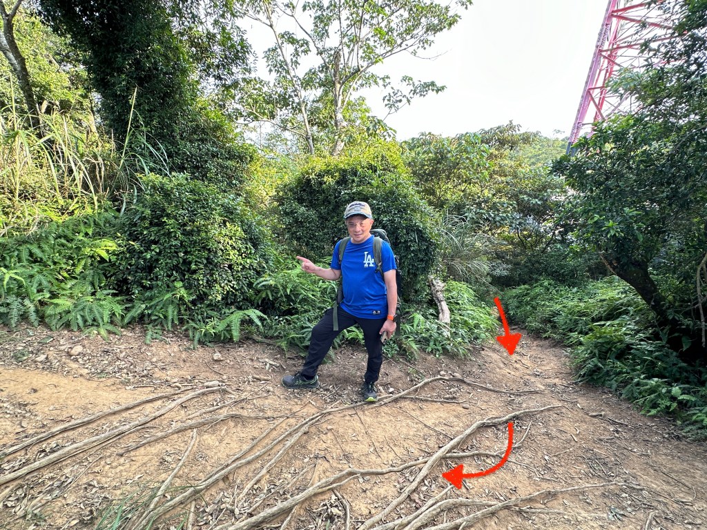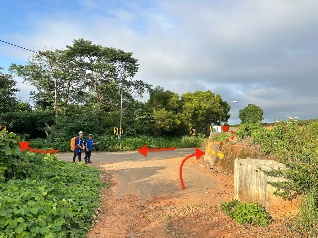 這一次來三通嶺,發現路徑上的雜草比起之前我們來時長了不少!三人在這裡的山友亭休息了一會,先回走200m,回到十字路口,開始左轉沿著新開發的社區車道走約900m到底,看到一排的聖誕樹!由聖誕數之間穿過就會看到聖誕樹後方有一條略微寬大的路徑,由此路徑向右陡下會看到一道鐵門,再往前走有路徑可以繞過鐵門,超過鐵門走100m的雜草叢生路徑,接上四岔路口,向左有兩條路線都可以走。