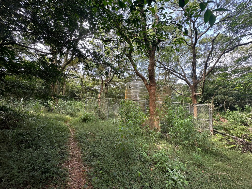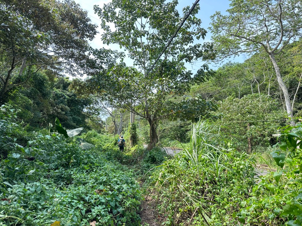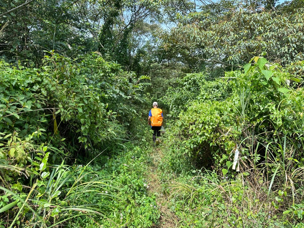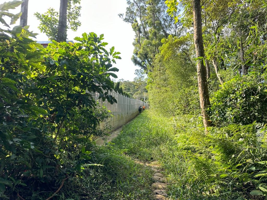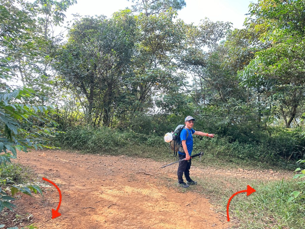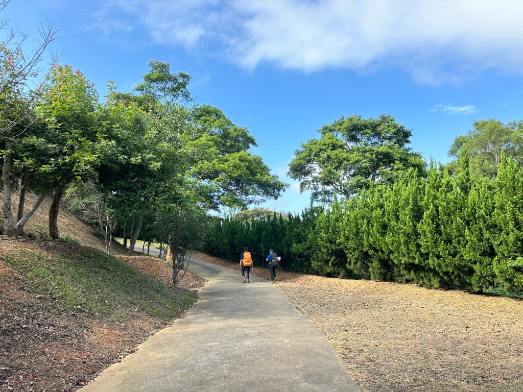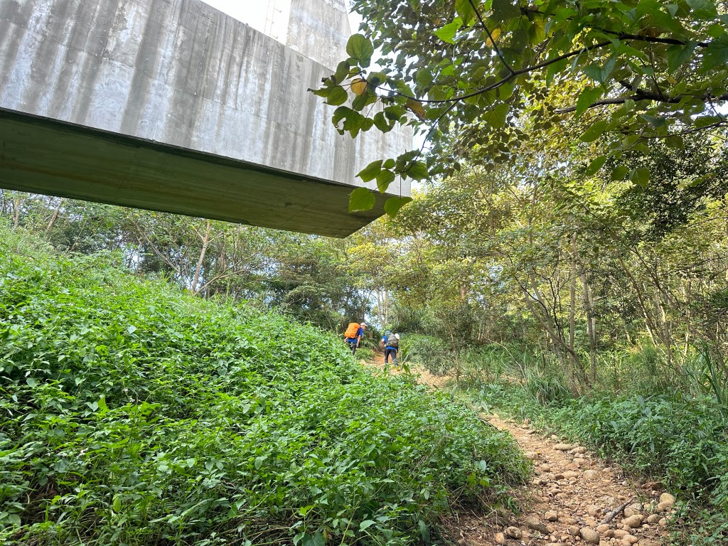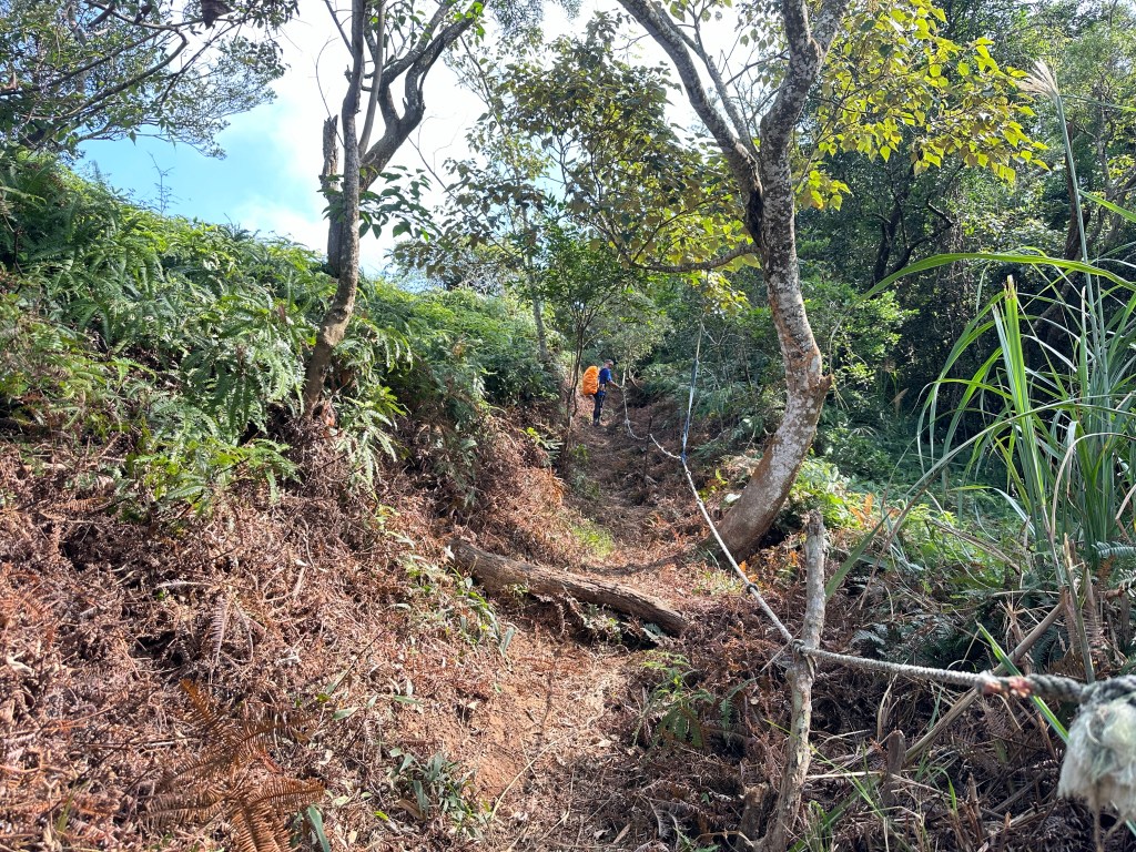 這一次來三通嶺,發現路徑上的雜草比起之前我們來時長了不少!三人在這裡的山友亭休息了一會,先回走200m,回到十字路口,開始左轉沿著新開發的社區車道走約900m到底,看到一排的聖誕樹!由聖誕數之間穿過就會看到聖誕樹後方有一條略微寬大的路徑,由此路徑向右陡下會看到一道鐵門,再往前走有路徑可以繞過鐵門,超過鐵門走100m的雜草叢生路徑,接上四岔路口,向左有兩條路線都可以走。