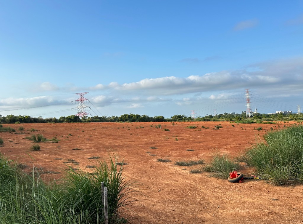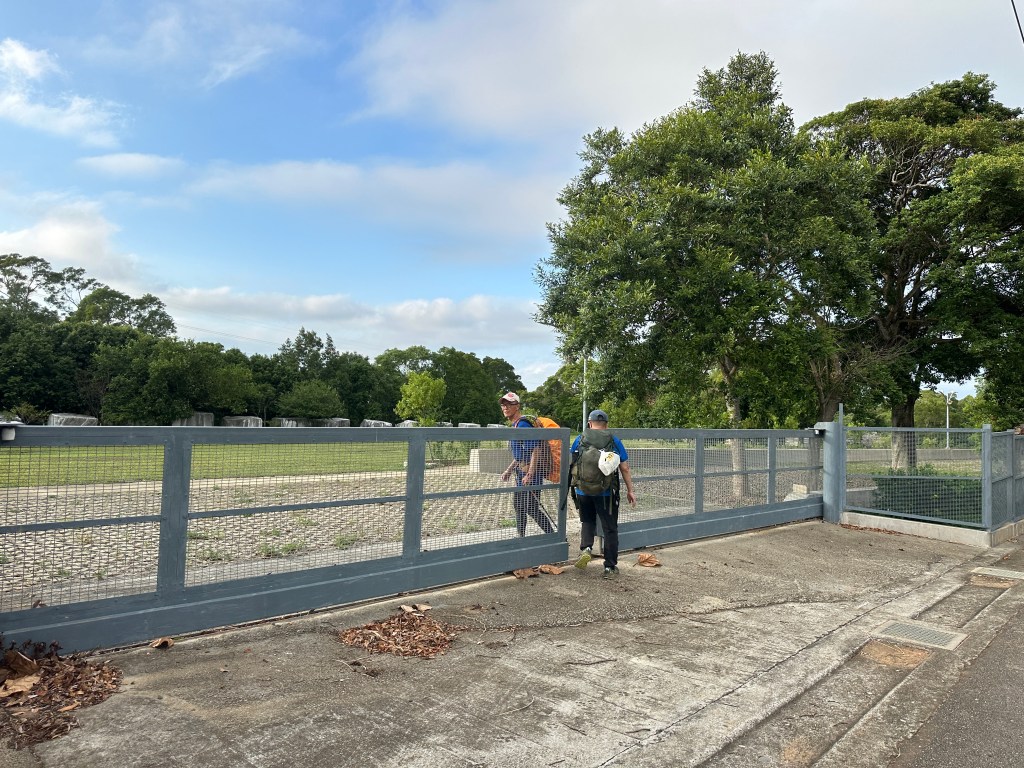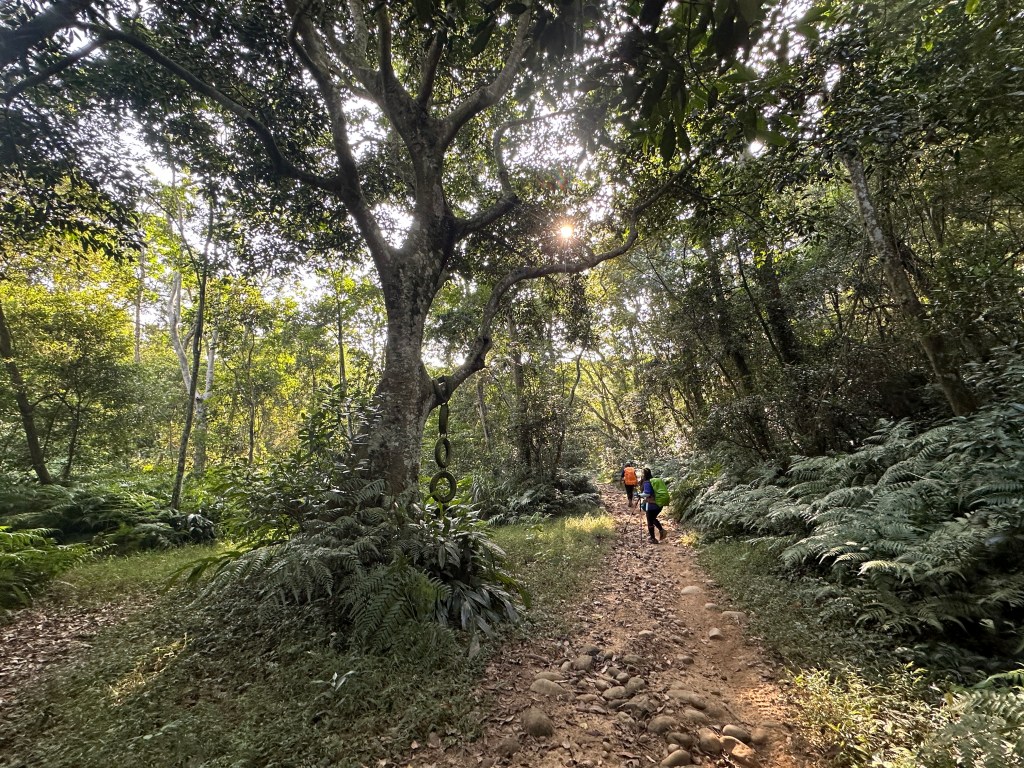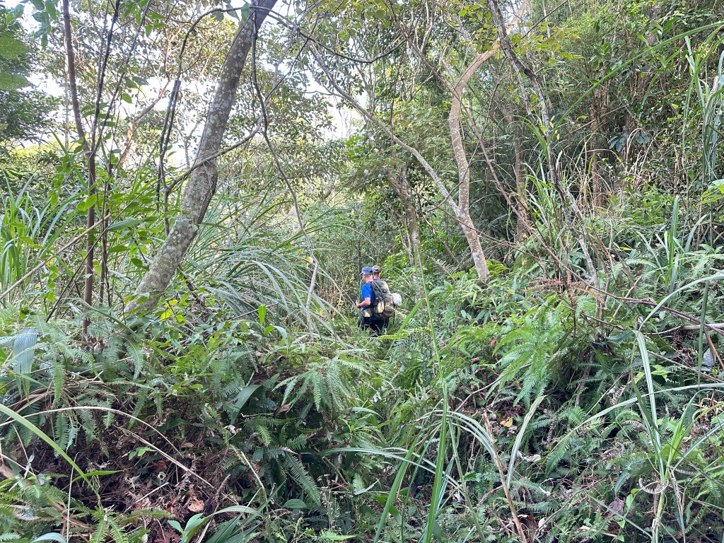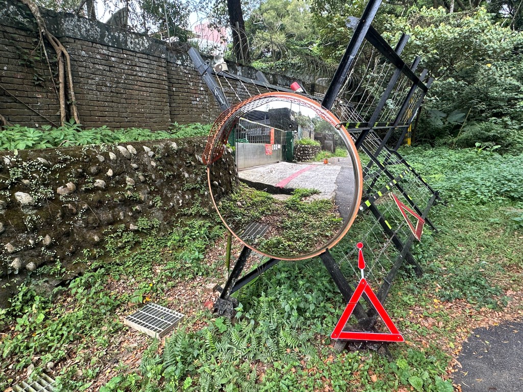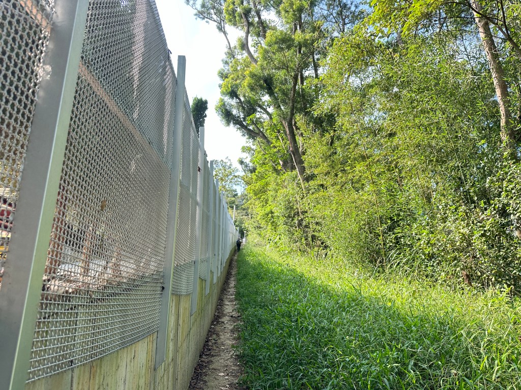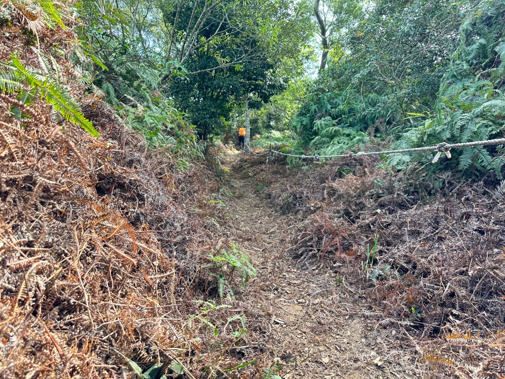 這一次來三通嶺,發現路徑上的雜草比起之前我們來時長了不少!三人在這裡的山友亭休息了一會,先回走200m,回到十字路口,開始左轉沿著新開發的社區車道走約900m到底,看到一排的聖誕樹!由聖誕數之間穿過就會看到聖誕樹後方有一條略微寬大的路徑,由此路徑向右陡下會看到一道鐵門,再往前走有路徑可以繞過鐵門,超過鐵門走100m的雜草叢生路徑,接上四岔路口,向左有兩條路線都可以走。
