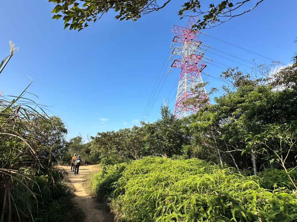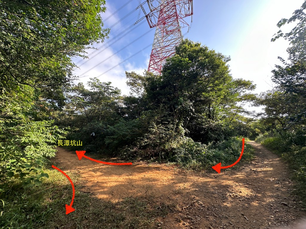 在四岔路口這裡,向左走且陡下,又是一路的鵝軟石路,不太好走,因為這些鵝軟石都是拳頭一般大。這一小段路徑上有不少的岔路,但都是離線地圖上沒有顯示的路線?通過輪胎樹後繼續往前,隨著路徑右轉陡上,進入山徑陡上看到高大電塔後路徑轉為平緩且轉為紅黃色的土路。再往前會看到第二個大型電塔,這個電塔的前方會看到有一條右岔的寬大路線,往右岔沿著路徑走500m即到長潭坑山!