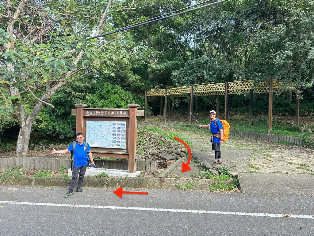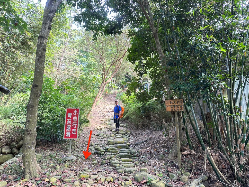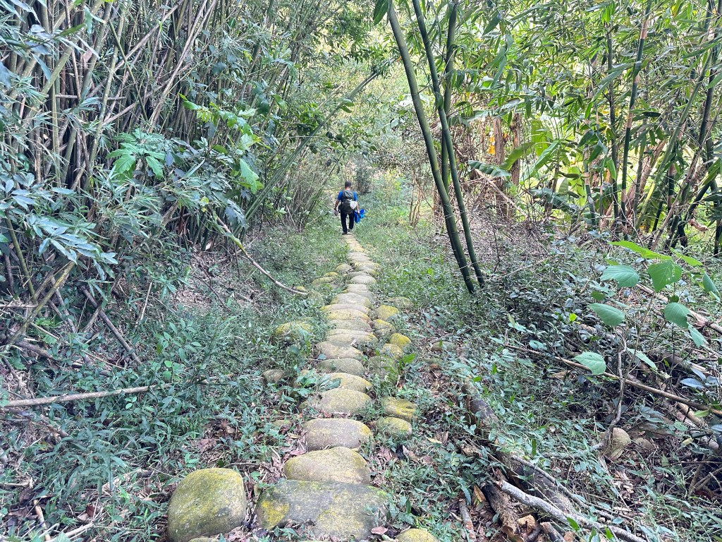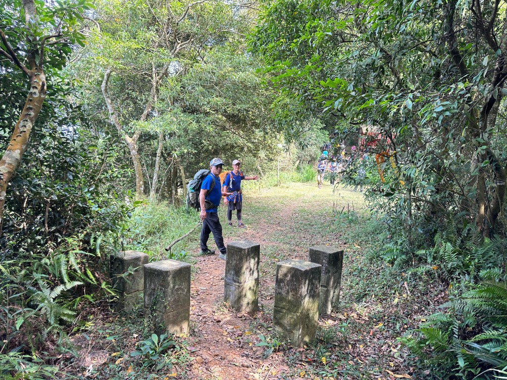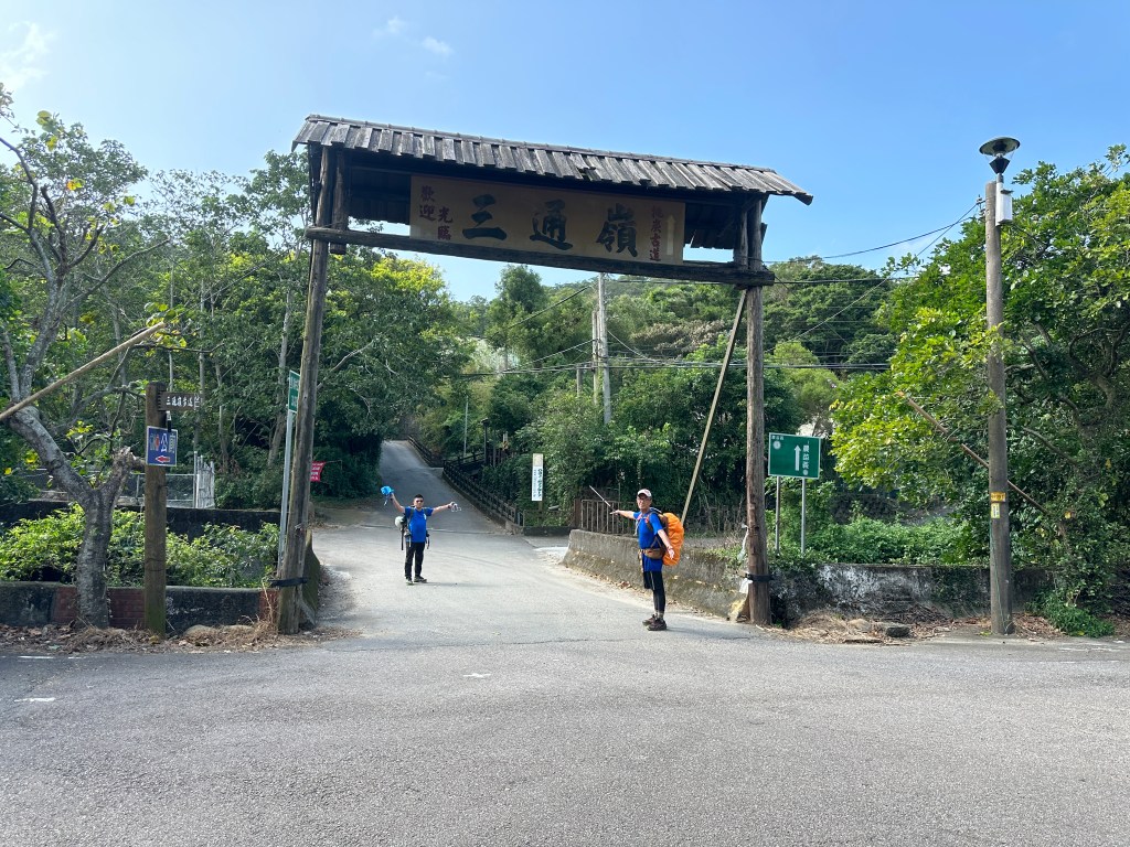 從牌樓走進來200m後,左側會看到有一個放棄的涼亭,這時就左轉往涼亭旁的步道逐步陡上,也是大顆的鵝軟石步道,而且一路攀升!700m後看到民宅,路徑會沿著民宅牆壁的右側前行,接上十字路口,繼續陡上再走200m就抵達大坑尾山,也稱為三通嶺。
