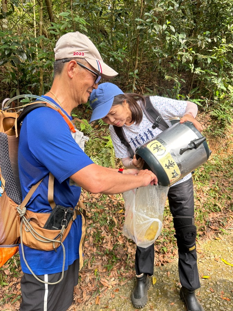 抵達到裕隆土地公廟後,恰好遇到苗栗通霄苑裡社區大學古道班的大隊人馬,正在此整修步道亦正在休息中,Smile又發揮傻大姊風範,又跟人家要八寶粥!古道班給了我們一大袋有冰塊的八寶粥,真是,久旱逢甘霖啊!