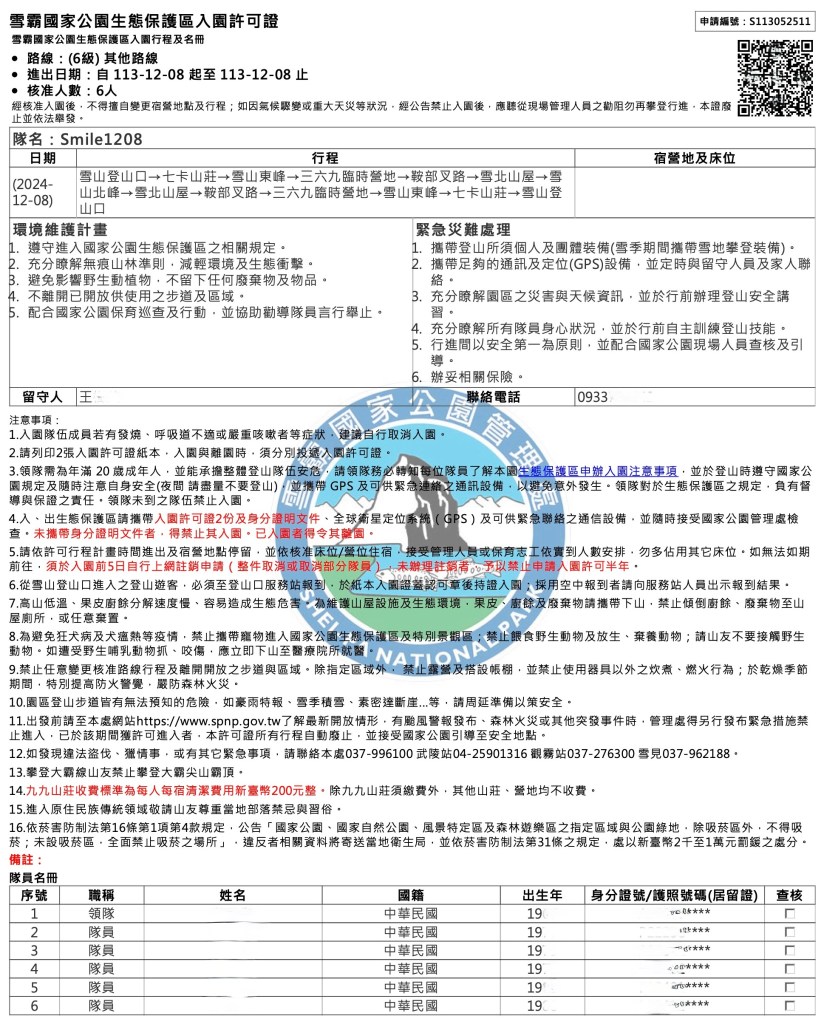 在網路上的申請過程中,可以選擇天數及勾選行程,並且必須附帶上傳「登山安全管理表」以利審核,本次範本如下: