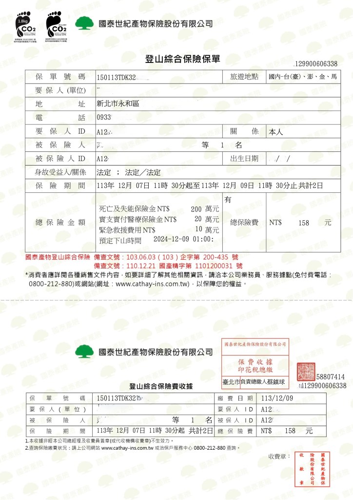 朋友們登山別忘了要投保喔!可以利用下列點按直接進入保險公司的網頁進行投保:
