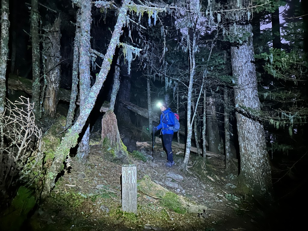 上了哭坡頂後,沿著邊坡稜線路走到4.5K進入略陡且有起伏的小叢黑森林,陡上來到5.1K的雪山東峰,已經是清晨4點20分,直接由雪山東峰右側腰繞而過,逕往369臨時營地方向走。由5.1K的雪山東峰到7.1K的369臨時營地,這一段路線起伏有限,這時Smile走起來就快了不少!在清晨5點20分左右來到了369臨時營地的上方路徑。