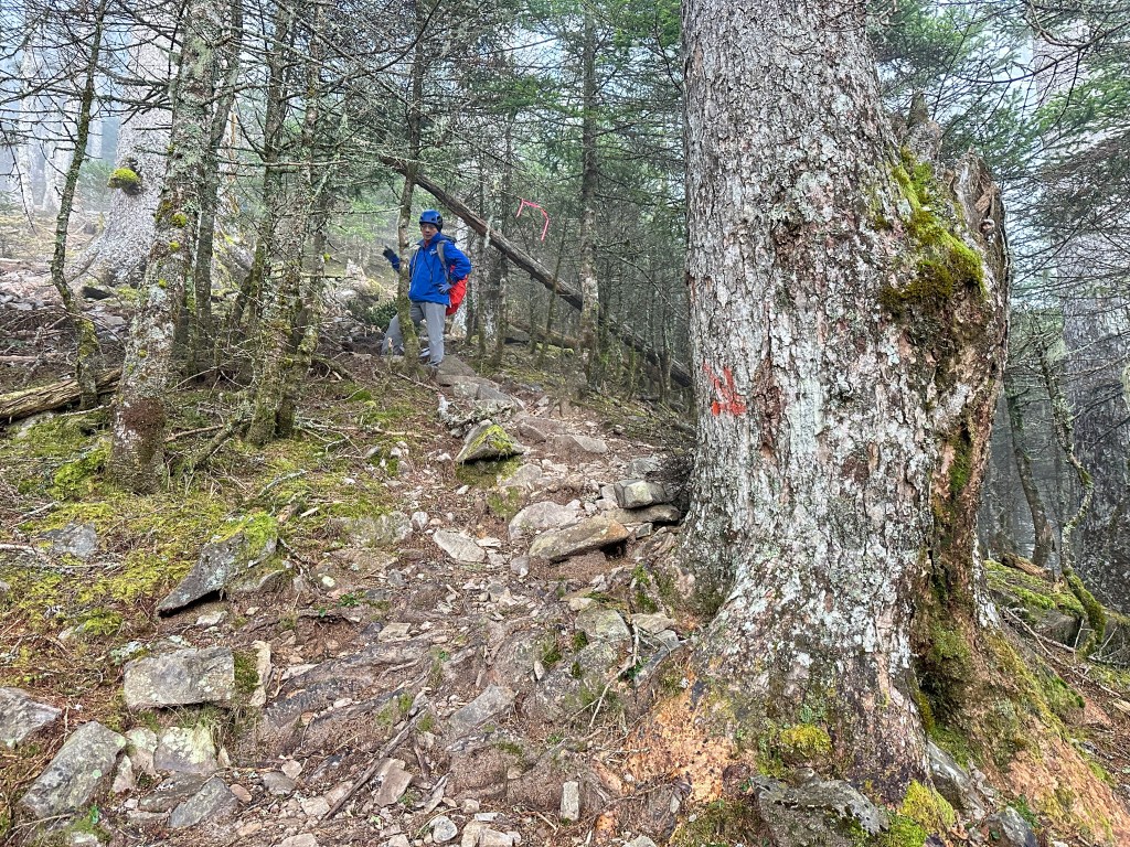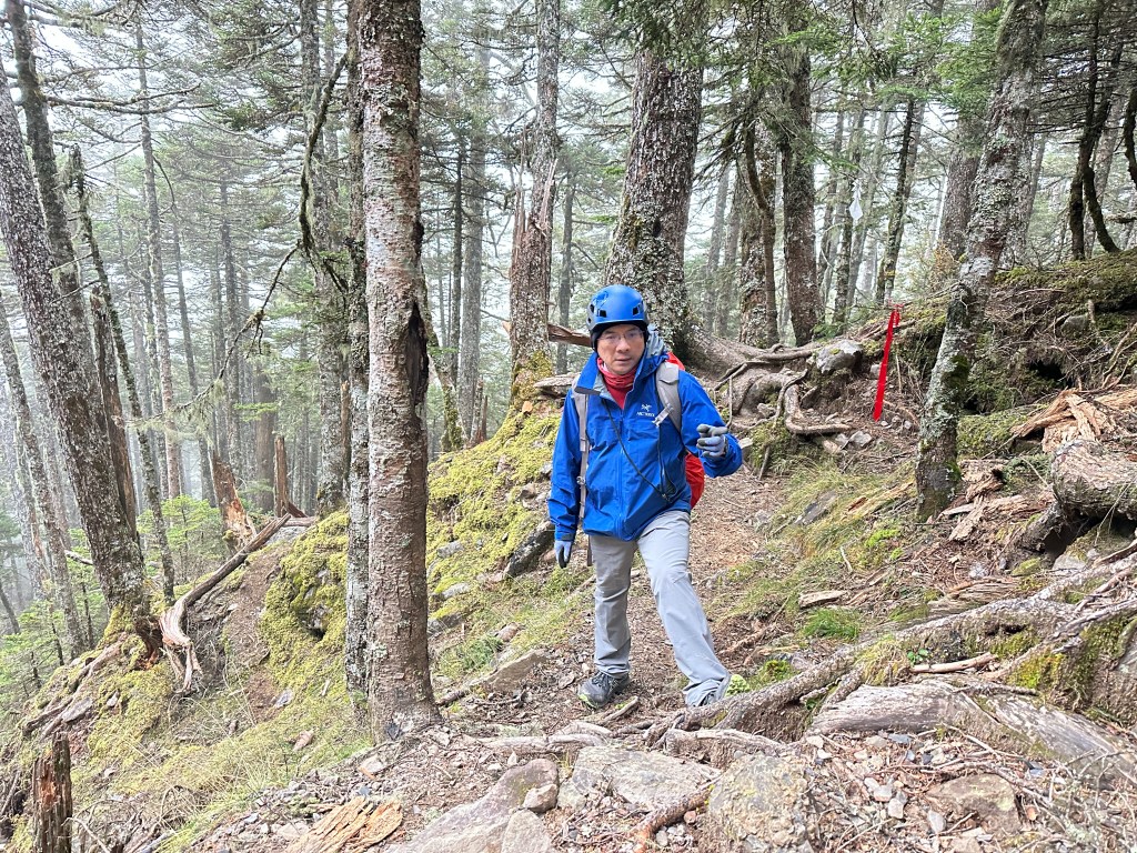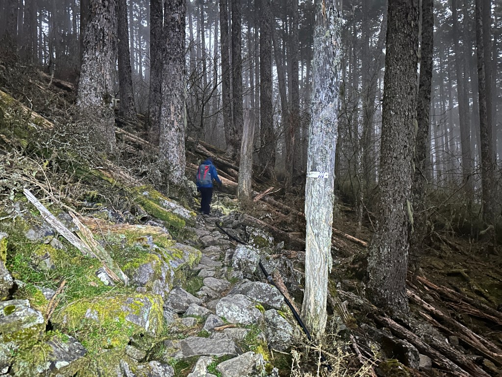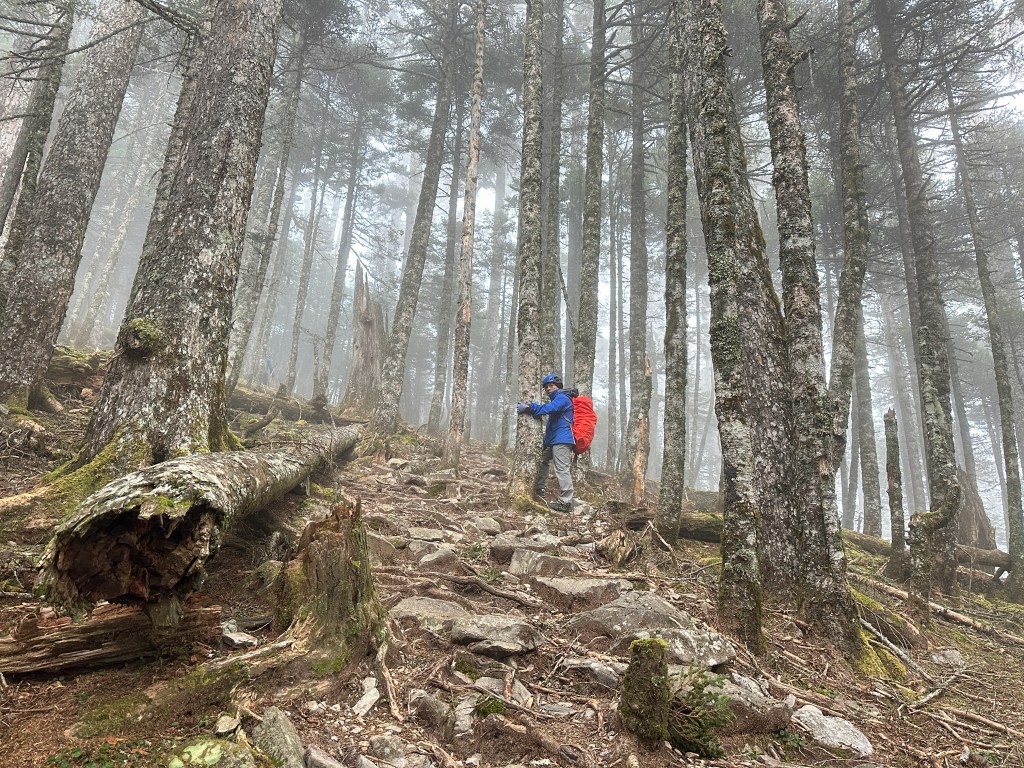 從雪山主峰步道0K的大水池登山口到2K的七卡山莊,這2K的距離要陡上海拔高度約350m,算得上是輕鬆的過程,但走走停停也花了一個小時。而從2K的七卡山莊陡上到4K的觀景台,則需要陡上海拔高度有500m,這一段就可以感受到陡度變大了,而且路徑上也佈滿了大大小小的石塊,走起來比較沒有那麼舒服,Smile在這一段走得很卡,而嘉鴻卻老早就不知飛到那裡?我也在這段裡一直思考,如果太晚,那就是我們沒有練好體能,就下次再來。