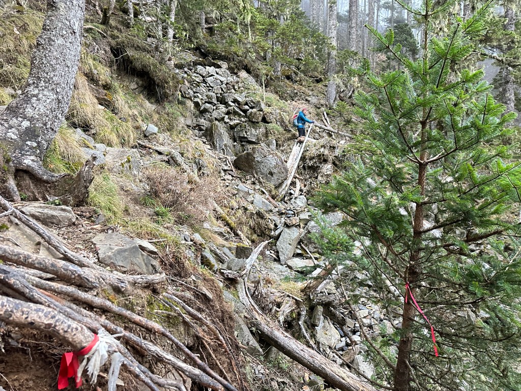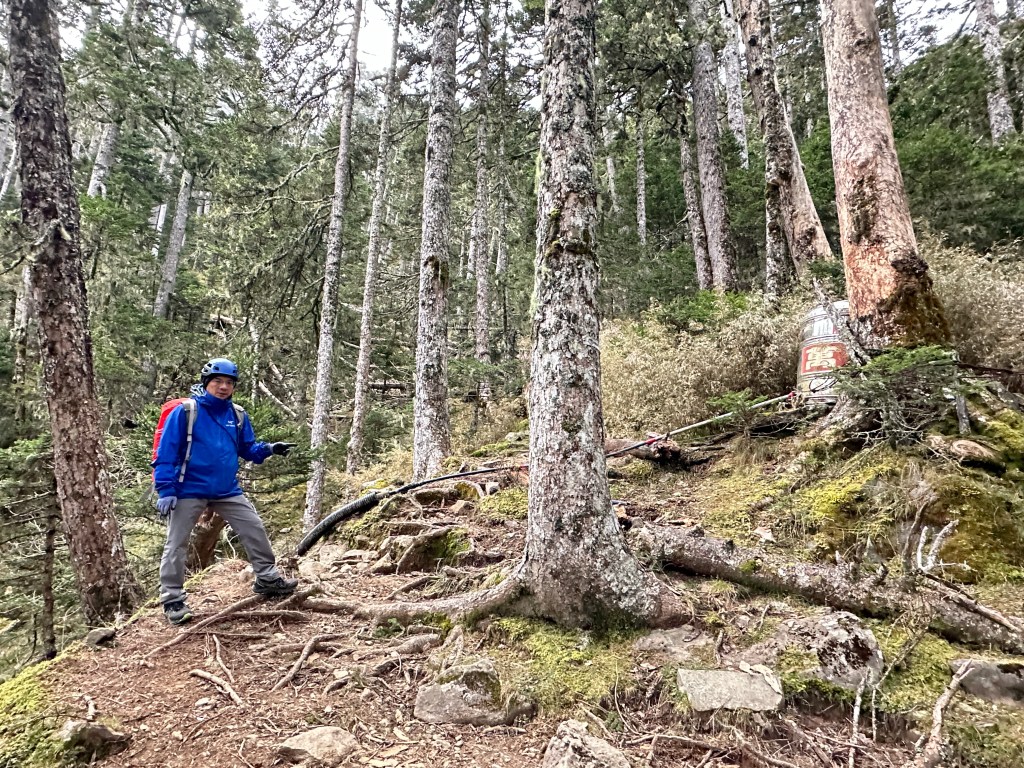 黑森林水源路這一段的距離有2.5K,從0K的大草原開始,大約在0.25K左右進入黑森林,一路上的倒木不少但還不算難走,1K是一處平台,我們三人在此休息了約40分鐘,因為Smile餓了很想吃點熱食,而我有背兩個大熱水瓶可供我們三人泡麵吃。前進到1.52K處,就是過溪段,有繩索可供穩定行走,過溪段這裡的路徑右側5m處就是垂直的斷崖地形,當然不要好奇應該是不會有機會去接近的,因為是冬天,過溪段目前是乾溪溝,只有潮濕沒有溪水。