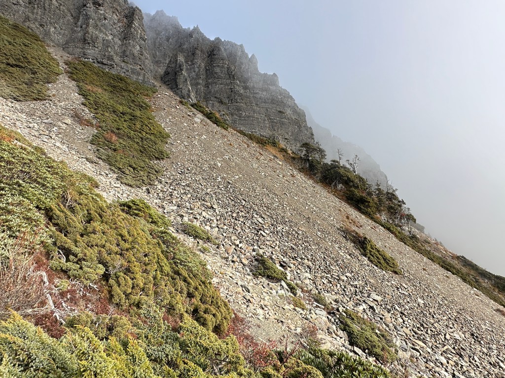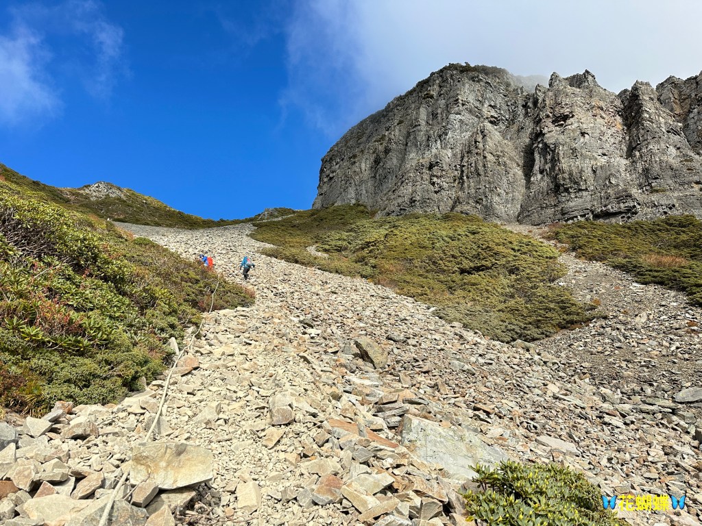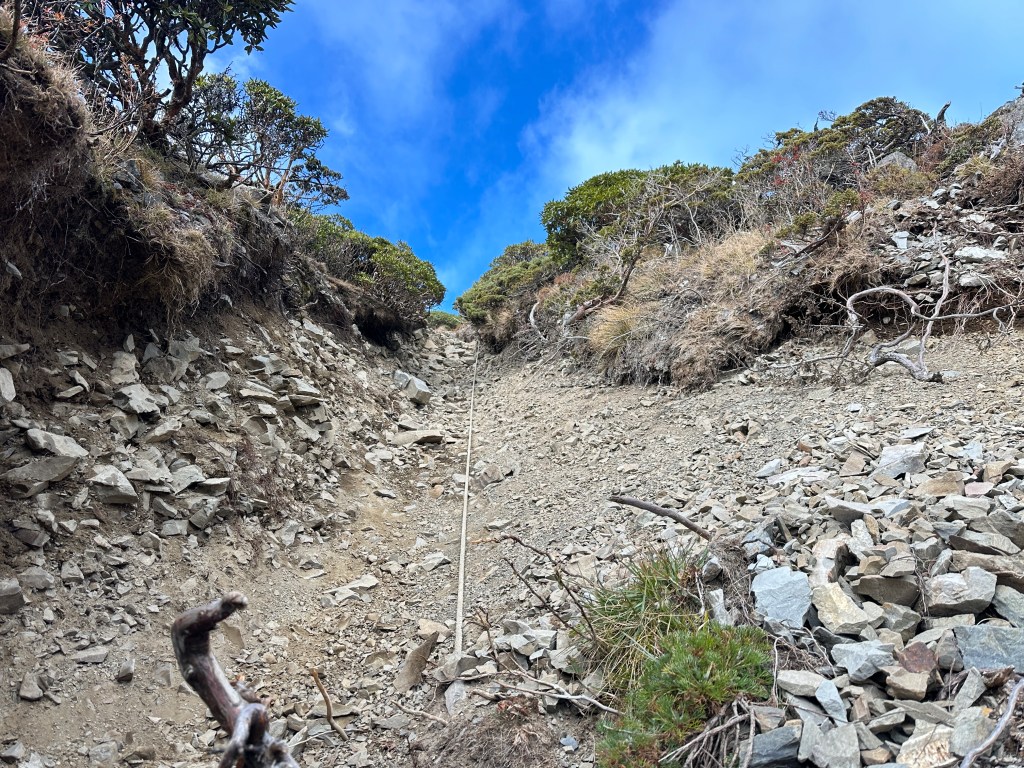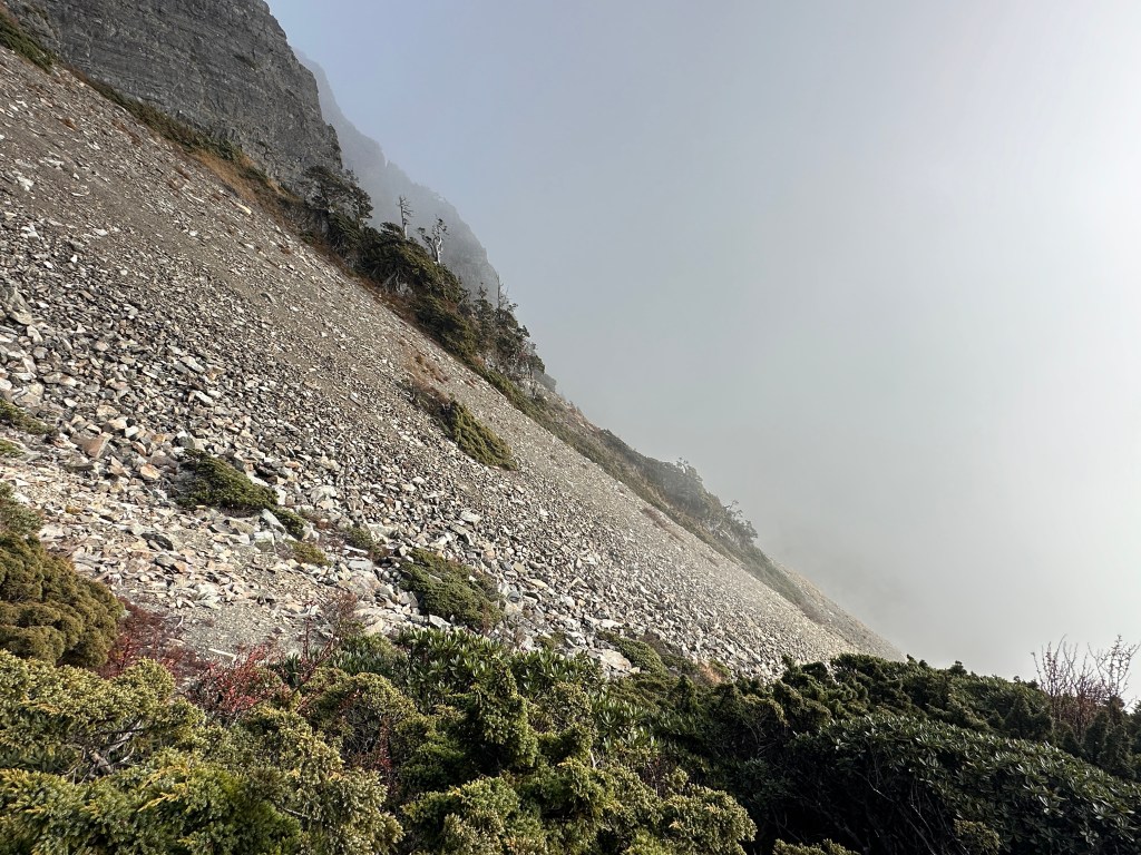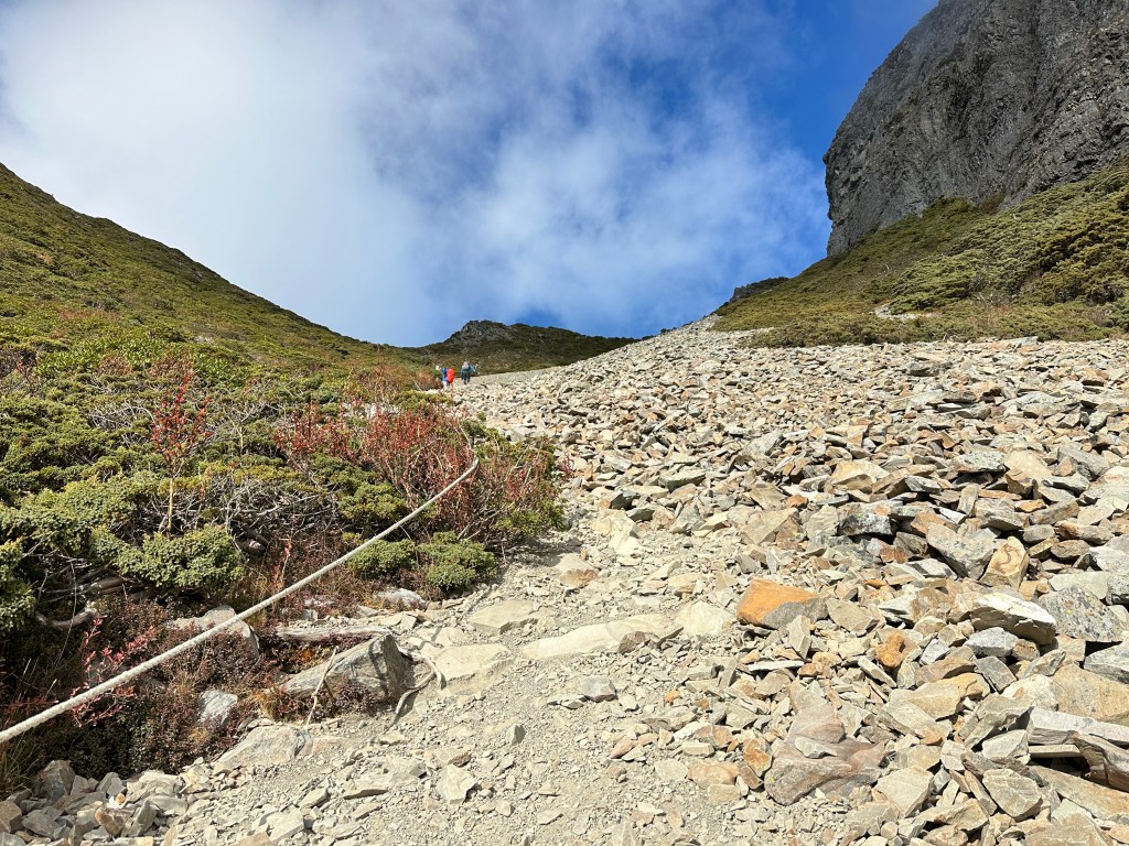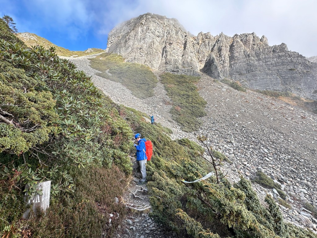 還未出黑森林前遠遠就看到了接下來2.2K後即將要面對的碎石坡,出2.2K里程碑後往左陡上接上碎石坡,這碎石坡的角度大約有60度,極為陡峭且踩在碎石上碎石會向下滑動,因此山友們總是戲稱這一段是走一步退兩步。這一段碎石坡從2.2K直陡上到2.5K接上聖稜線,這一段Smile也拍了不少照片及影片,因此也在此花了不少的時間。