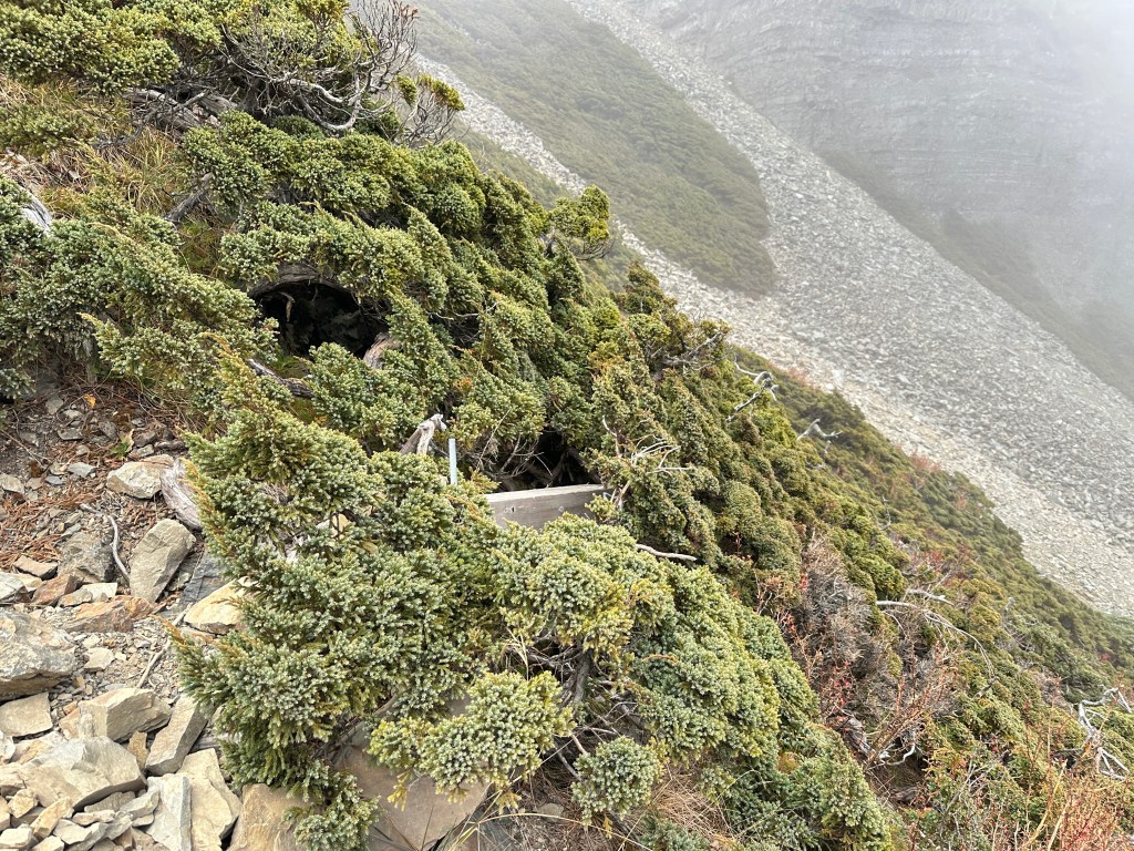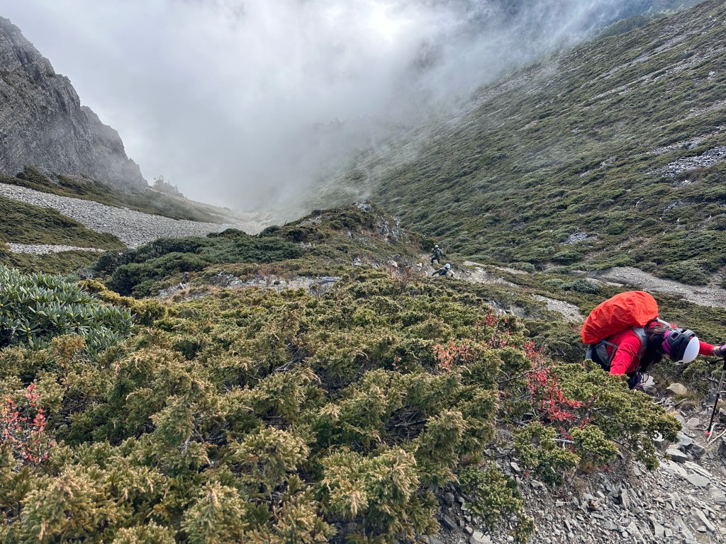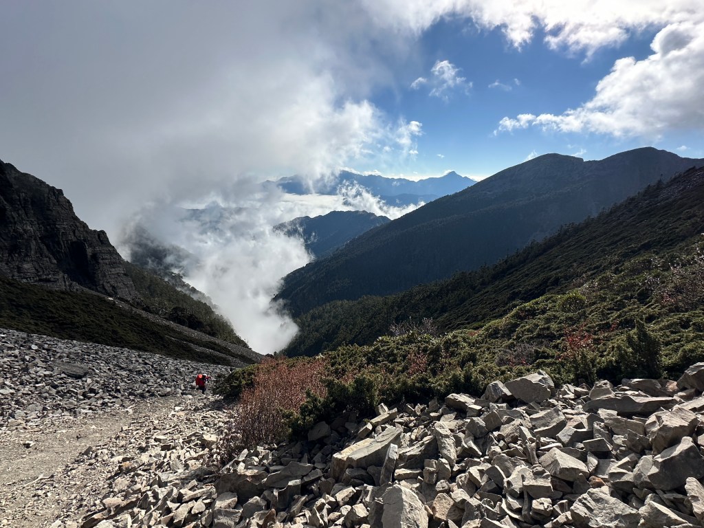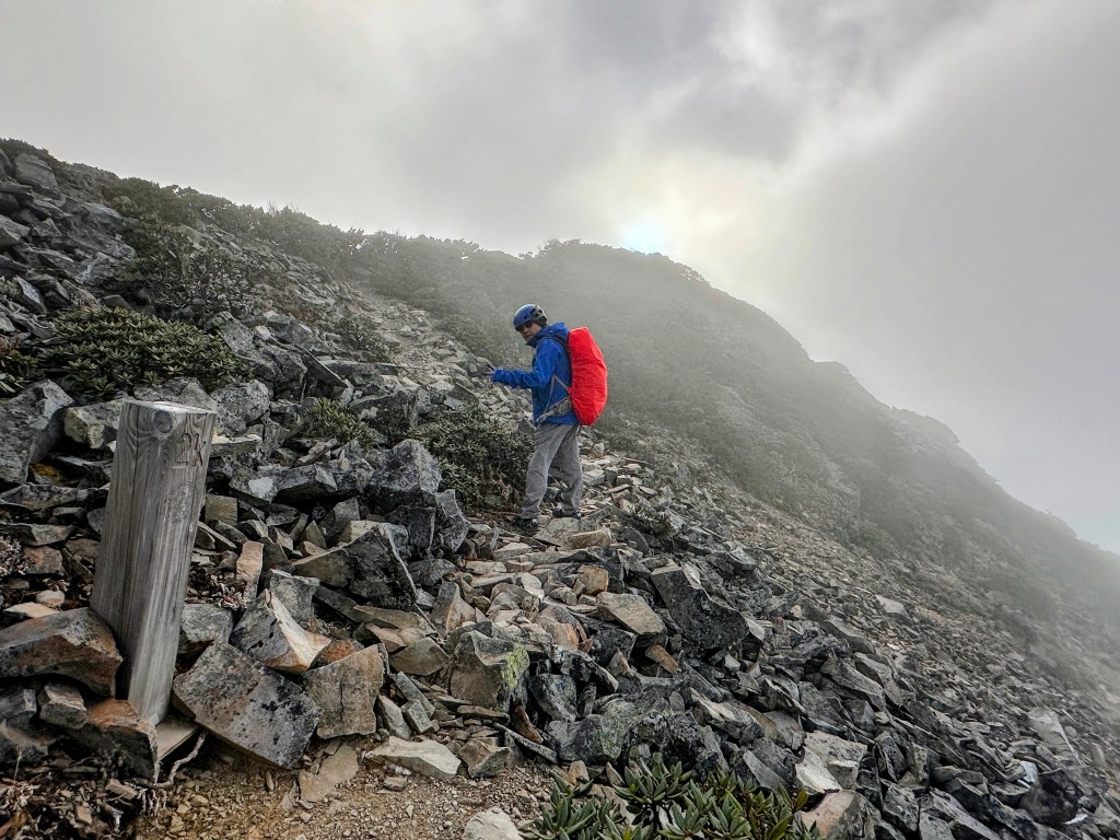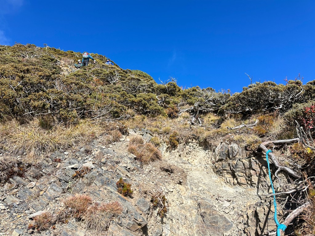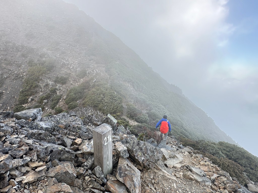 還未出黑森林前遠遠就看到了接下來2.2K後即將要面對的碎石坡,出2.2K里程碑後往左陡上接上碎石坡,這碎石坡的角度大約有60度,極為陡峭且踩在碎石上碎石會向下滑動,因此山友們總是戲稱這一段是走一步退兩步。這一段碎石坡從2.2K直陡上到2.5K接上聖稜線,這一段Smile也拍了不少照片及影片,因此也在此花了不少的時間。