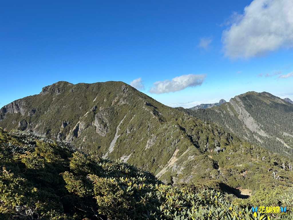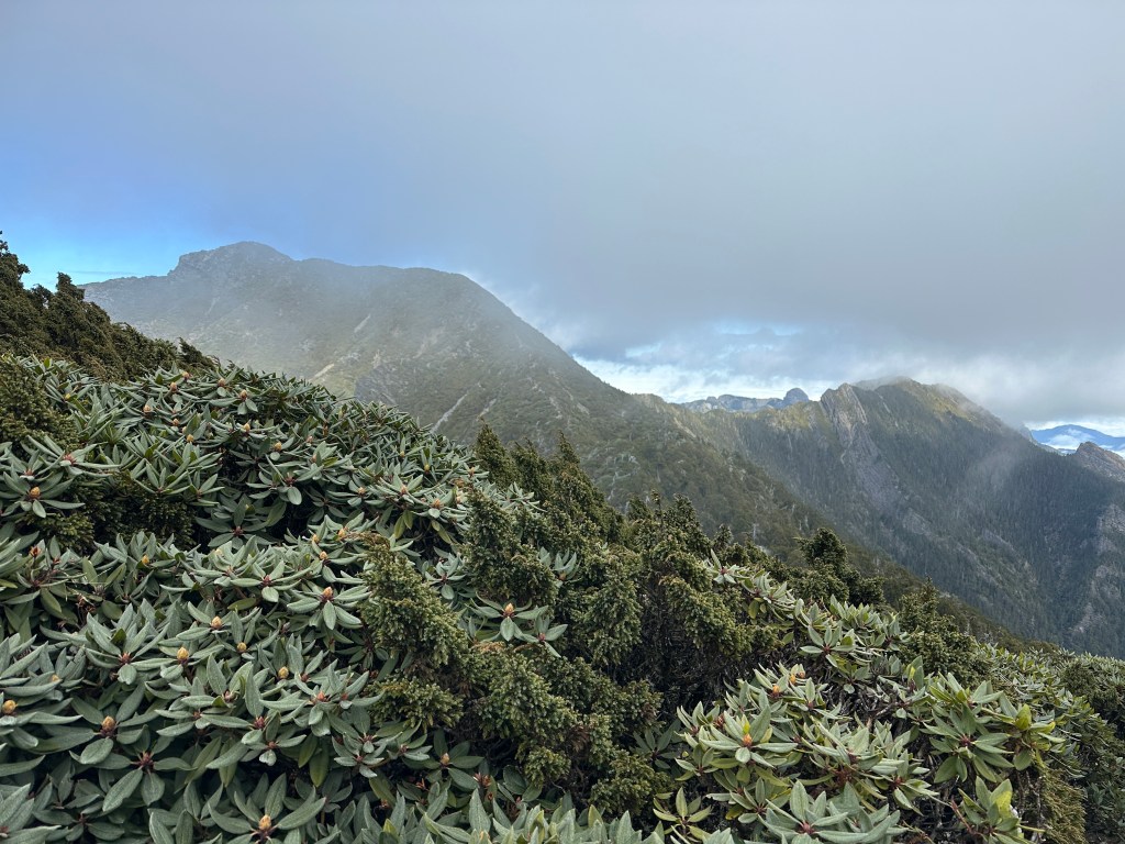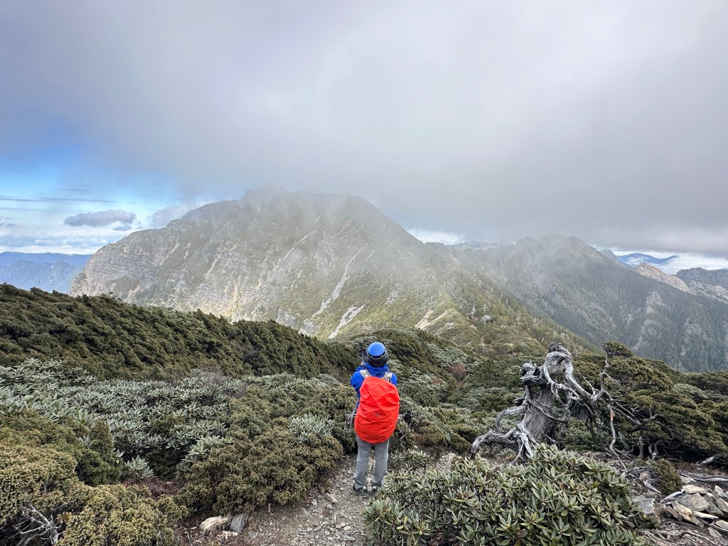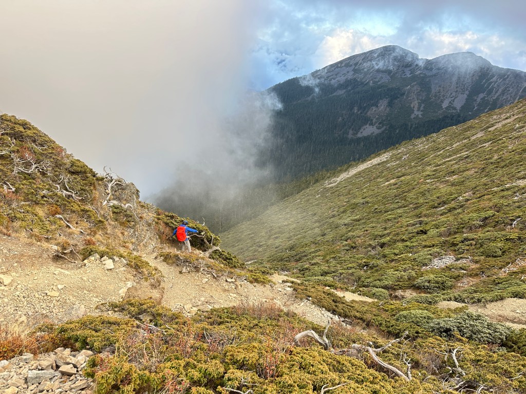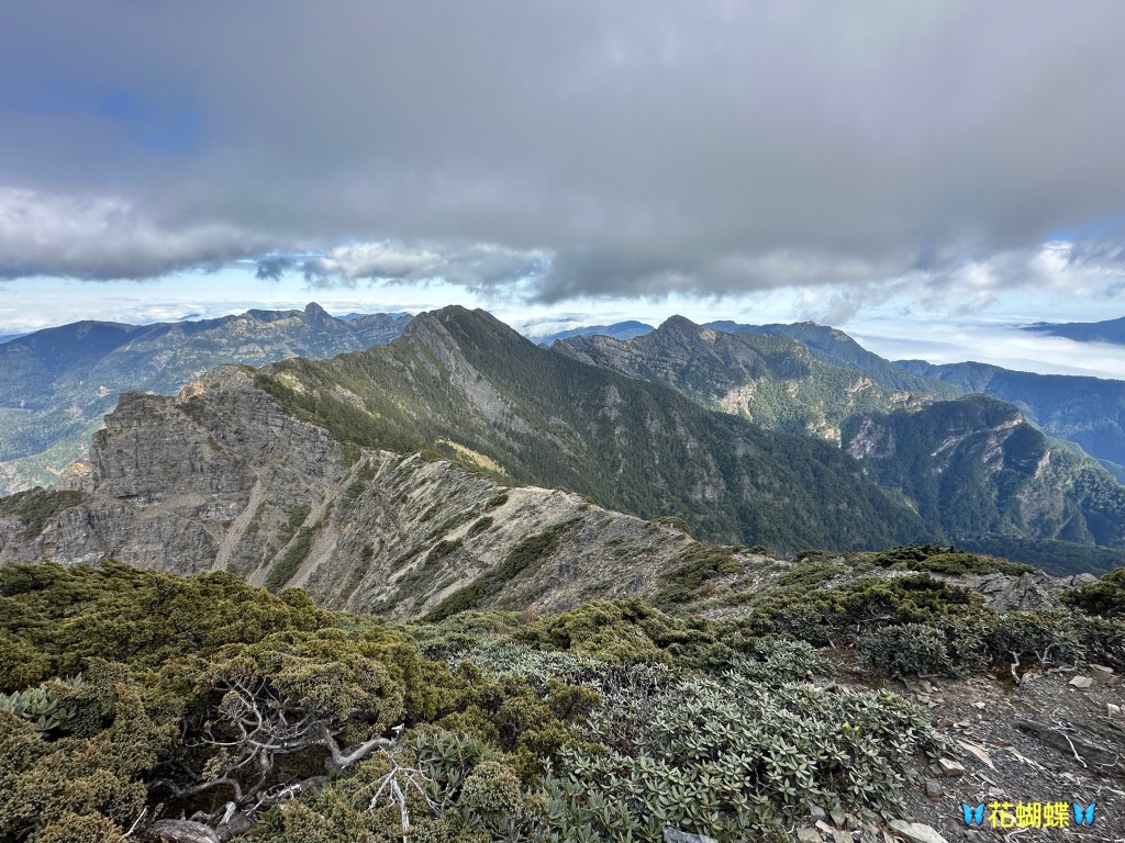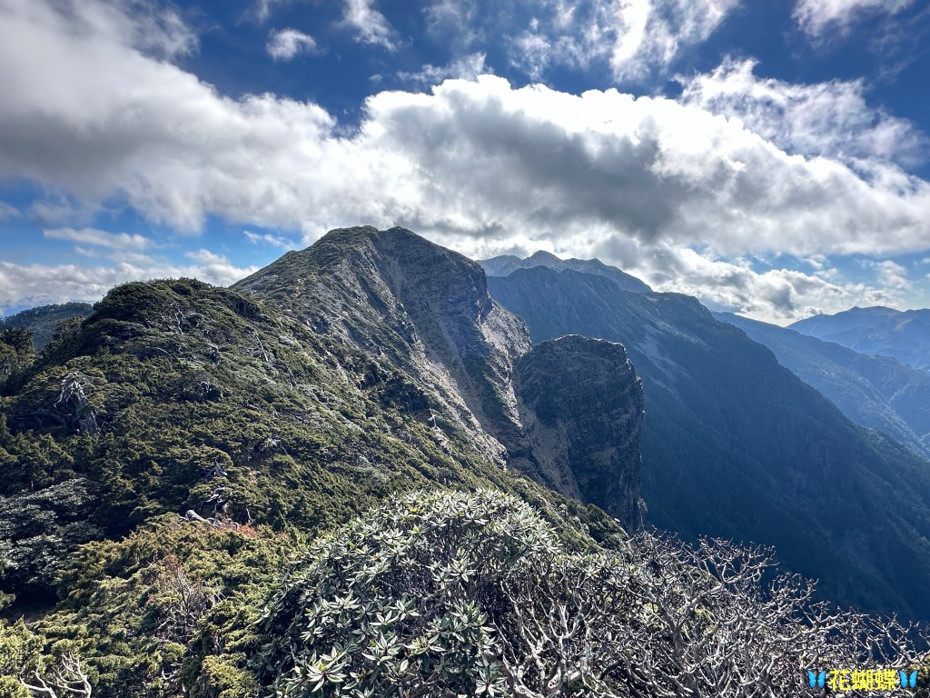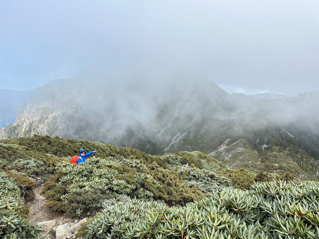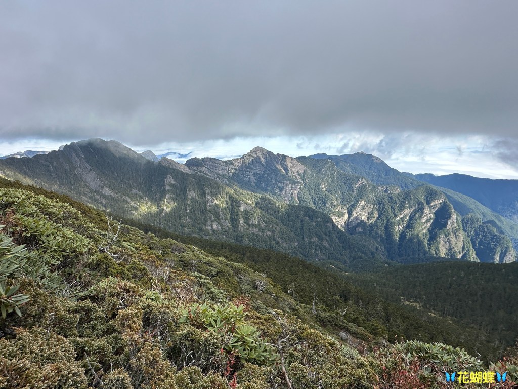 接下來,一路由聖稜線1.9K開始,通過2.1K的凱蘭特崑山北峰,一路享受著眼簾大景,雖然偶爾也雲霧籠罩,但遠眺前方的雪山北峰,也是一會全開起一會全雲霧,這一天的天氣也算不得是大好!
