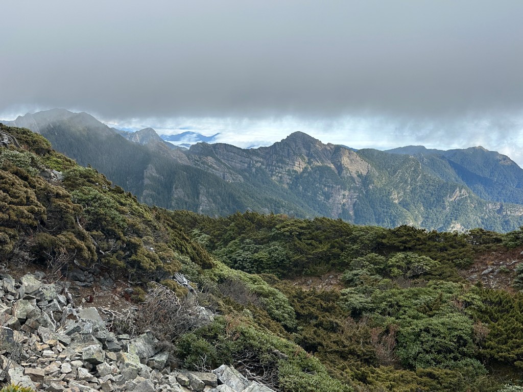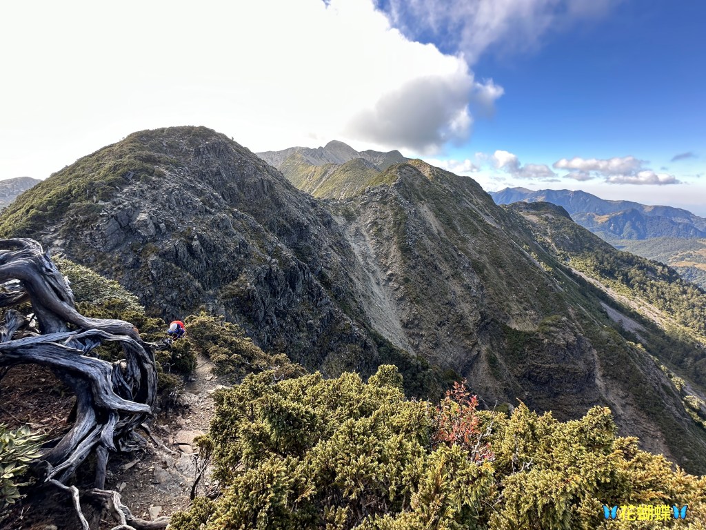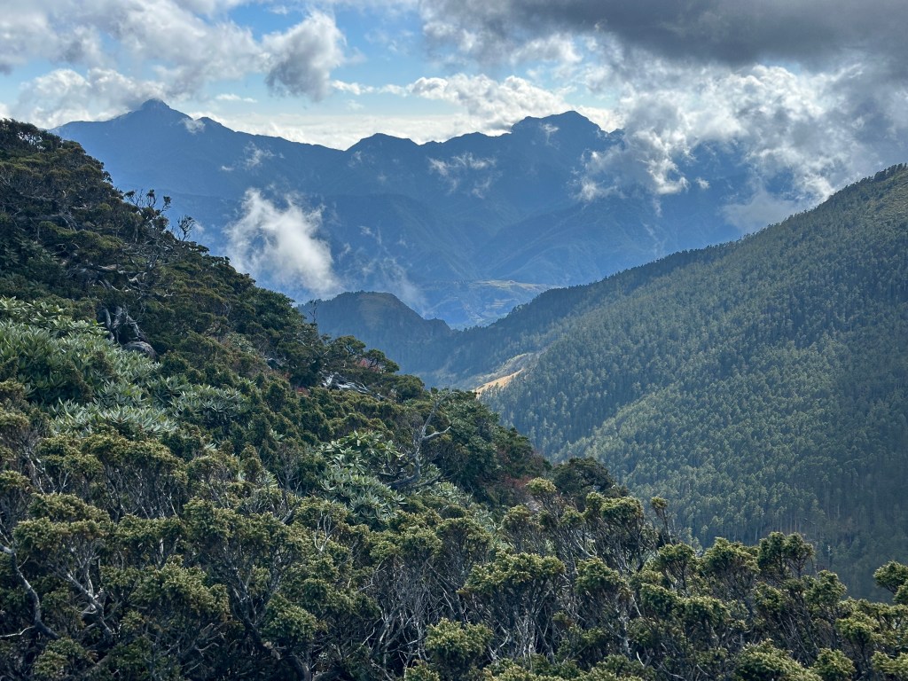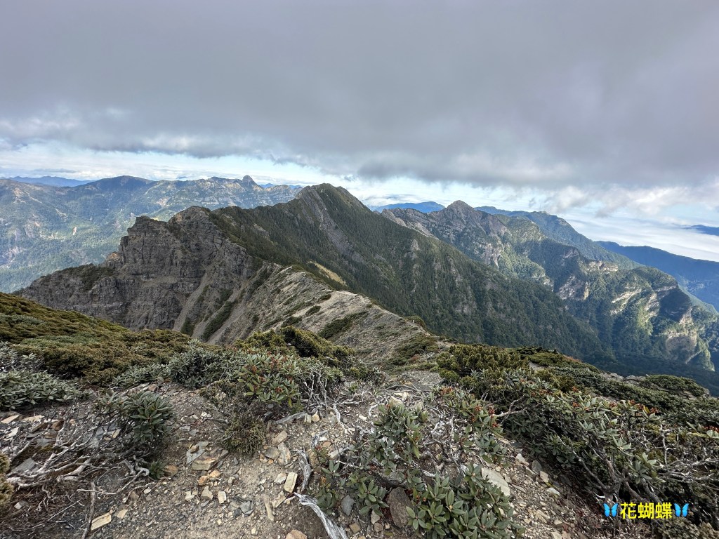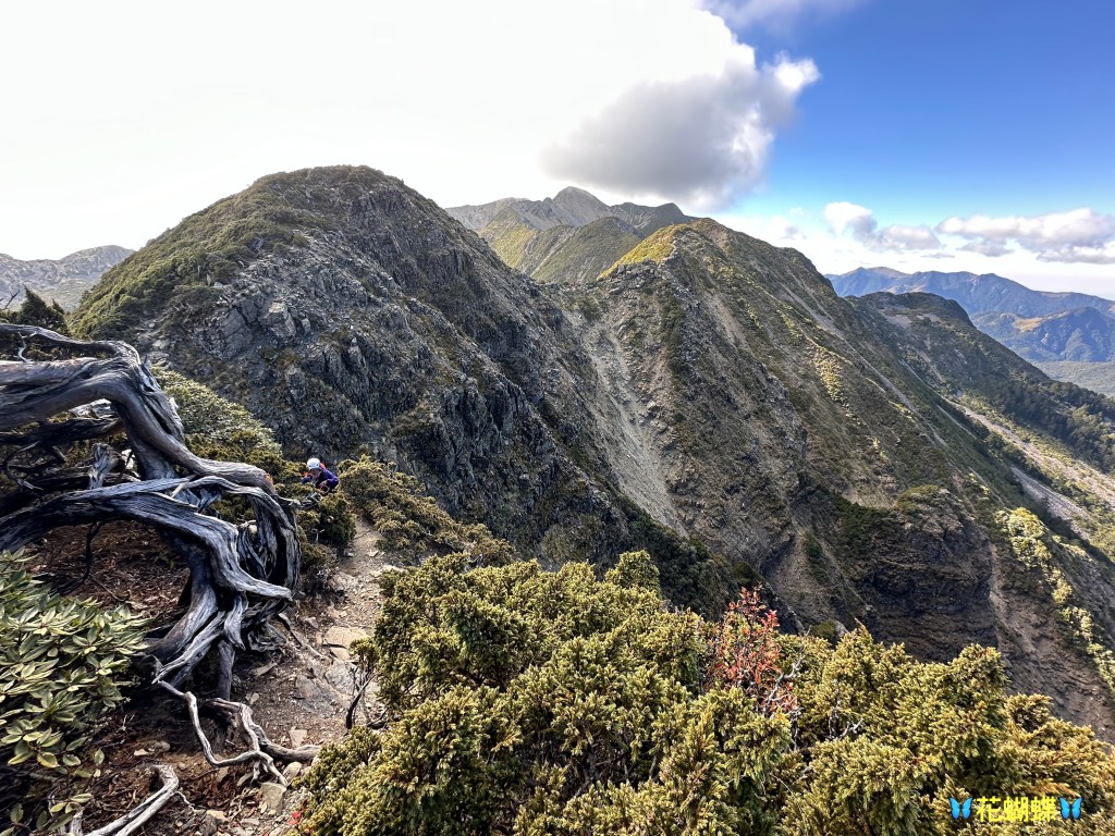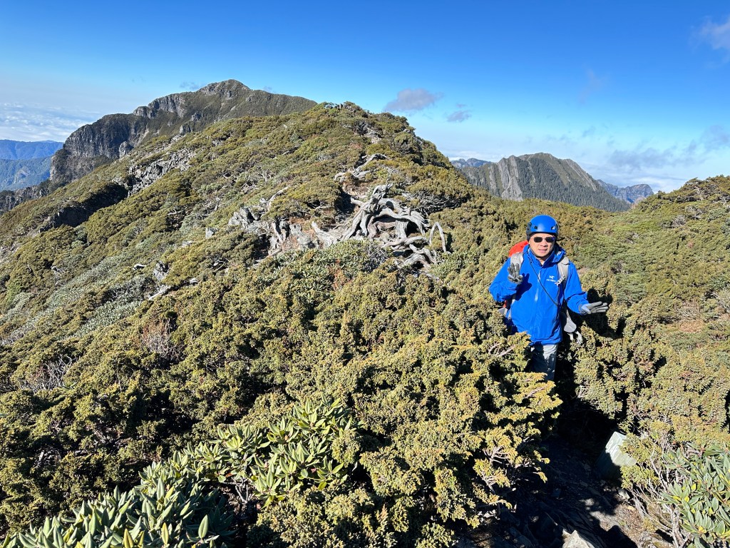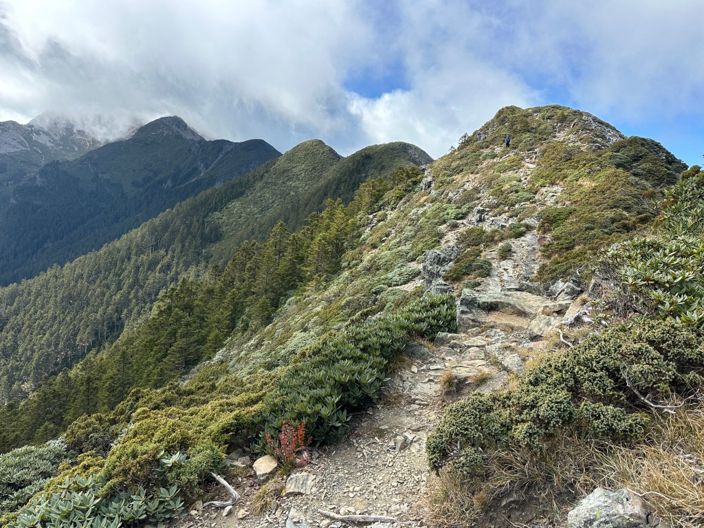 接下來,一路由聖稜線1.9K開始,通過2.1K的凱蘭特崑山北峰,一路享受著眼簾大景,雖然偶爾也雲霧籠罩,但遠眺前方的雪山北峰,也是一會全開起一會全雲霧,這一天的天氣也算不得是大好!
