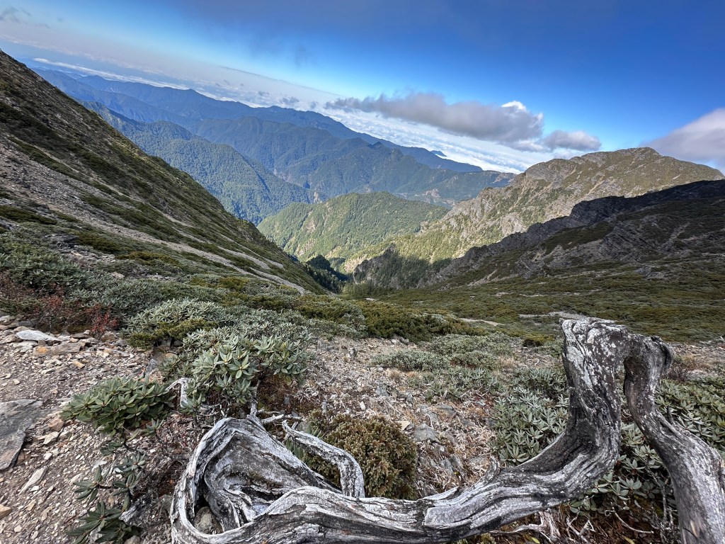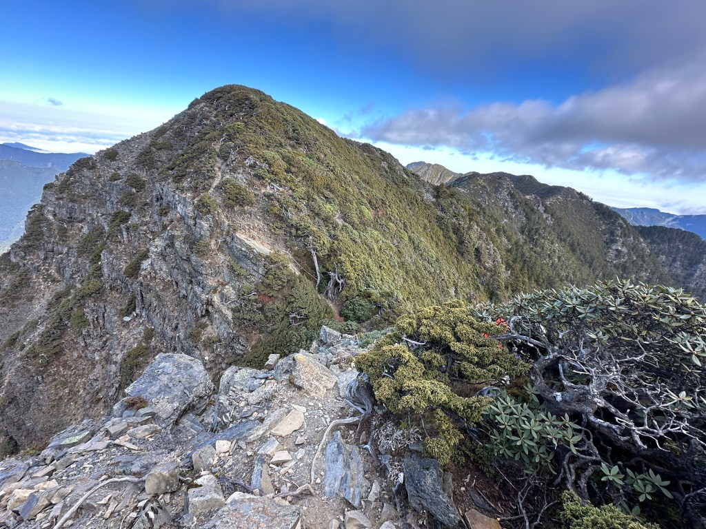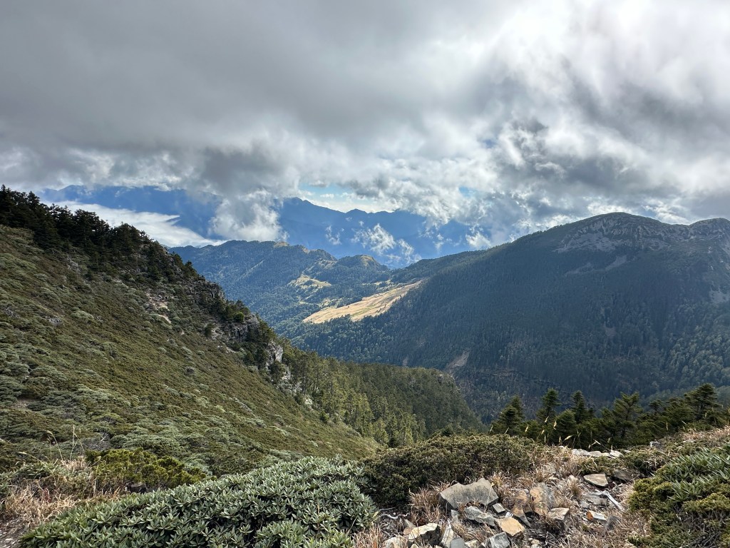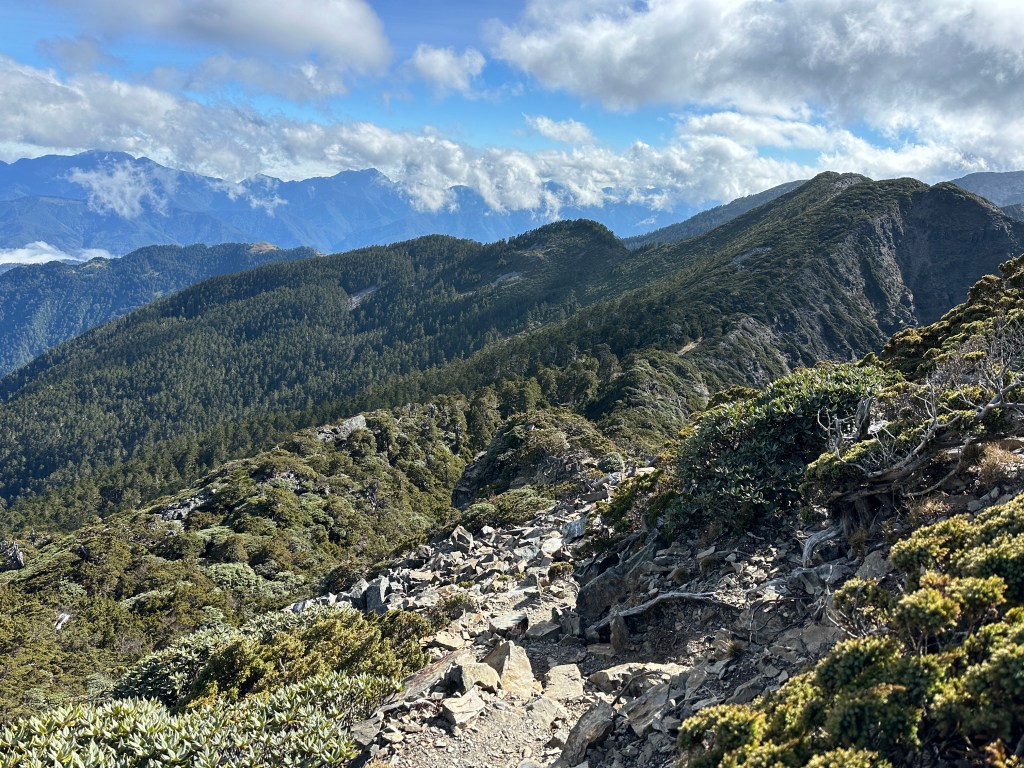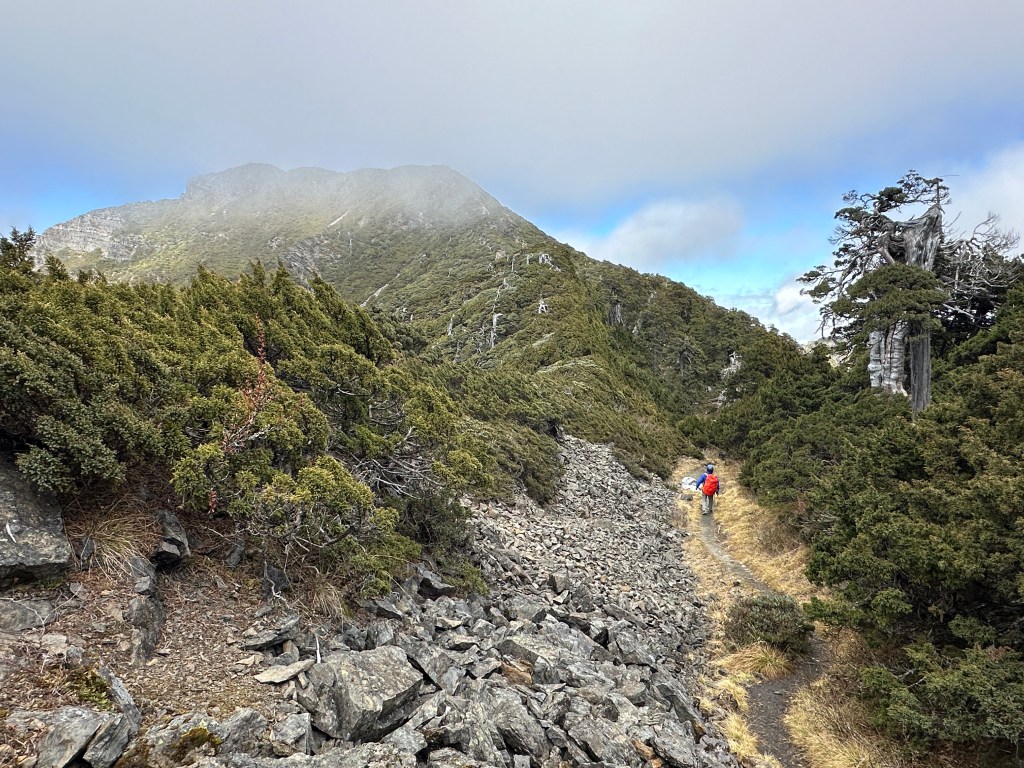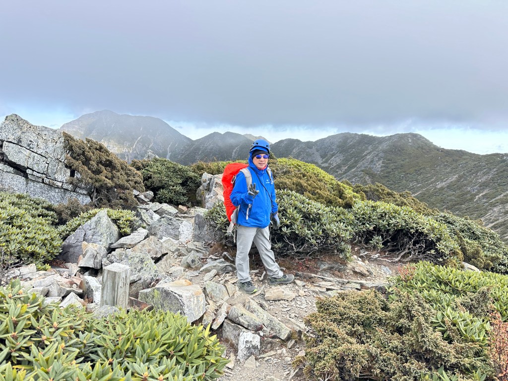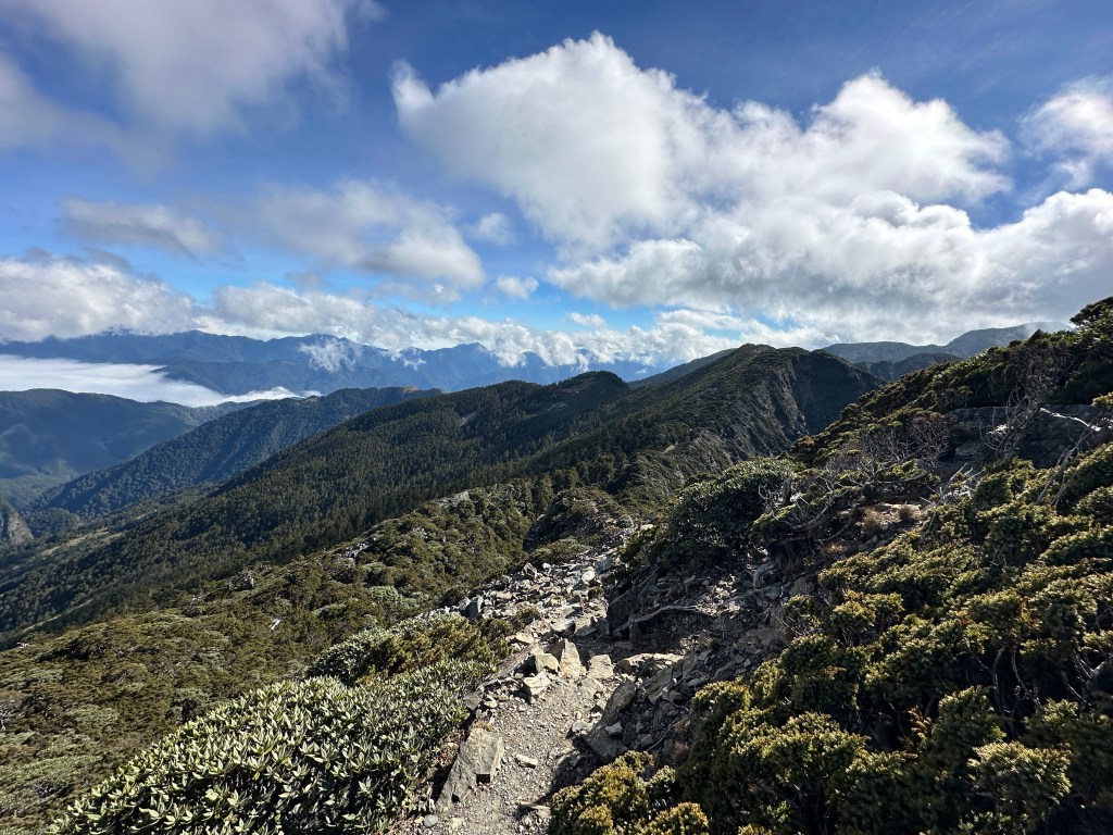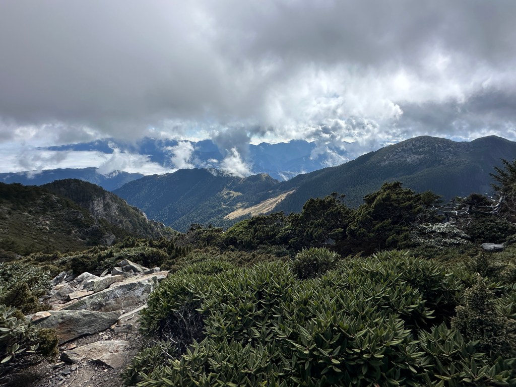 接下來,一路由聖稜線1.9K開始,通過2.1K的凱蘭特崑山北峰,一路享受著眼簾大景,雖然偶爾也雲霧籠罩,但遠眺前方的雪山北峰,也是一會全開起一會全雲霧,這一天的天氣也算不得是大好!