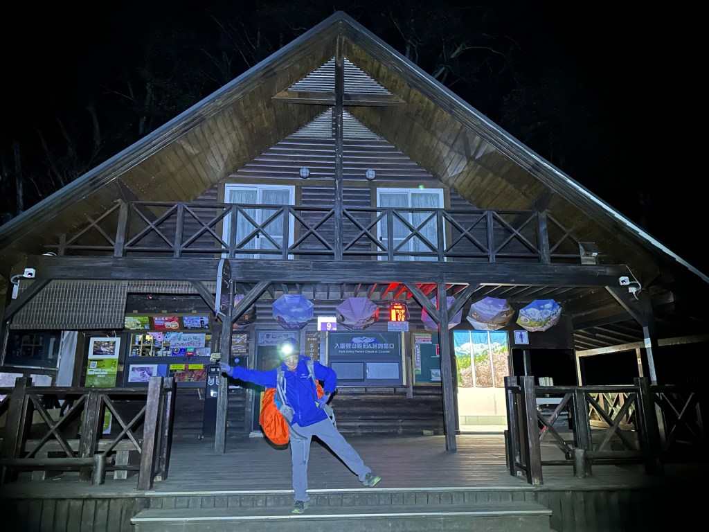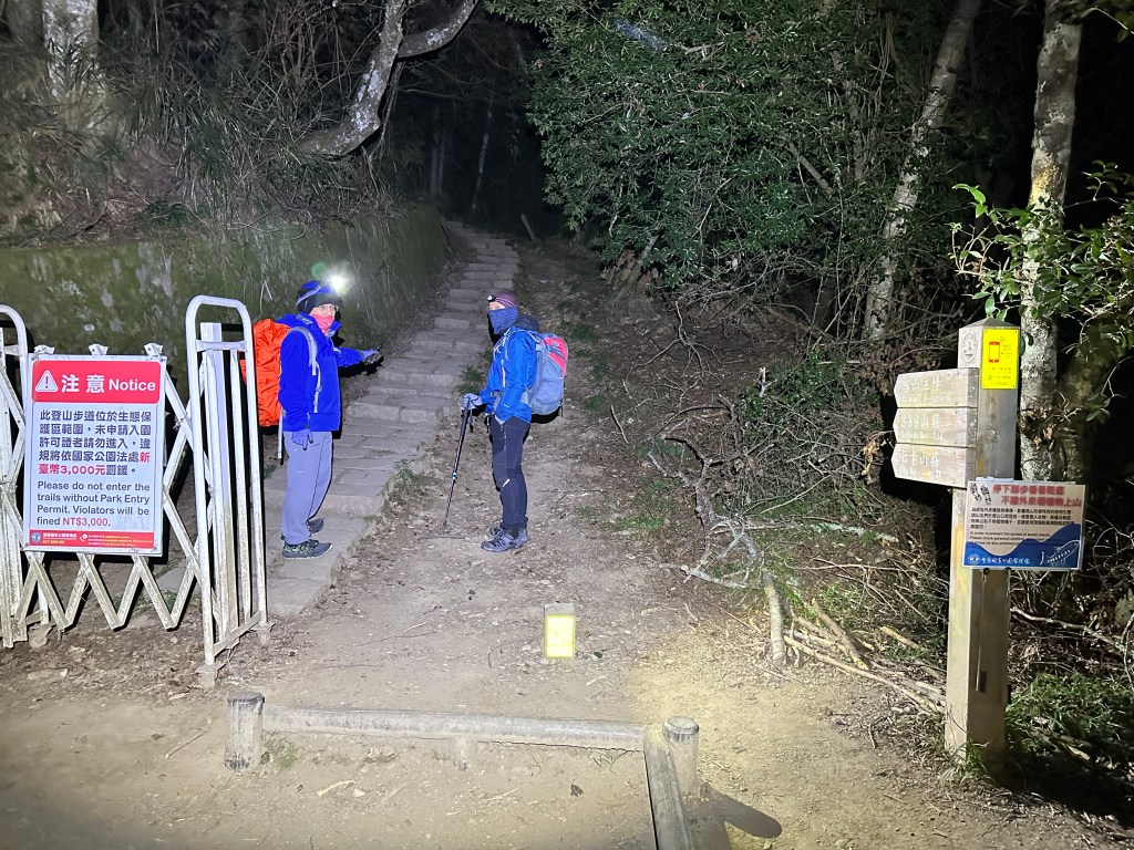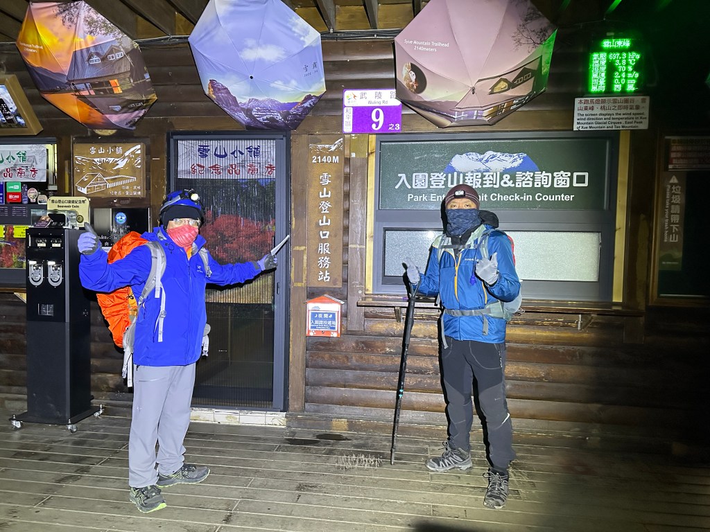 到了晚間約11點,大伙陸續起床,整理好背包,就由接駁大哥由王小明這裡幫我們開車到雪山登山口服務站,也就是山友們常說的大水池登山口,抵達雪山登山口服務站的雪山小舖已經超過12點。三人在此整理裝備,並將入園證投入信箱後在12點半即開展今天的行程。