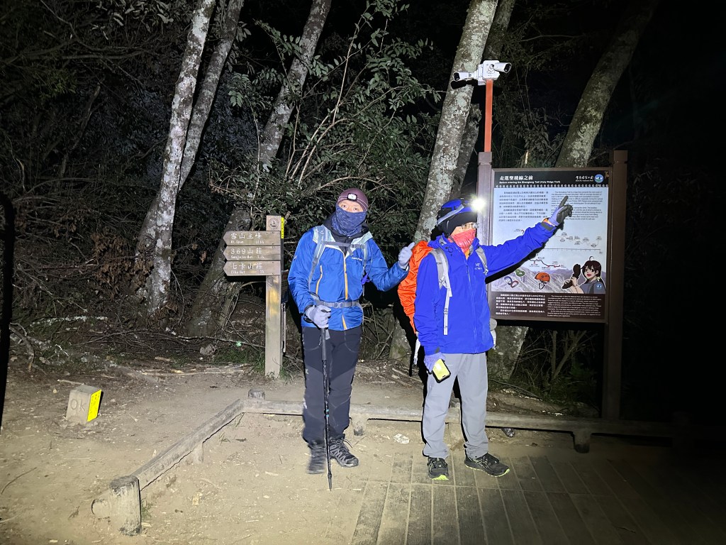 我們為了往返方便,因此採用自行雇用接駁車,前一日上午即由台北開車,抵達王小明時為下午三點多,隨即連接駁大哥也一同進入睡眠,在夜間10點起床整理裝備並進食,在將近11點半由接駁大哥載我們抵達大水池登山口,此時已經超過午夜12點,三人在雪山小舖這裡上完洗手間後隨即啟程。