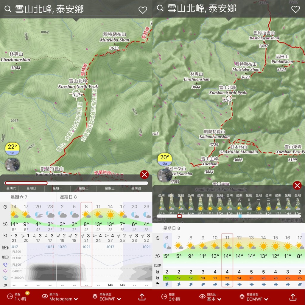 左側是截自免費版的每3小時預報,右側則是截自收費版的每1小時預報。