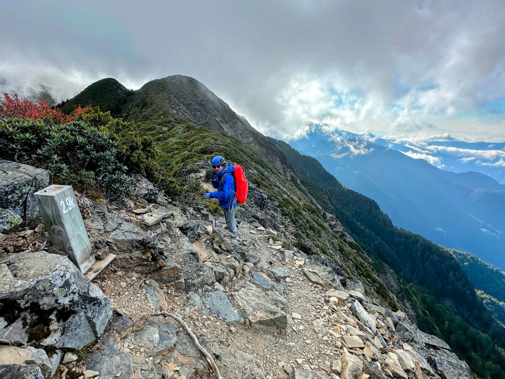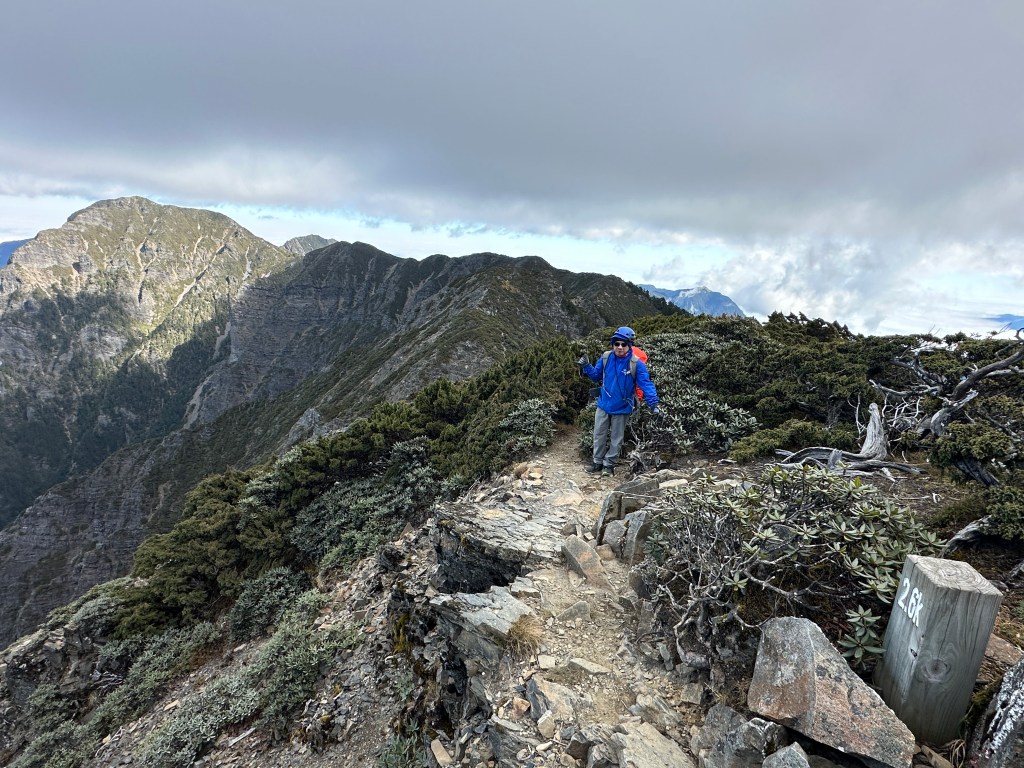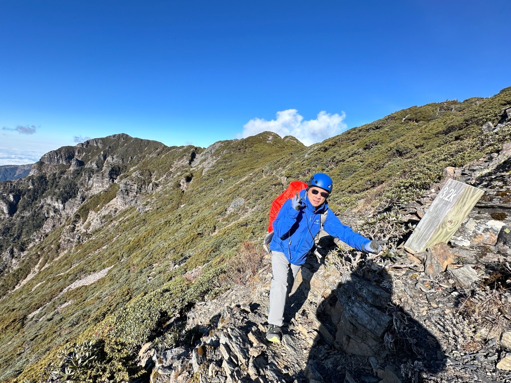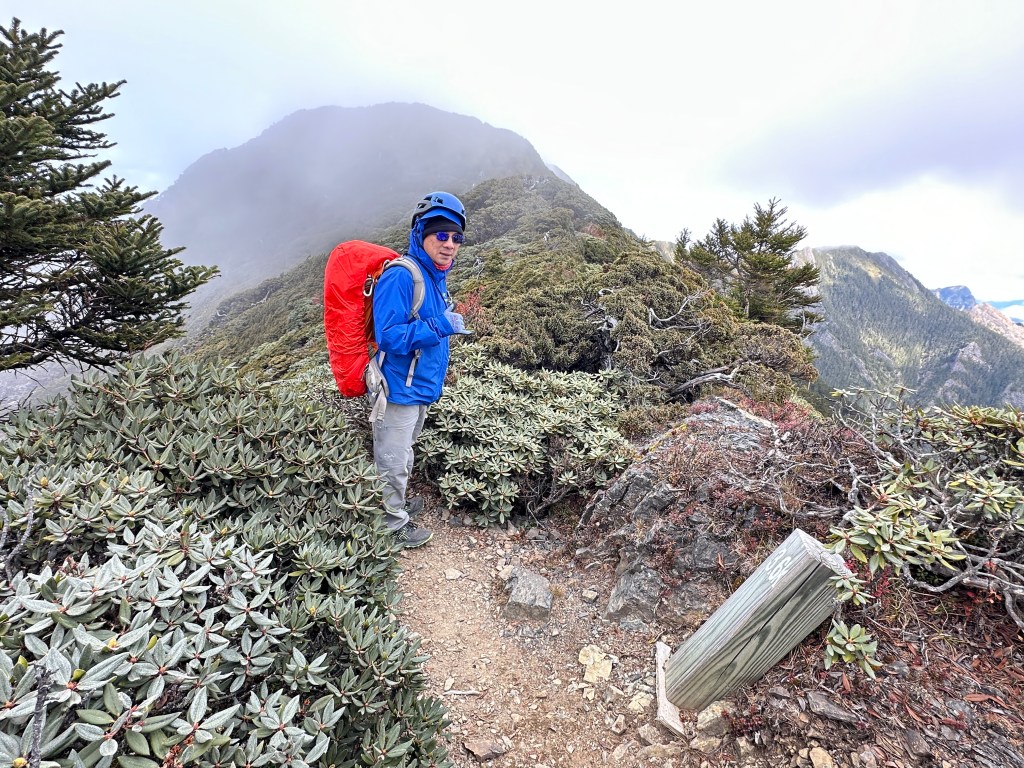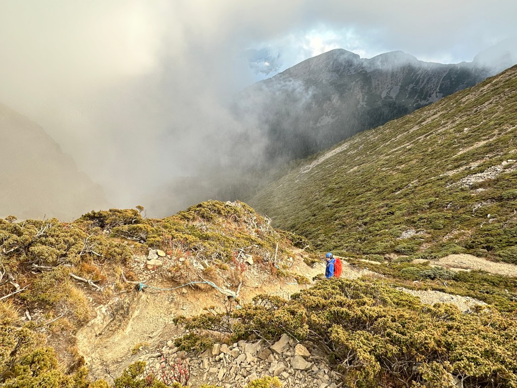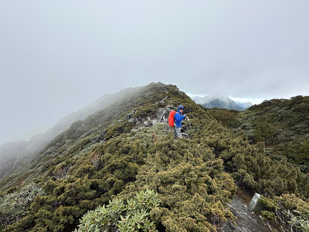 我們三人一路沿著聖稜線向北走,走到2.3K時進入一段稜線腰繞,恰好可以擋住今日的狂風,就看到嘉鴻一人躲在這裡,要我們兩人繼續前進,並說如果他沒有跟上,那他就是先撤退了!因此,Smile與我(Gosen)繼續行程。