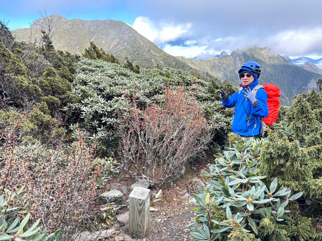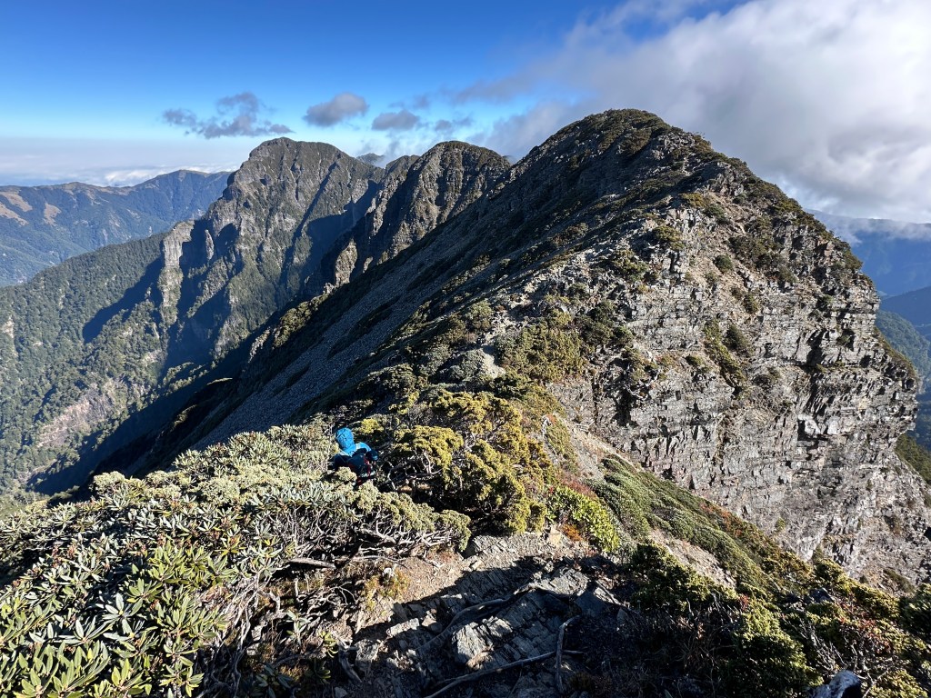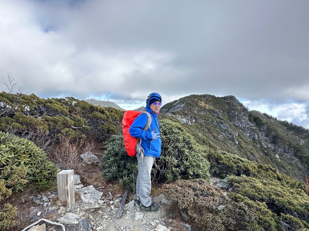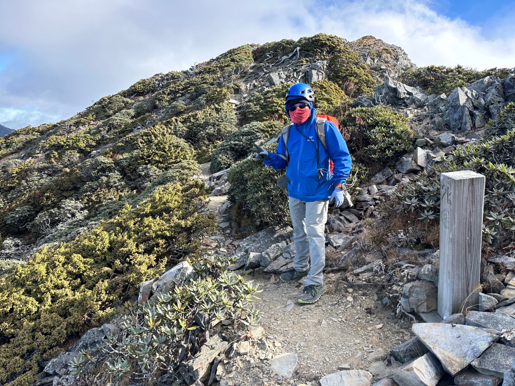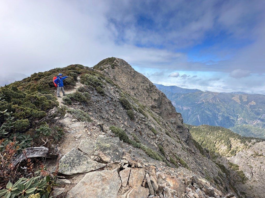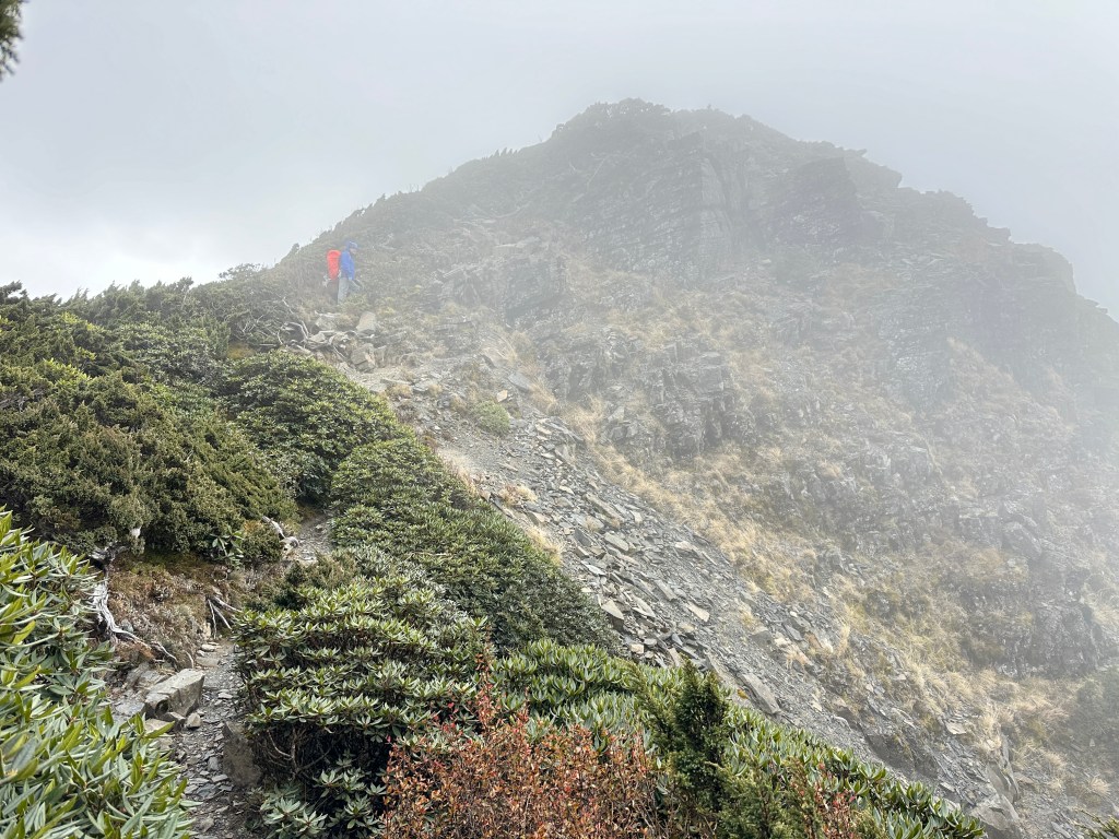 我們三人一路沿著聖稜線向北走,走到2.3K時進入一段稜線腰繞,恰好可以擋住今日的狂風,就看到嘉鴻一人躲在這裡,要我們兩人繼續前進,並說如果他沒有跟上,那他就是先撤退了!因此,Smile與我(Gosen)繼續行程。