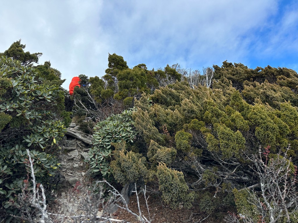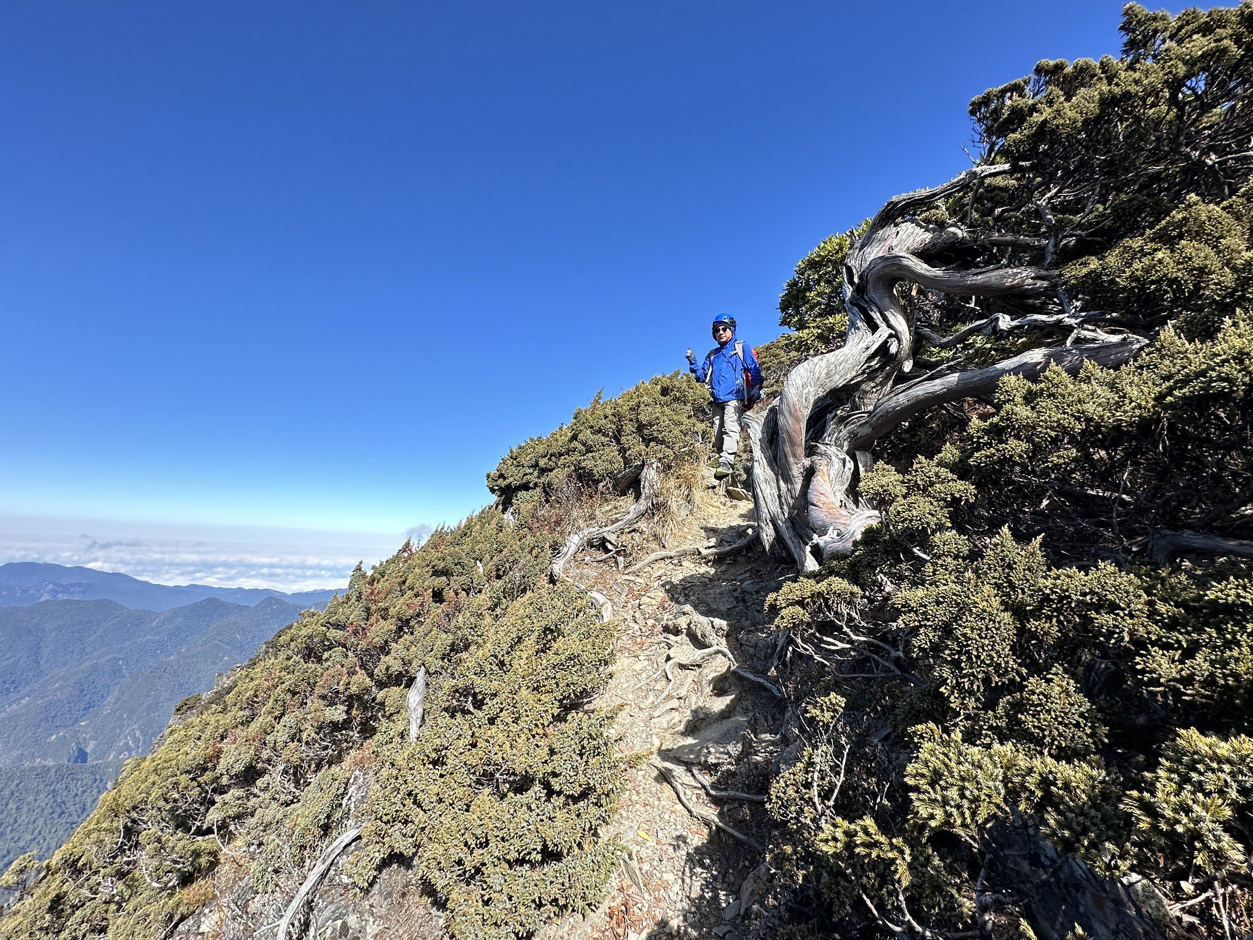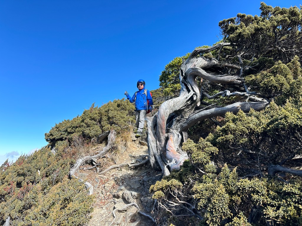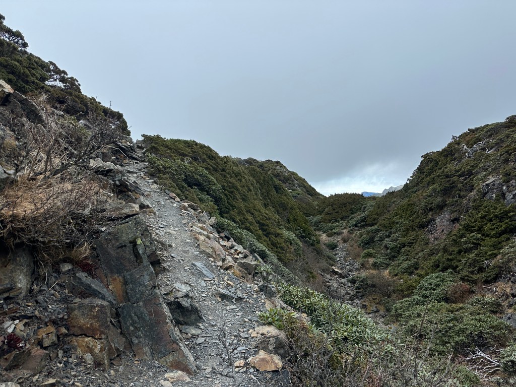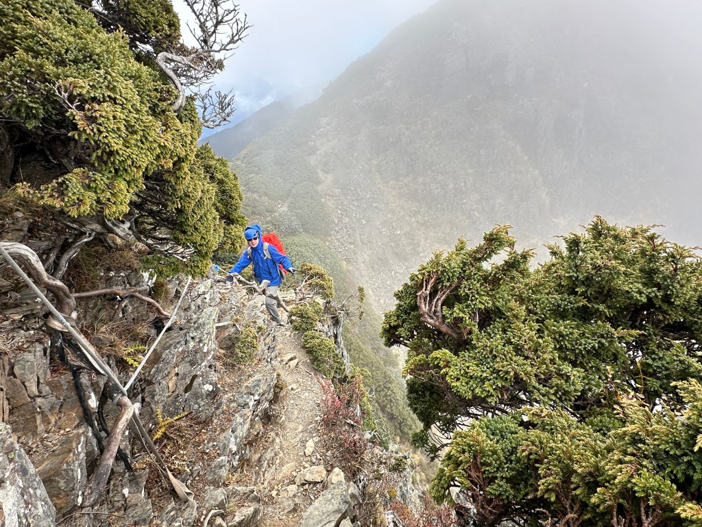 我們三人一路沿著聖稜線向北走,走到2.3K時進入一段稜線腰繞,恰好可以擋住今日的狂風,就看到嘉鴻一人躲在這裡,要我們兩人繼續前進,並說如果他沒有跟上,那他就是先撤退了!因此,Smile與我(Gosen)繼續行程。