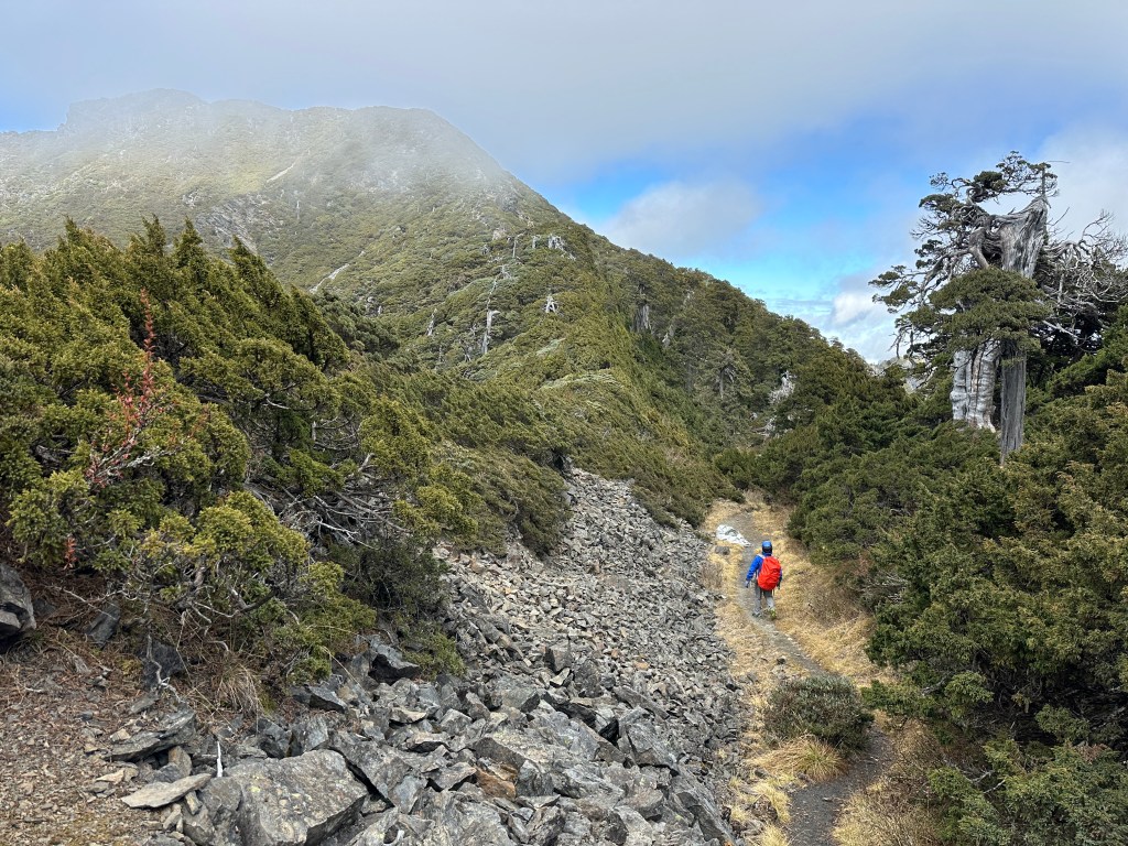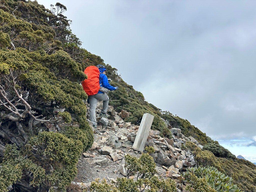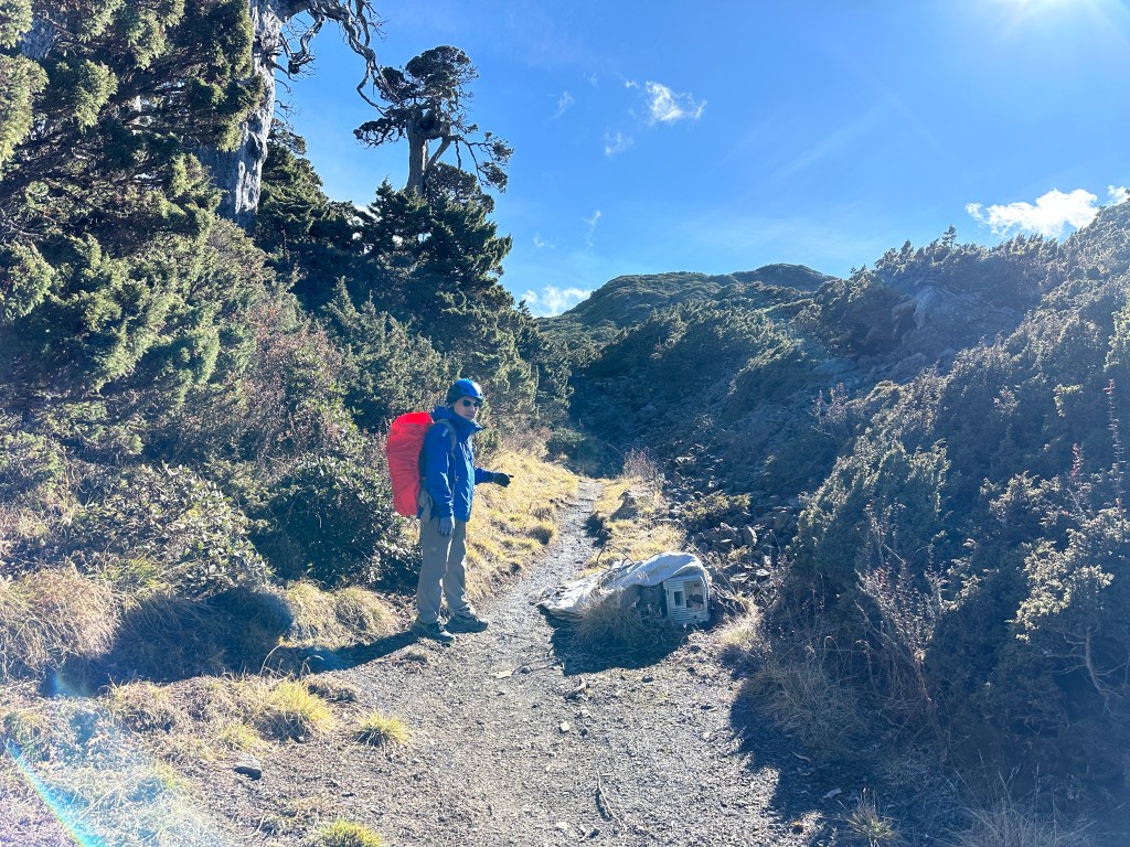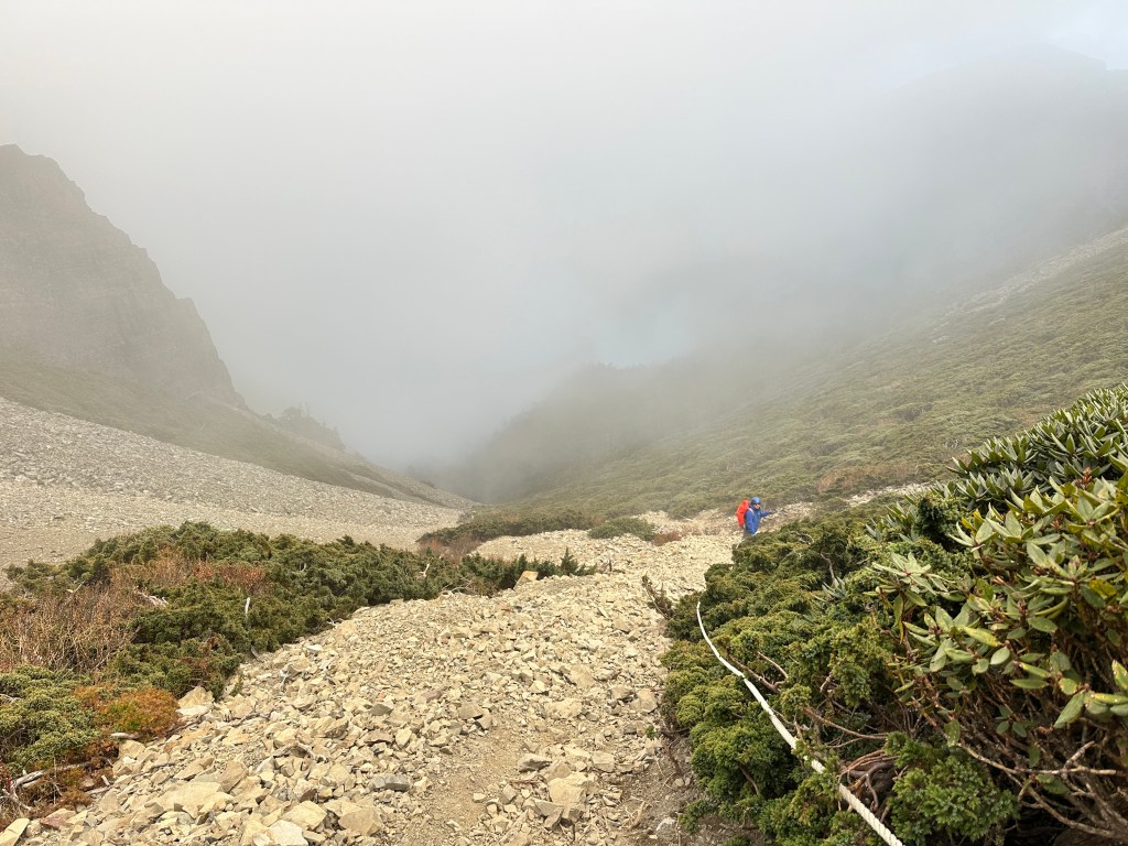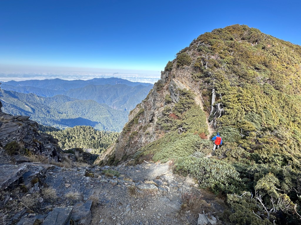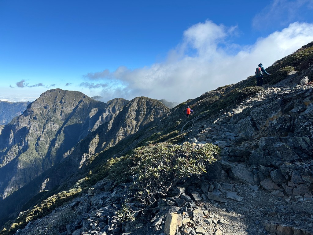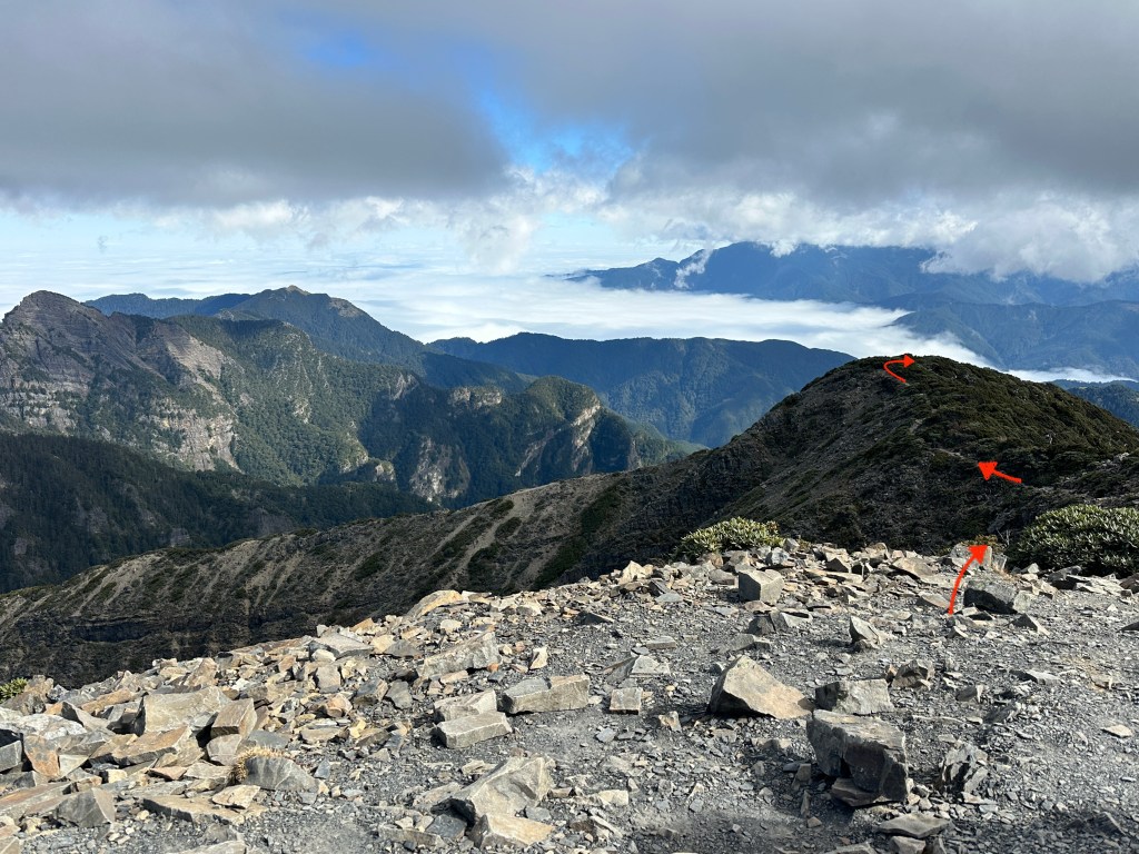 此時雪北山屋內空無一人,Smile與我決定輕裝背一個背包上雪北就好,另一個背包就放置在山屋內。由此到雪北,還需要走約500m,先由4K山屋陡上到4.35K的雪北岔,再走150m的瘦稜來到雪北。這一段的路徑比起聖稜線反而好走很多,抵達雪北前再度遇到先前超越我們的這一對男女,他們也叮嚀我們要控制好時間回程。