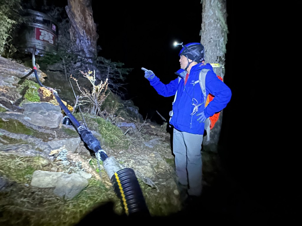接下來,放慢腳步,通過七卡山莊,再一路下山回到大水池登山口,這時已經是夜間11點半。接駁車也等了我們兩人好久好久。沒有想到下到大水池登山口這一段,我的大腿肌肉也開始出現緊繃略疼的現象,只能說,被雪山北峰給操到了!