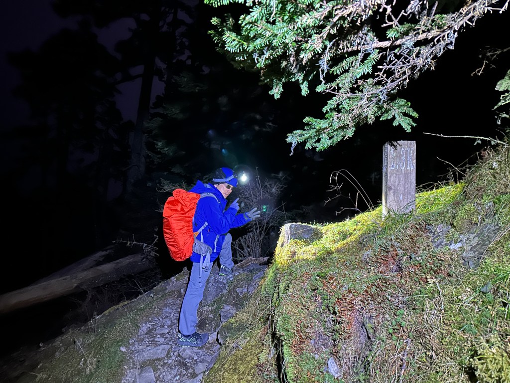 接著,就天色全黑,只要安全也不想趕路了!兩人繼續走到黑森林水源路的1K平台,在此又休息了一下!接著就一路往369臨時營地方向走,在0.25K處出黑森林,由369臨時營地前陡上接回雪山主峰步道,在接近要到東峰前,Smile又喊餓了!身上除了巧克力外行動糧都被她吃光,只好一直灌能量飲!結果下了哭坡後,Smile一直想吐,我想是因為喝了能量飲所導致!