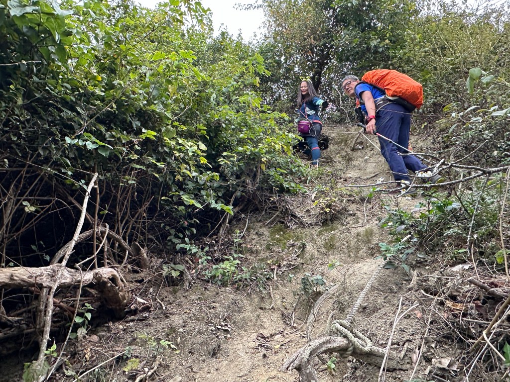 今天整日的行走過程就像雲霄飛車一樣,時陡時降。接著,通過相思台、三索吊橋後,眼前一亮!來到一處筆直而上的光禿驚險瘦稜,Smile說好像是東卯山那一段喔!Jun在上方附和說,應該是像唐麻丹那一段吧?哎!明明我們都在想著同一個畫面,但卻都講錯!我說:是像白毛山登頂前的那一段吧!蛤!
