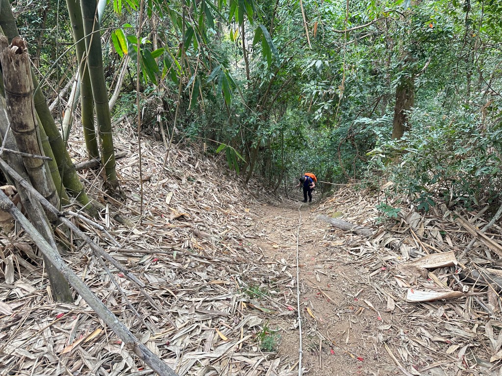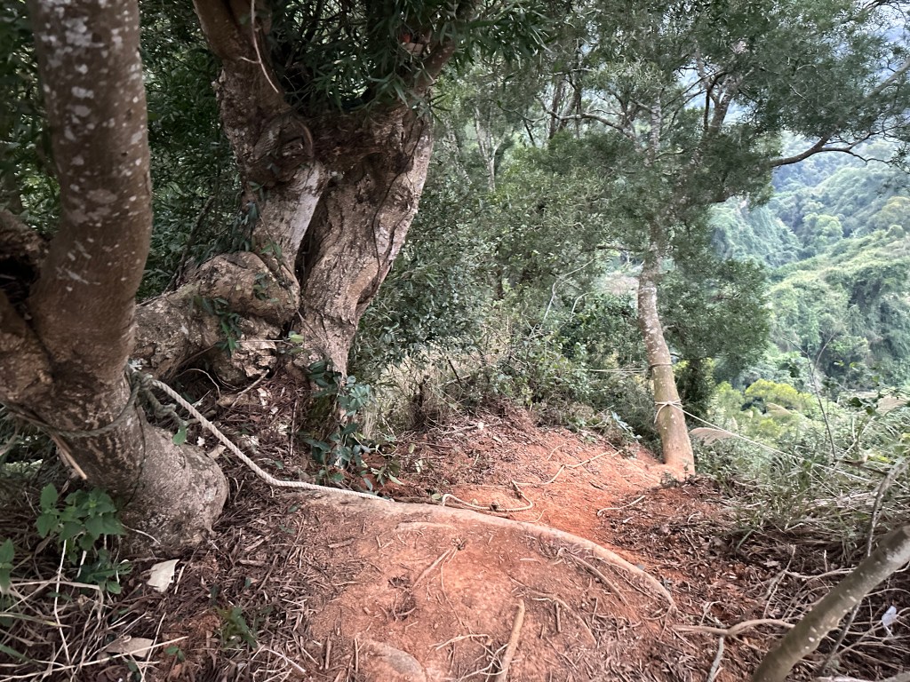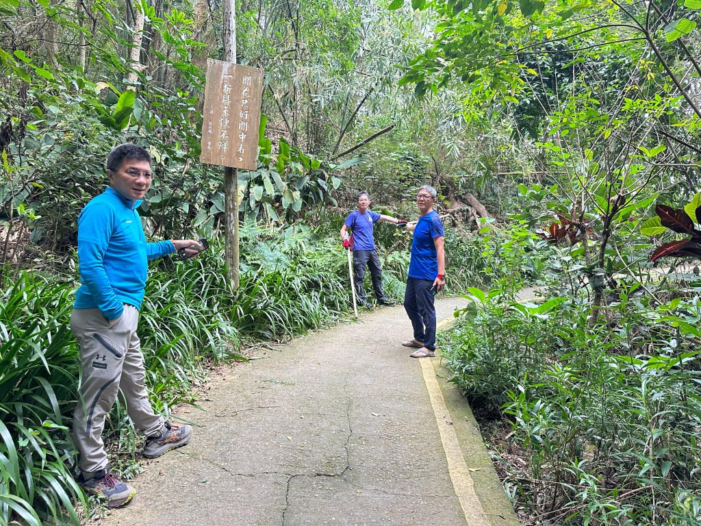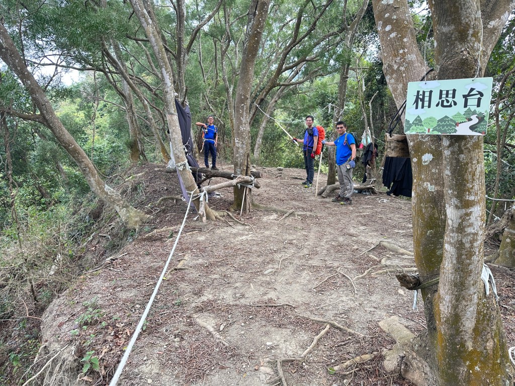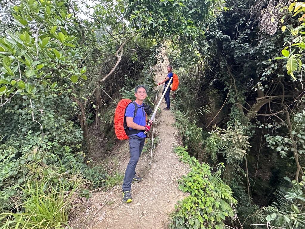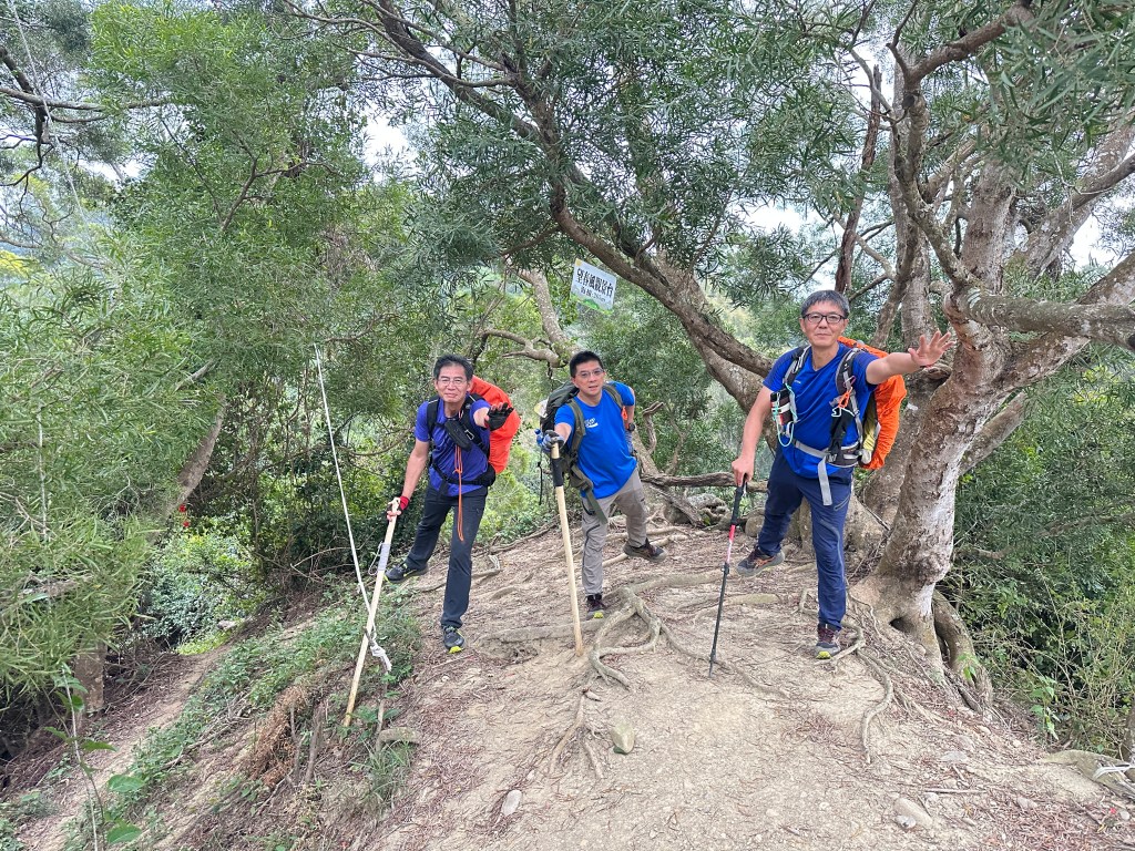 先一路持續陡下接上長青自行車道約在0.15K的岔路,再沿著自行車道走到1.3K處的登山口,右轉陡上去開始沿著東興井仔頭步道走,陡上到經過第一平台、第二平台。在第二平台這裡,看了離線地圖之後,Smile發現我們這整個山區還有一段約300m的路徑沒有連到?還想由此第二平台這裡去補上!我們三位壯丁齊聲反對!因為大小劍還沒有走到啊!這種路徑可不要摸黑吧!