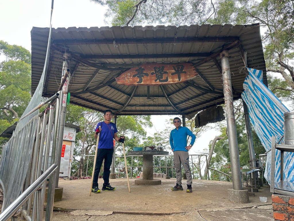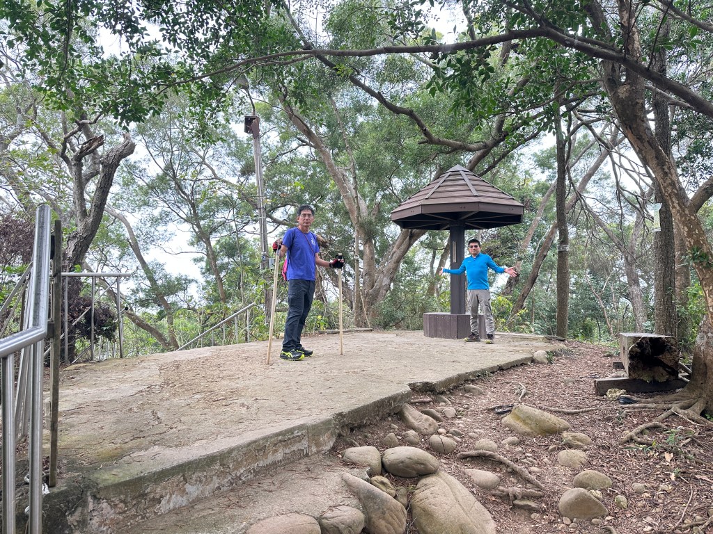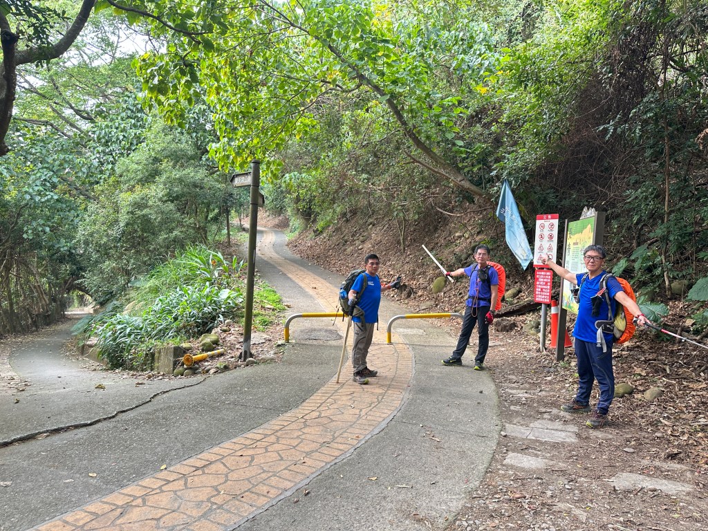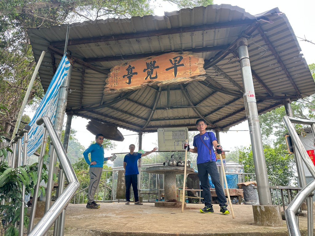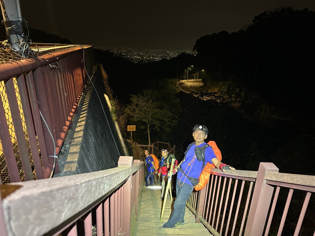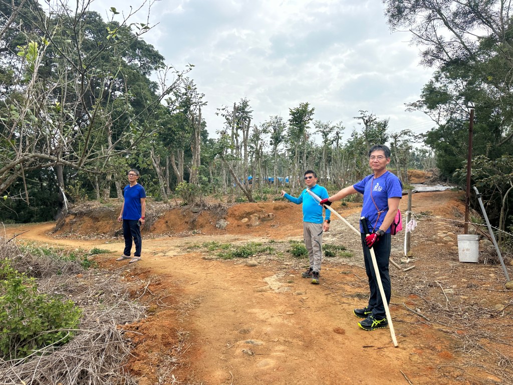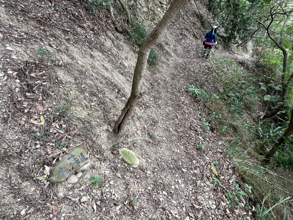 先一路持續陡下接上長青自行車道約在0.15K的岔路,再沿著自行車道走到1.3K處的登山口,右轉陡上去開始沿著東興井仔頭步道走,陡上到經過第一平台、第二平台。在第二平台這裡,看了離線地圖之後,Smile發現我們這整個山區還有一段約300m的路徑沒有連到?還想由此第二平台這裡去補上!我們三位壯丁齊聲反對!因為大小劍還沒有走到啊!這種路徑可不要摸黑吧!