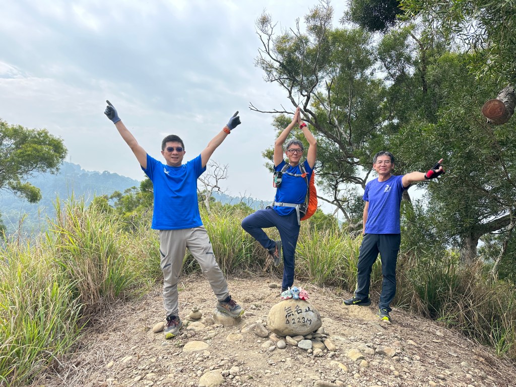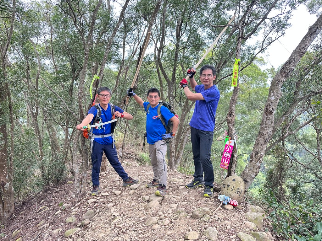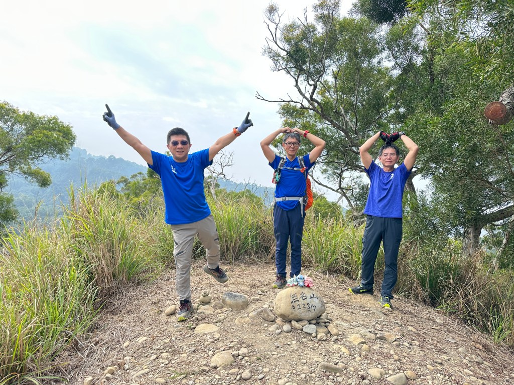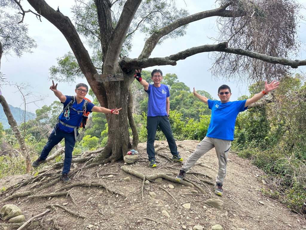 上圖:無名山!今天的第一峰!陡上後到了高處,就在步道的左側。左起:我(Gosen)、Jun、Allen。10:45