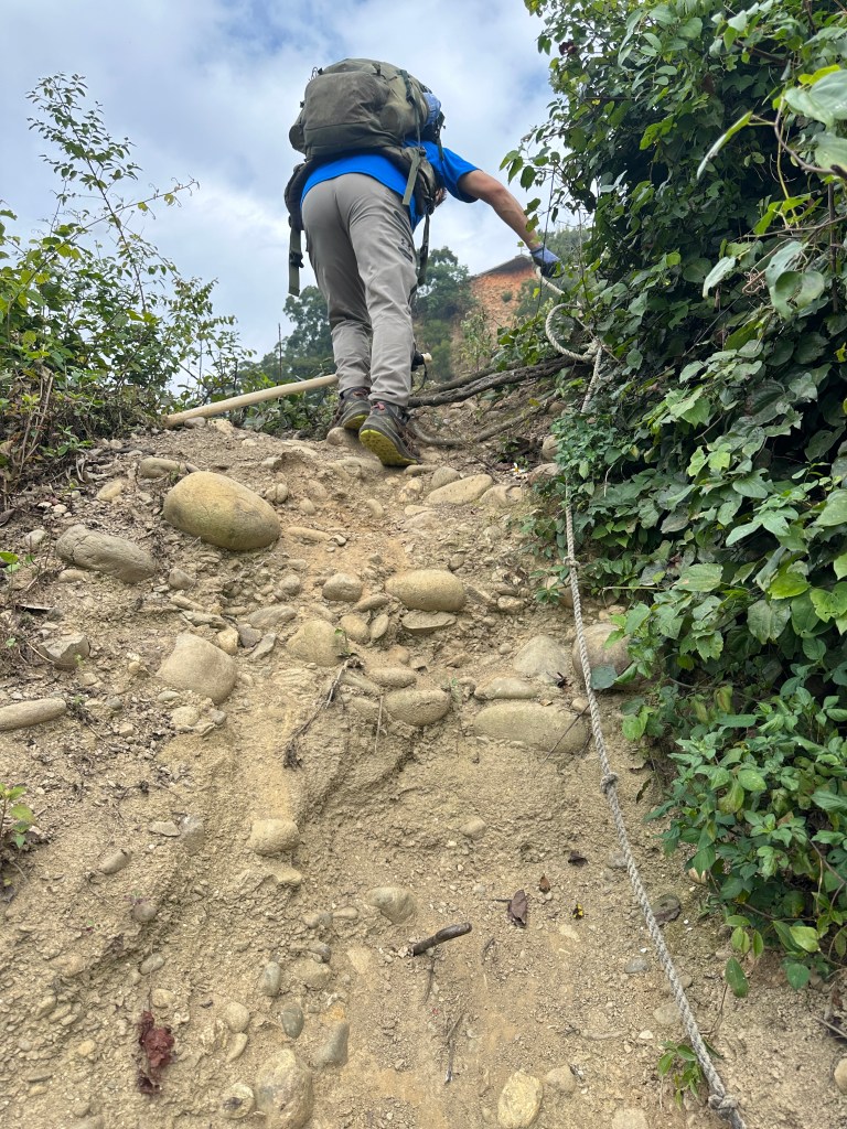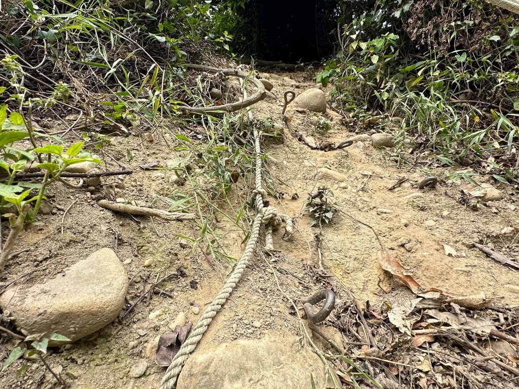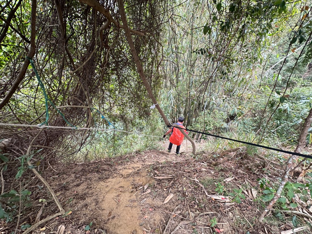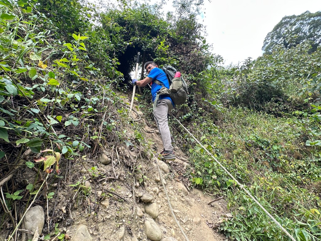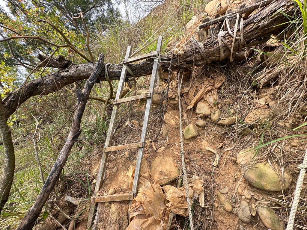 但這一段比起白毛山要危險很多,白毛山登頂前瘦稜兩側有護欄,但這裡可沒有,只有繩子,真要步步為營!通過後,才發現這裡被取名為『好漢坡』!過了好漢坡後接下來的這100m距離裡,要直接垂直陡上接上茶園,也是具有風險性的一段!必須腳步踏好再將繩索拉好,一路拉拔而上!別忘了,兩側都是深谷!