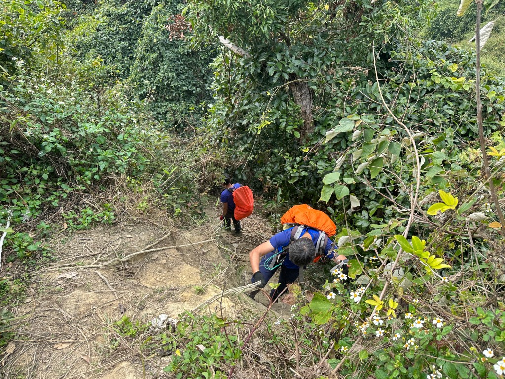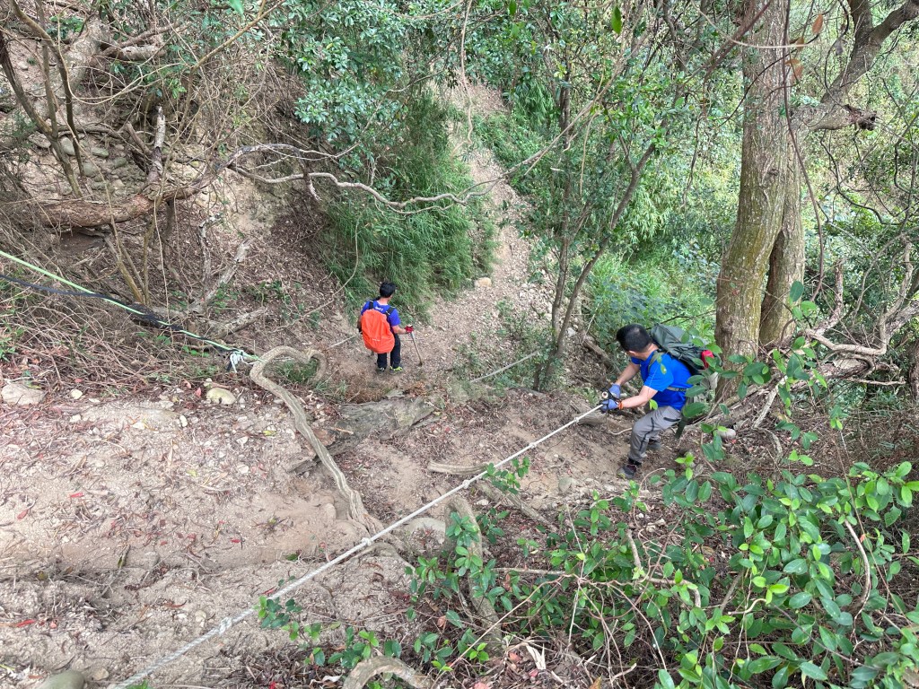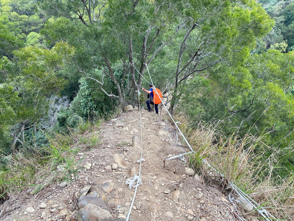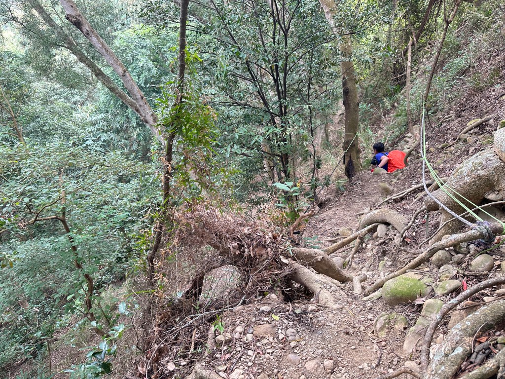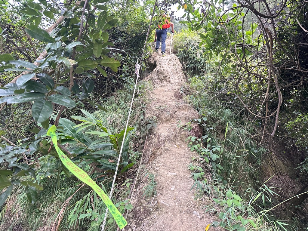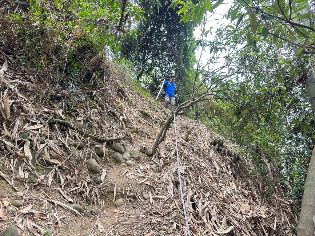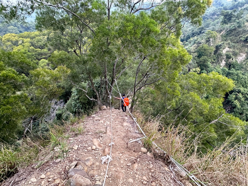 沿著茶園斷崖邊的優美路徑走300m後,來到了茶園頂B點處,直接拉繩幾近垂直下切,再接上瘦稜地形!三人互等在後方慢慢追上我們的Smile。陡上到茶園頂A或現在由茶園頂B陡下的過程中,某些危險處,都有釘上圓頭鐵條以方便陡上下的踩踏!