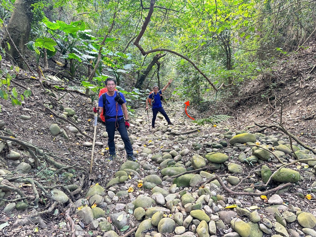 但是部份的鐵條是會略微晃動的,踩踏前最好兩段式踩踏,接著會經過一段約有250m長度的鵝卵石步道,緊接著一路陡上,就會再度接上猴板凳!要注意的是,這個過程會經過兩次的三岔路,我在離線地圖上分別標示為三岔路a及三岔路b。這時已經是下午2點40分。