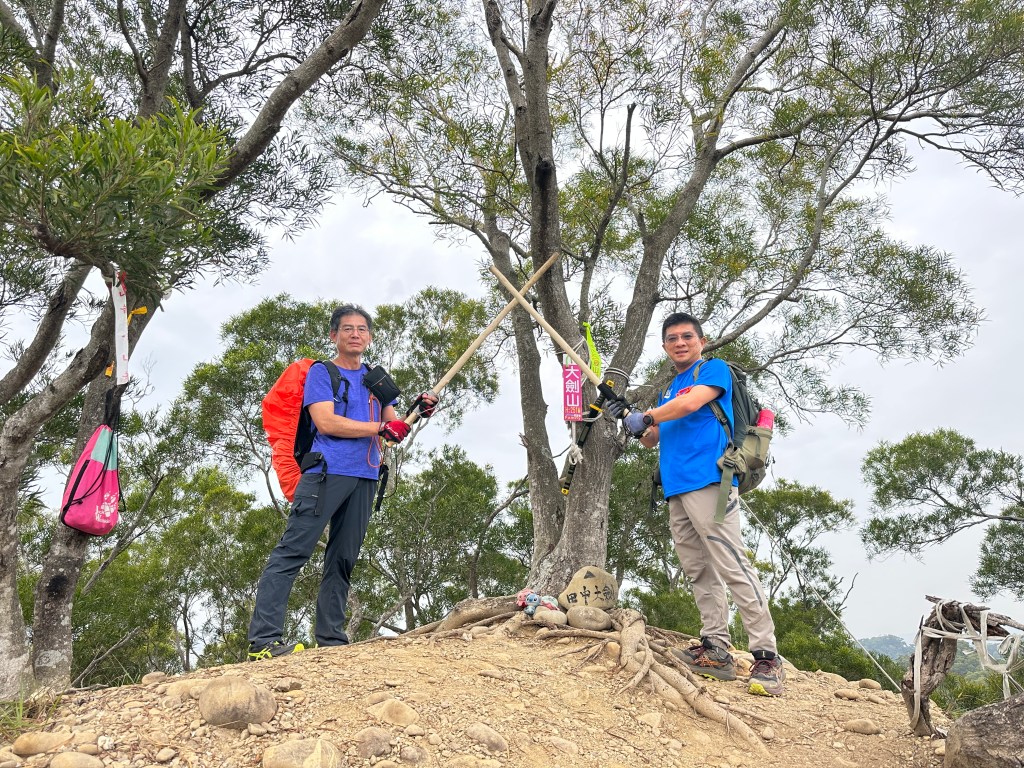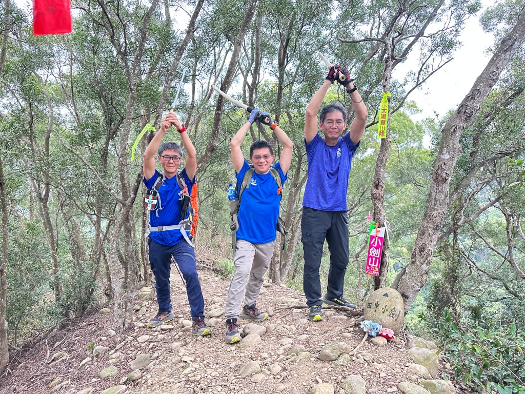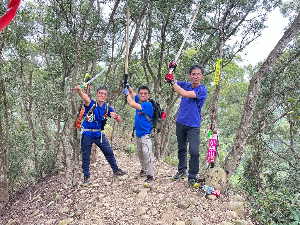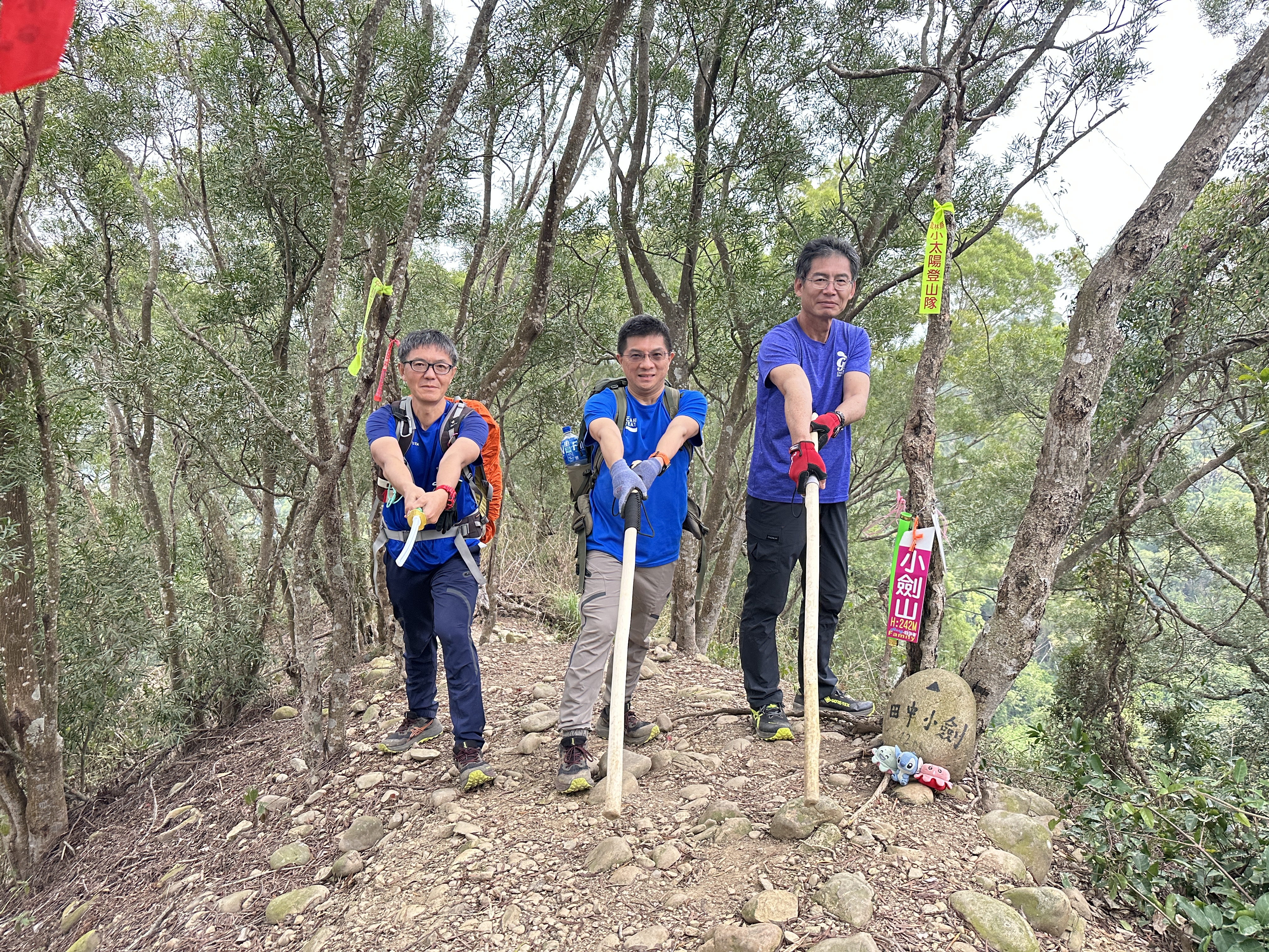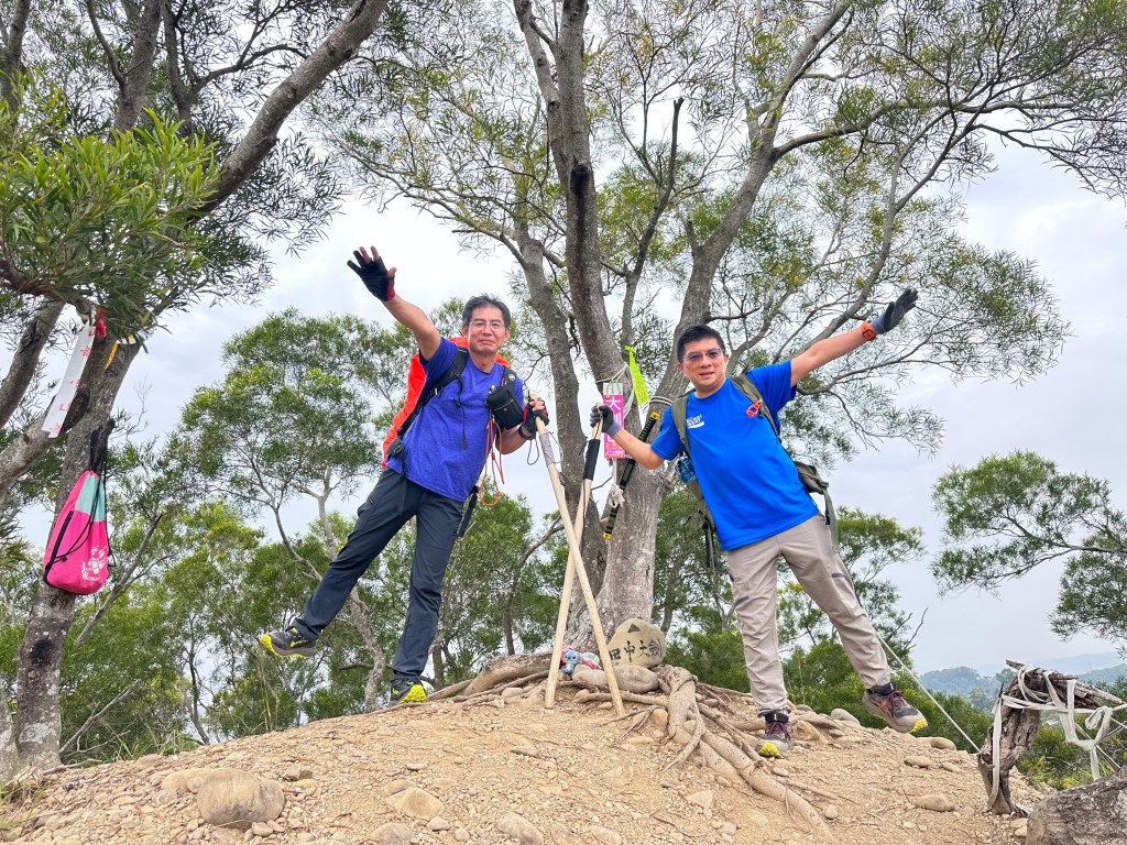 大劍山的前後瘦稜都看起來都很驚險,山頭腹地也很小!Allen與我(Gosen)拿著由Allen所製作看起來像是劍的登山杖揮舞一番!接著,續走到小劍山,腹地大了一些,這時已經是下午4點54分。緊接著通過老胡休息站、望春風觀景台,再經過最後要接上茶園頂C的垂直陡上段,這一段也是讓人有驚心動魄感受的一段。