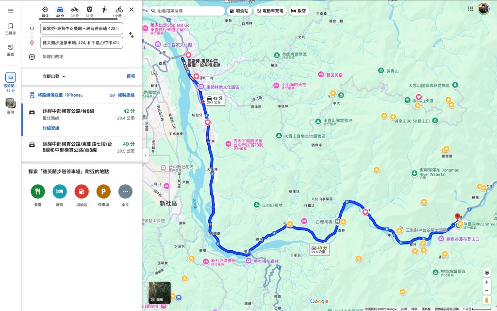 請朋友們直接利用Google地圖導航至德芙蘭步道停車場,我由東勢鎮的麥當勞-東勢中正餐廳導航到德芙蘭步道停車場,或可以點按下圖就可以直接進入Google導航地圖裡。這樣可以方便朋友們直接導航到德芙蘭步道停車場。